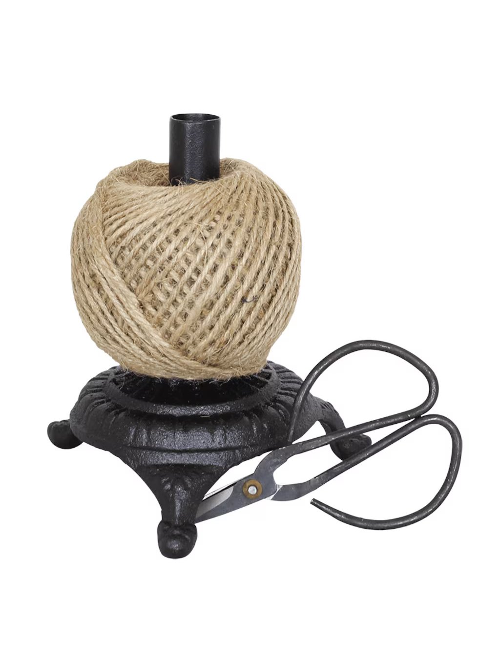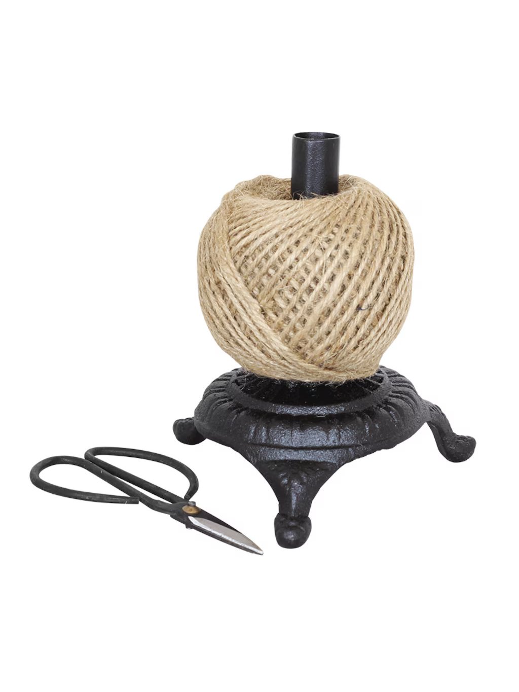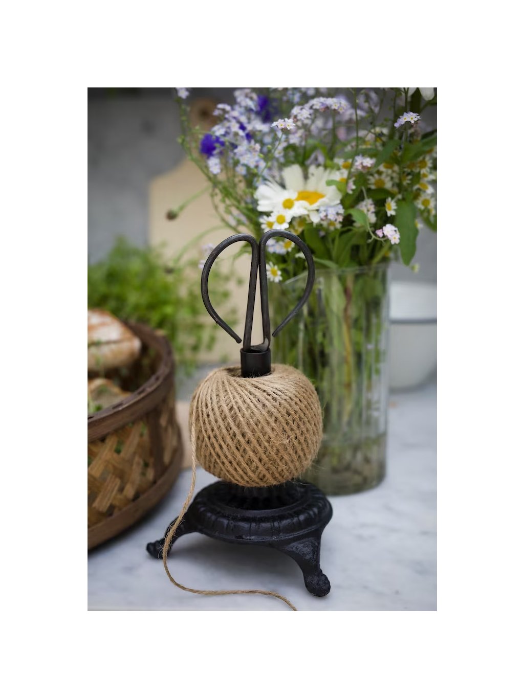 Ozdobný držiak na špagáty a stuhy z liatiny. Súčasťou balenia je aj jutový špagát a malé nožnice.