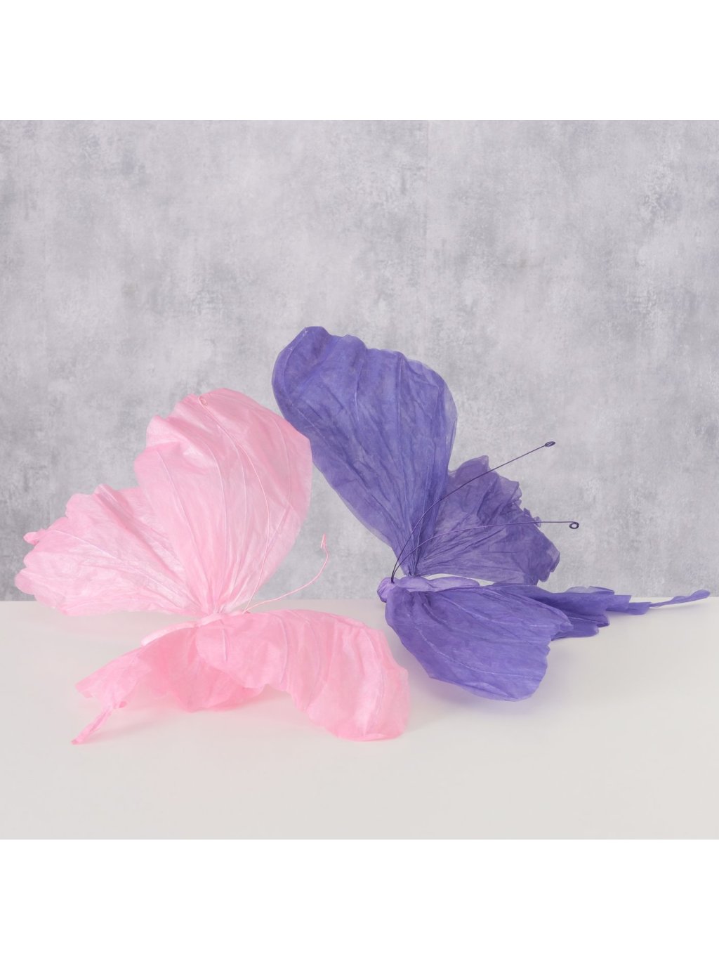 Motýľ je ručne vyrábaný a jeho krídla z ľahkého papiera vytvárajú prirodzený, vzdušný efekt. Praktický klip umožňuje jednoduché pripevnenie na vetvičky, vence, závesy či rôzne aranžmány. S veľkosťou približne 35cm ide o výraznú dekoráciu, ktorá okamžite pritiahne pohľad. Dostupný je v jemnej ružovej alebo fialovej farbe, ktoré krásne doplnia jarné a veľkonočné dekorácie.