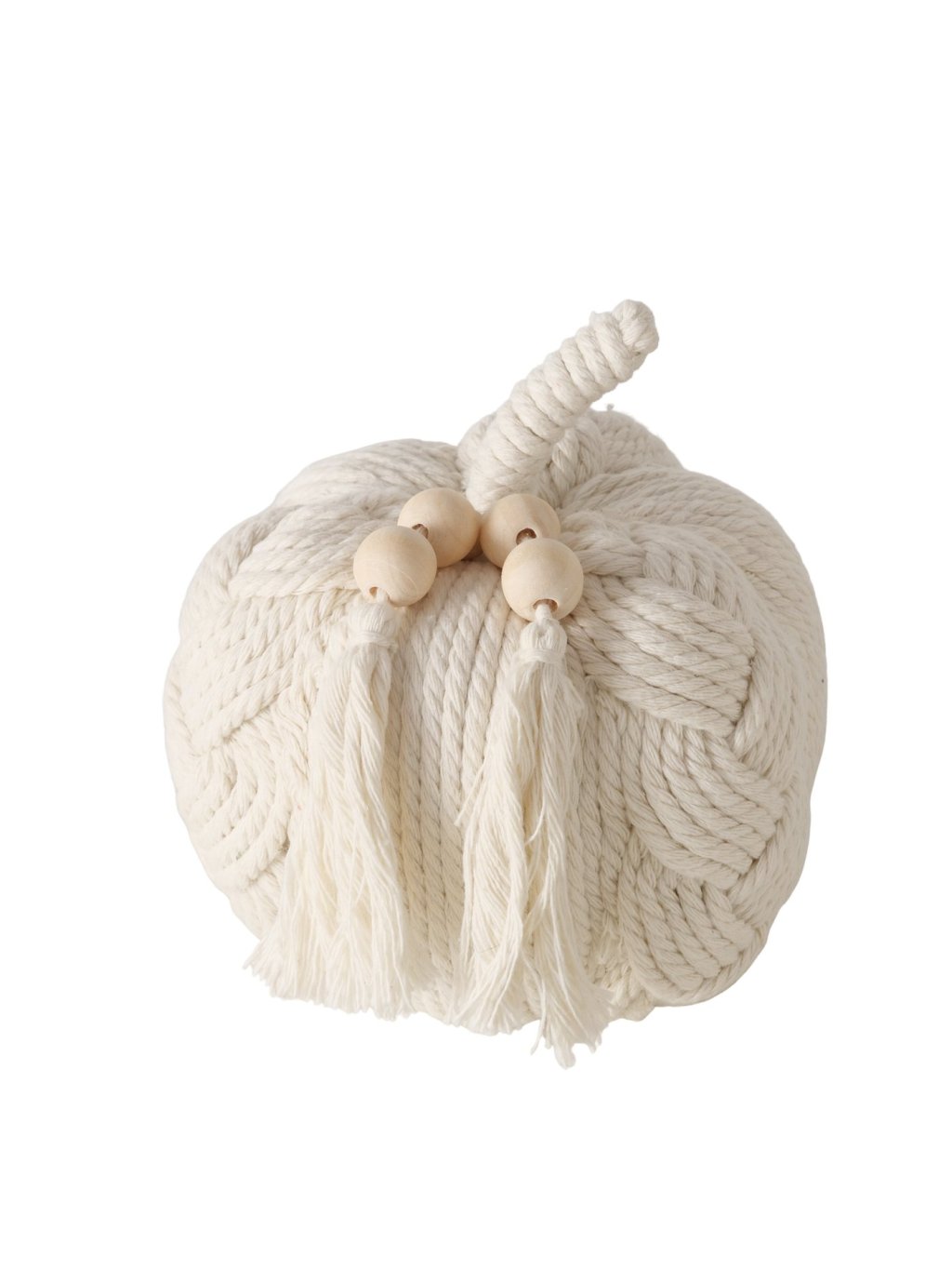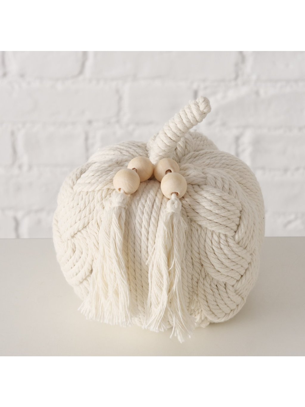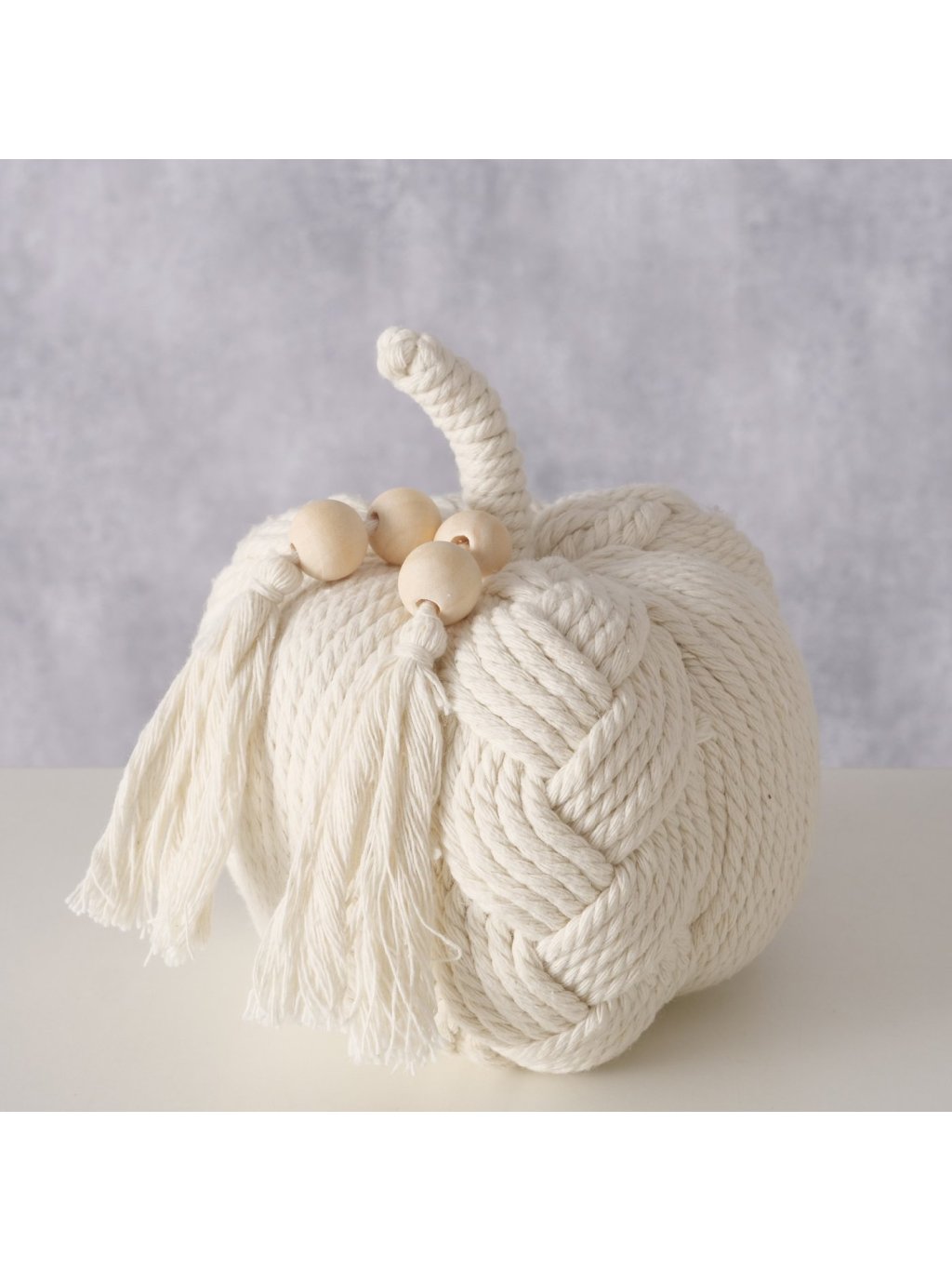 Tekvica je vyrobená z kombinácie polystyrénového jadra, bavlny a polyesteru, doplnená o drevené koráliky a strapce. Tento mix materiálov pôsobí originálne a dodáva dekorácii hrejivý charakter. Rozmery (výška 14cm, priemer 13,5cm) sú ideálne na to, aby sa stala výrazným, no stále decentným doplnkom na stole, polici či komode. Svetlý odtieň krémovej farby sa hodí do moderných, škandinávskych aj rustikálnych interiérov a skvele ladí so sviečkami či prírodnými aranžmánmi.