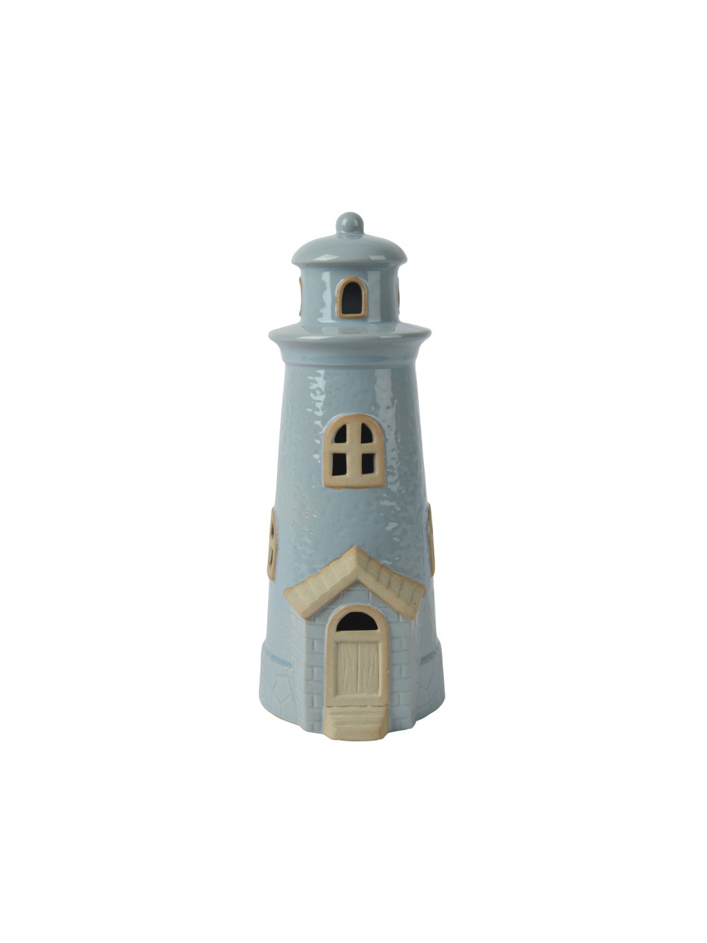 Maják je vyrobený z porcelánu a má lesklý povrch, ktorý krásne odráža svetlo. Svetlomodrý odtieň dopĺňajú béžové detaily okien a dverí, vďaka čomu pôsobí mäkko a prirodzene. Je ručne spracovaný, takže každý kus má drobné odlišnosti, ktoré mu dodávajú osobitý charakter. S výškou približne 27cm vynikne na komode, polici aj v otvorenej knižnici. Hodí sa do námorného, vidieckeho aj klasického interiéru.