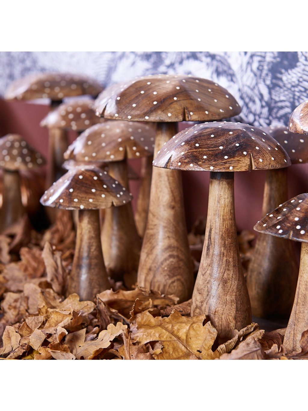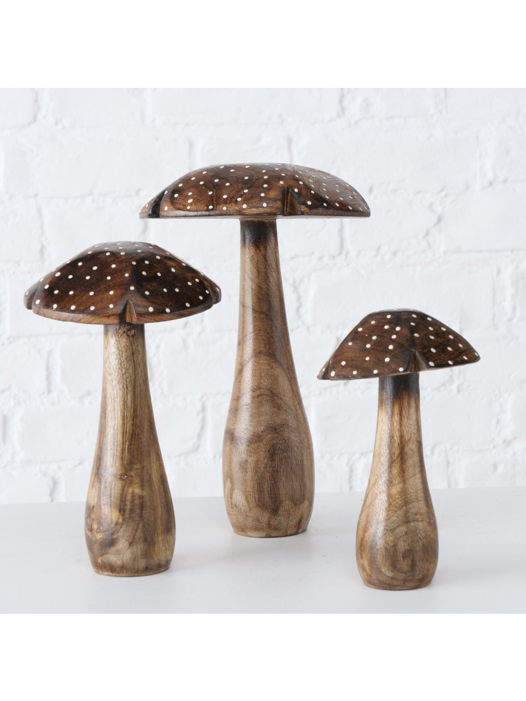 Tri rôzne veľké drevené hríby Herno vytvárajú dokonalý prírodný set, ktorý pôsobí harmonicky a hravo. V interiéri navodia útulnú atmosféru a pripomenú krásu lesných detailov.