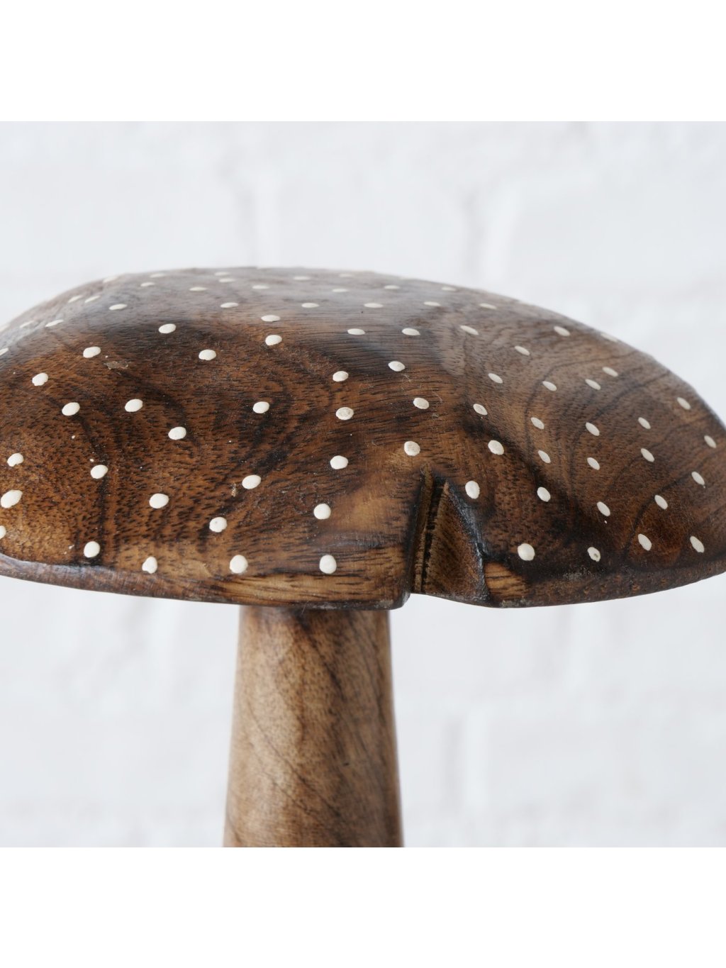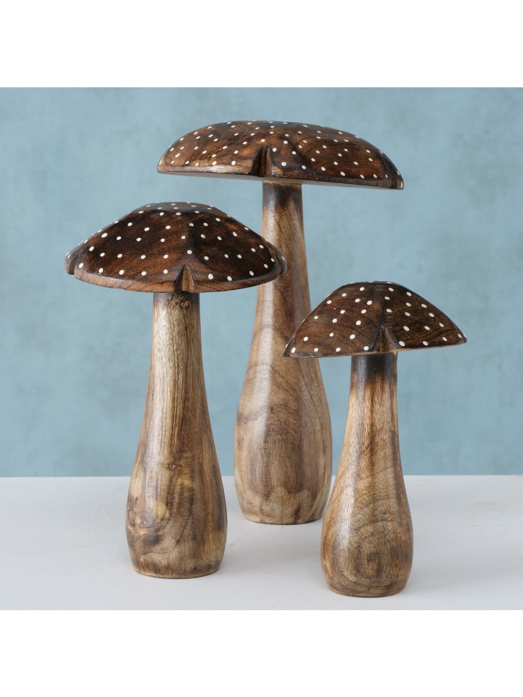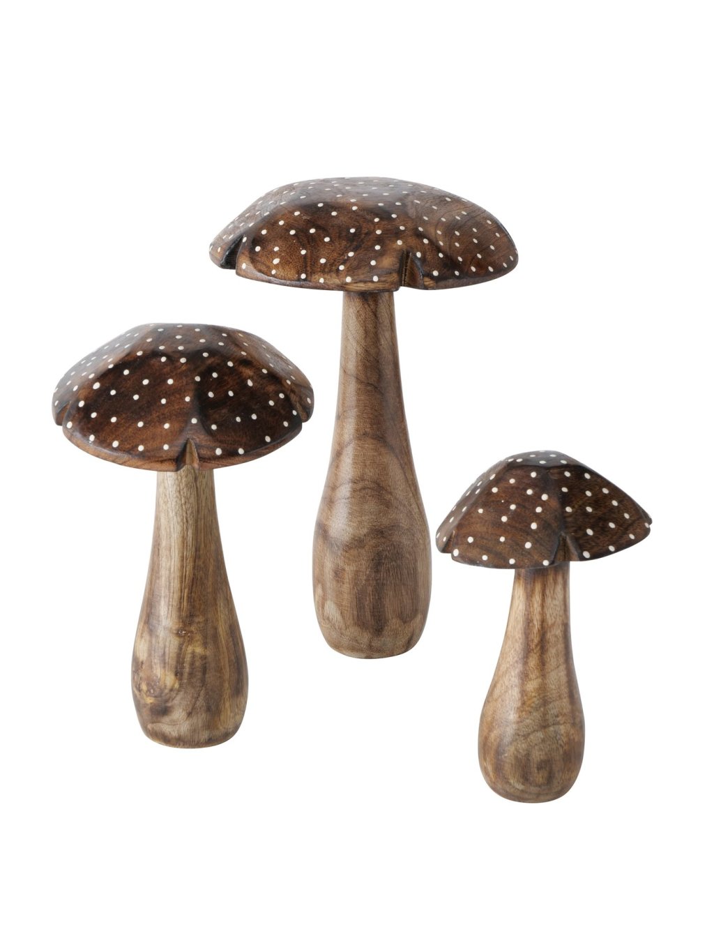 Set obsahuje 3 ručne vyrezávané hríby z mangového dreva v prírodnom odtieni, zdobené jemnými bodkami.