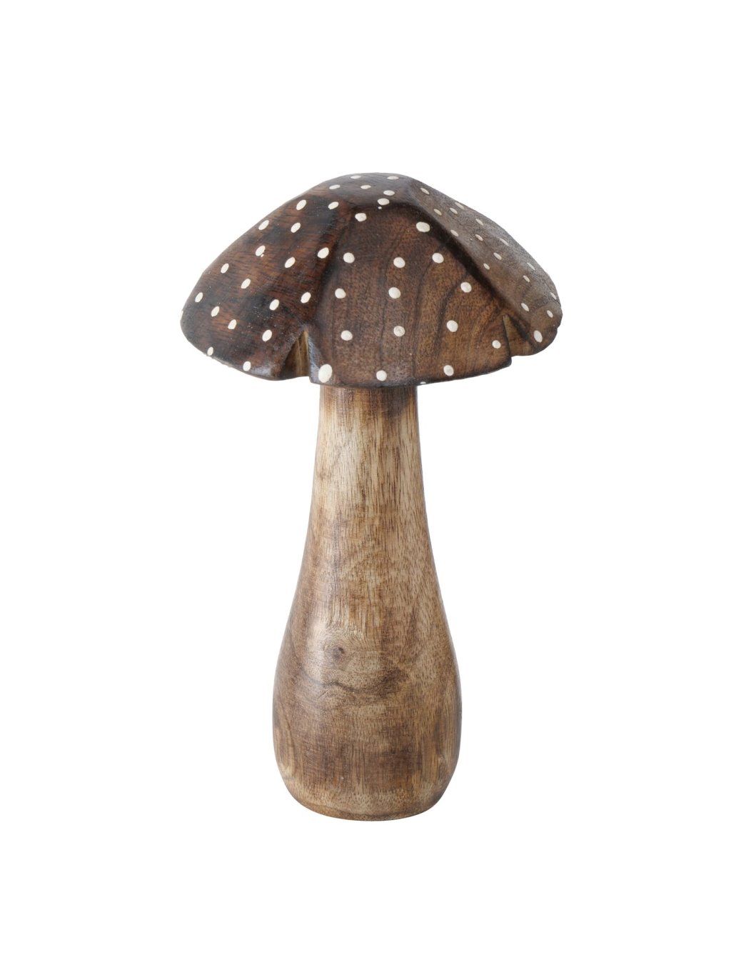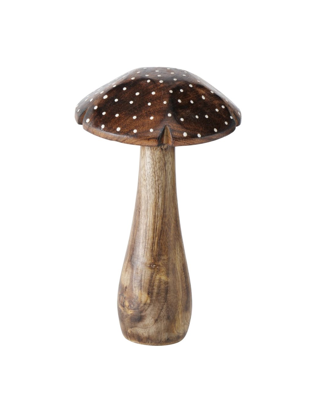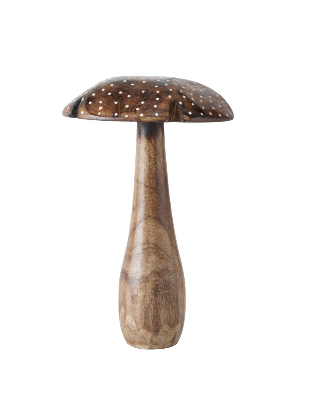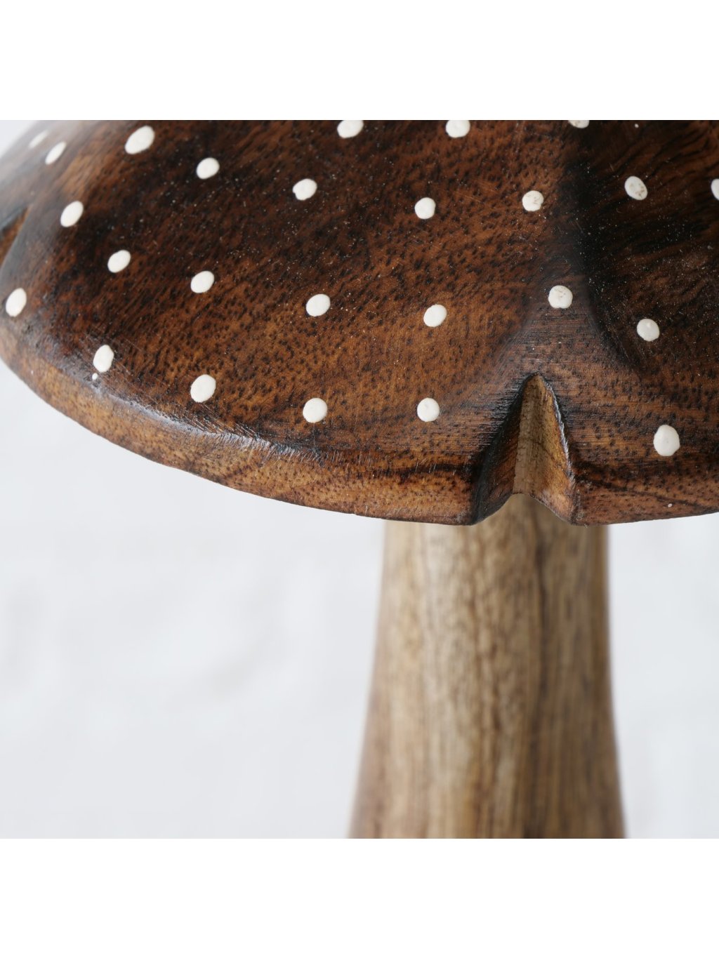 Set obsahuje 3 ručne vyrezávané hríby z mangového dreva v prírodnom odtieni, zdobené jemnými bodkami.