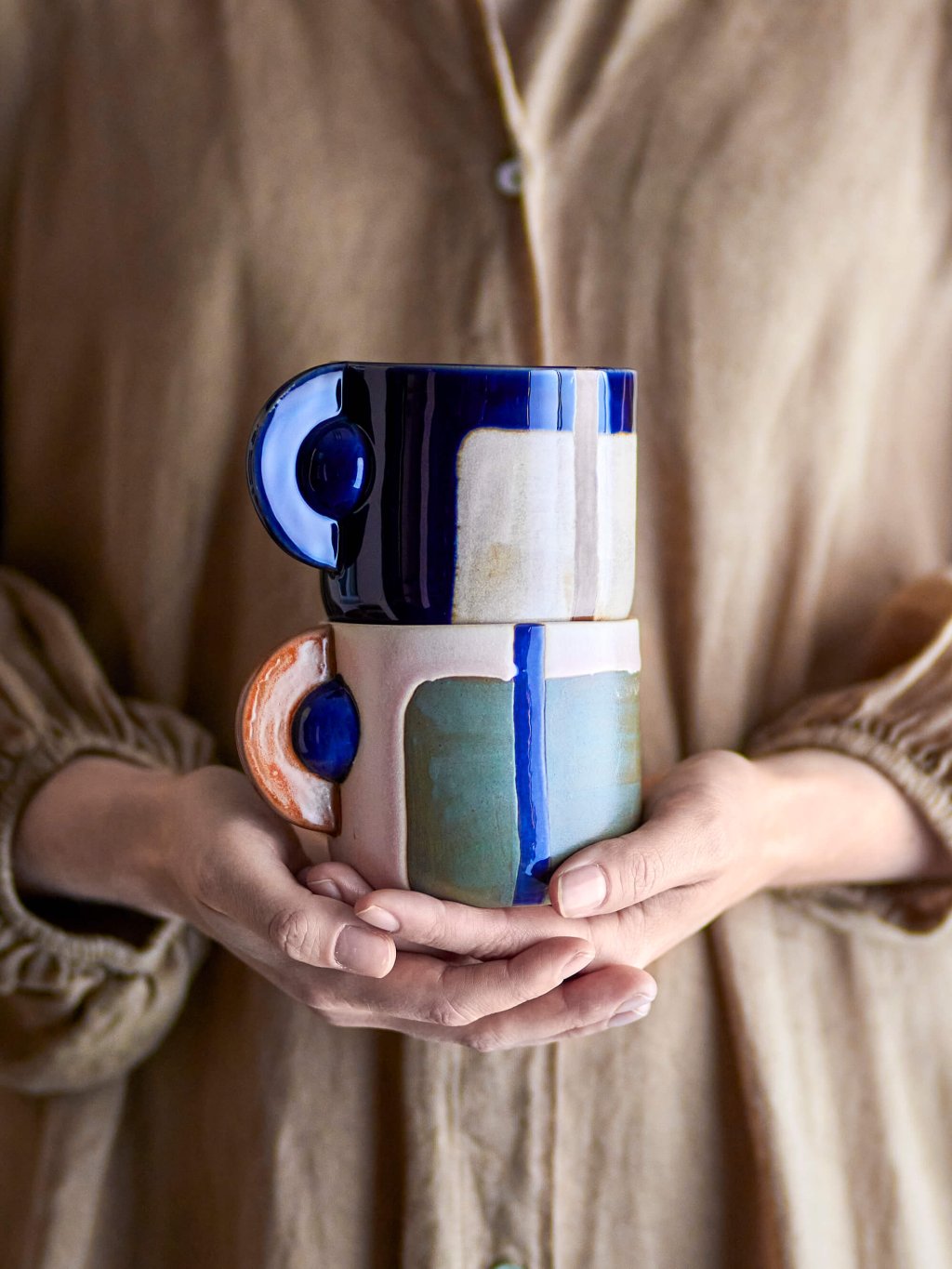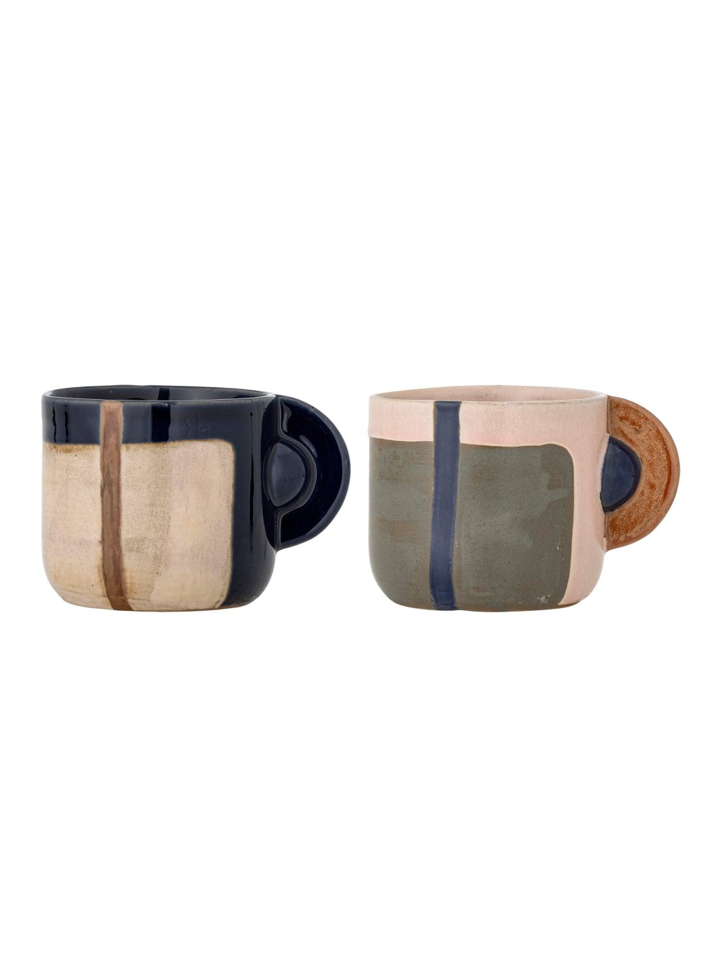 Sada dvoch kameninových šálok Bolivia od Bloomingville vyniká geometrickým vzorom v kombinácii hlbokej námorníckej modrej, jemnej béžovej a tlmených ružových tónov.