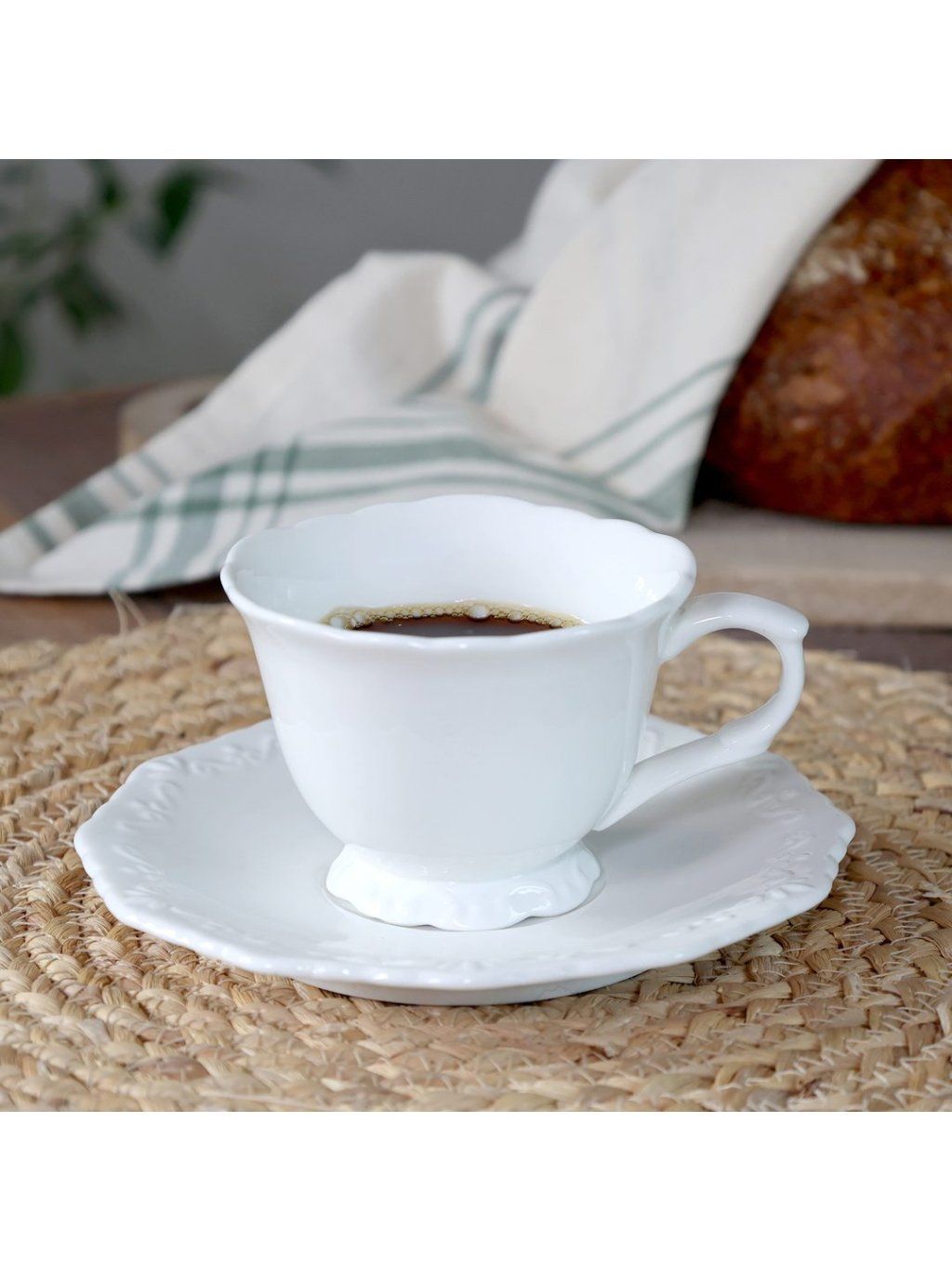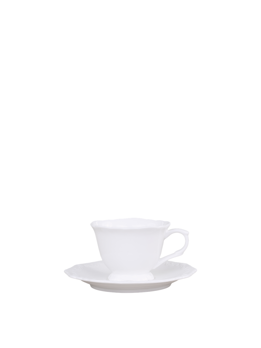 Šálka s podšálkou v čistej bielej farbe pôsobí nadčasovo a jemne romanticky. Decentné tvarovanie okrajov a podstavca dodáva setu nádych vidieckeho štýlu, ktorý krásne vynikne pri podávaní kávy alebo čaju.