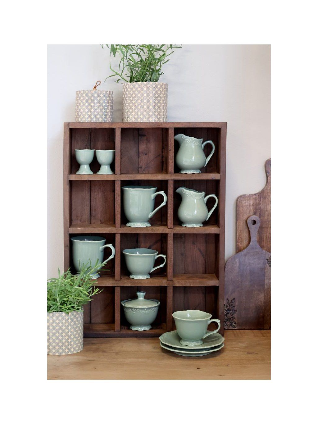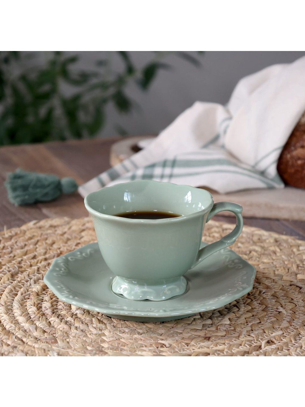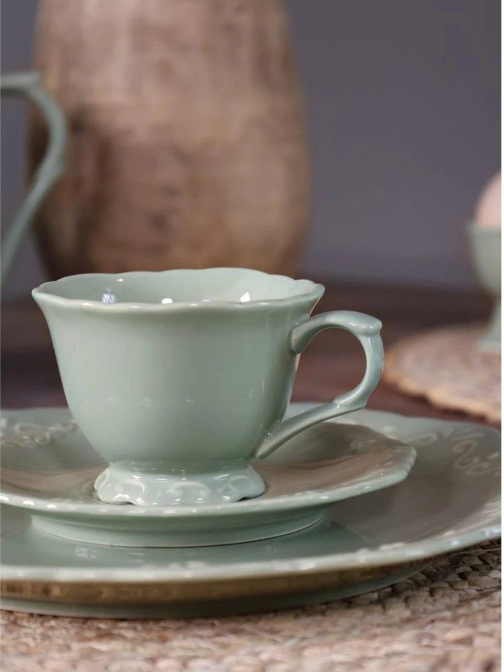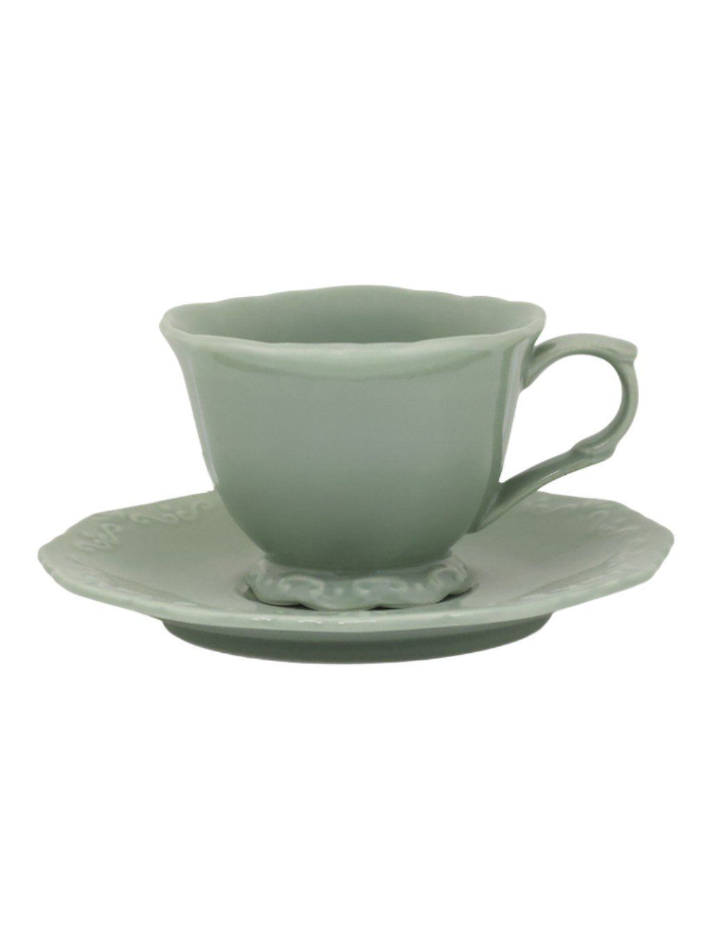 Porcelánová šálka s podšálkou v jemnej zelenej farbe, ideálna na podávanie kávy s dôrazom na detail a pohodlie.