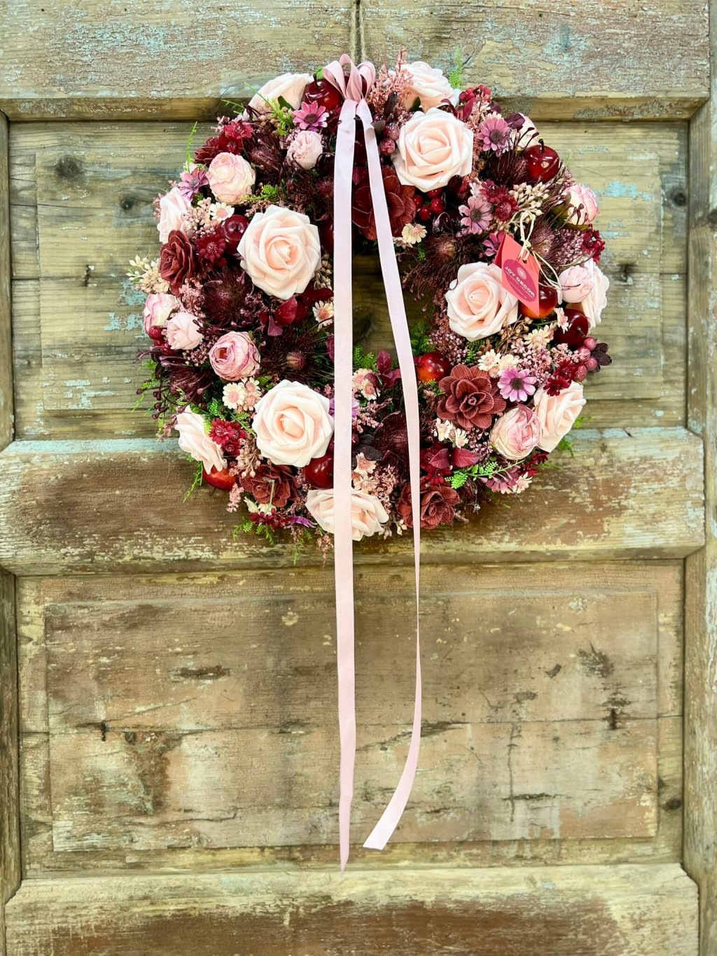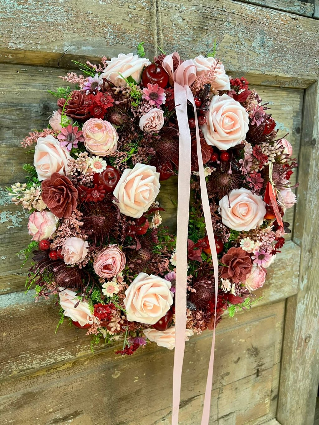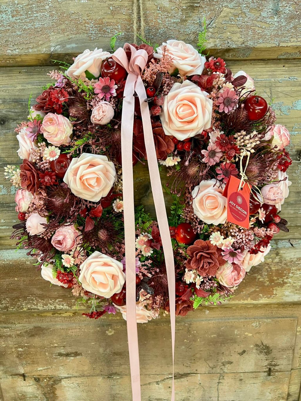 Ručne aranžovaný veniec s priemerom 40 cm je bohatý na detaily a textúry. Základ tvoria krémové a ružové ruže, ktoré sú doplnené o originálne drevené kvety a rôzne umelecké aranžérske prvky. Celok ozvláštňujú jabĺčka a drobné kvietky, ktoré pridávajú dekorácii hravosť aj prirodzenosť. Tento elegantný bordovo-ružový veniec je skutočným šperkom pre interiér aj exteriér – vynikne na dverách, stene či ako netradičný stolový aranžmán.