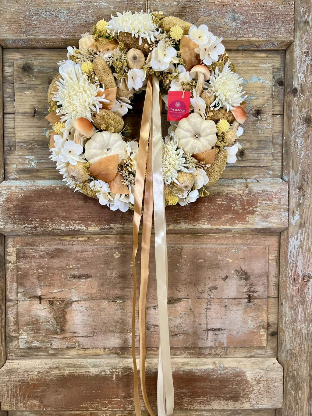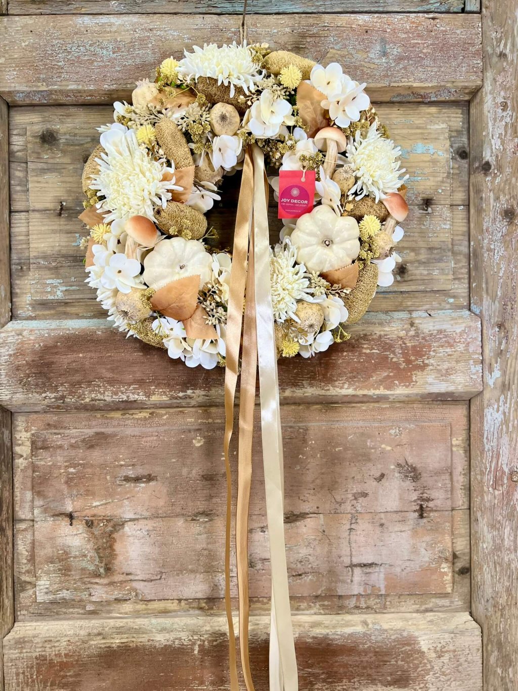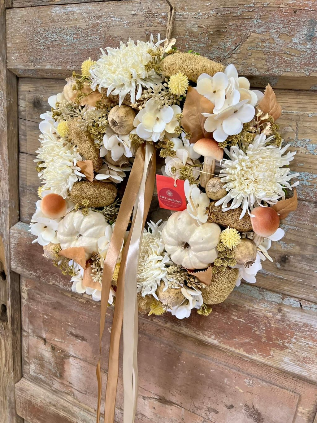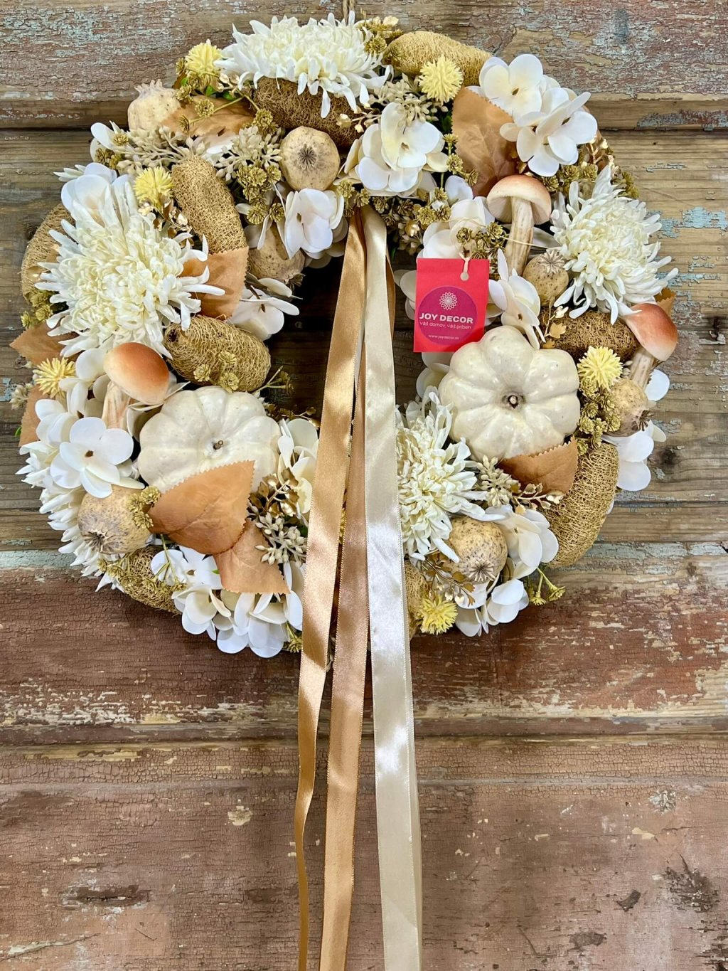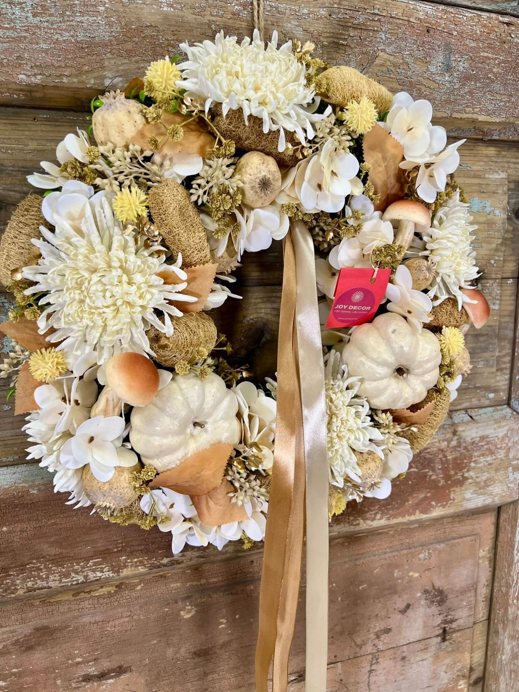 Tento ručne aranžovaný veniec je ladený do smotanovo-hnedých odtieňov, ktoré pôsobia elegantne a čistým dojmom. Dominantné sú penové hríby a krémové tekvičky, ktoré mu dodávajú osobitý charakter. Medzi nimi rozkvitajú umelé chryzantémy, biela hortenzia a sušené makovice, doplnené prírodnými detailmi. Celok zvýrazňujú jemné saténové stuhy v krémovej a hnedej, ktoré pôsobia vzdušne a dodávajú dekorácii slávnostný nádych. Veniec je ideálny na dvere, stenu alebo ako originálna ozdoba stola – svojím prevedením krásne ladí nielen s jeseňou, ale aj zimným obdobím.