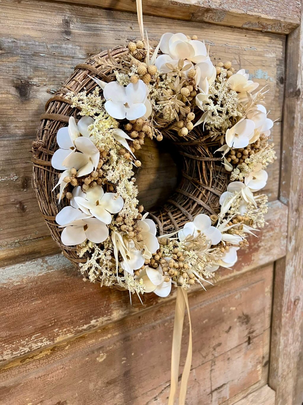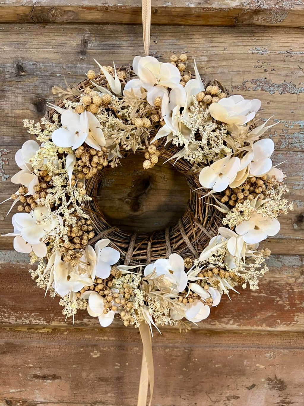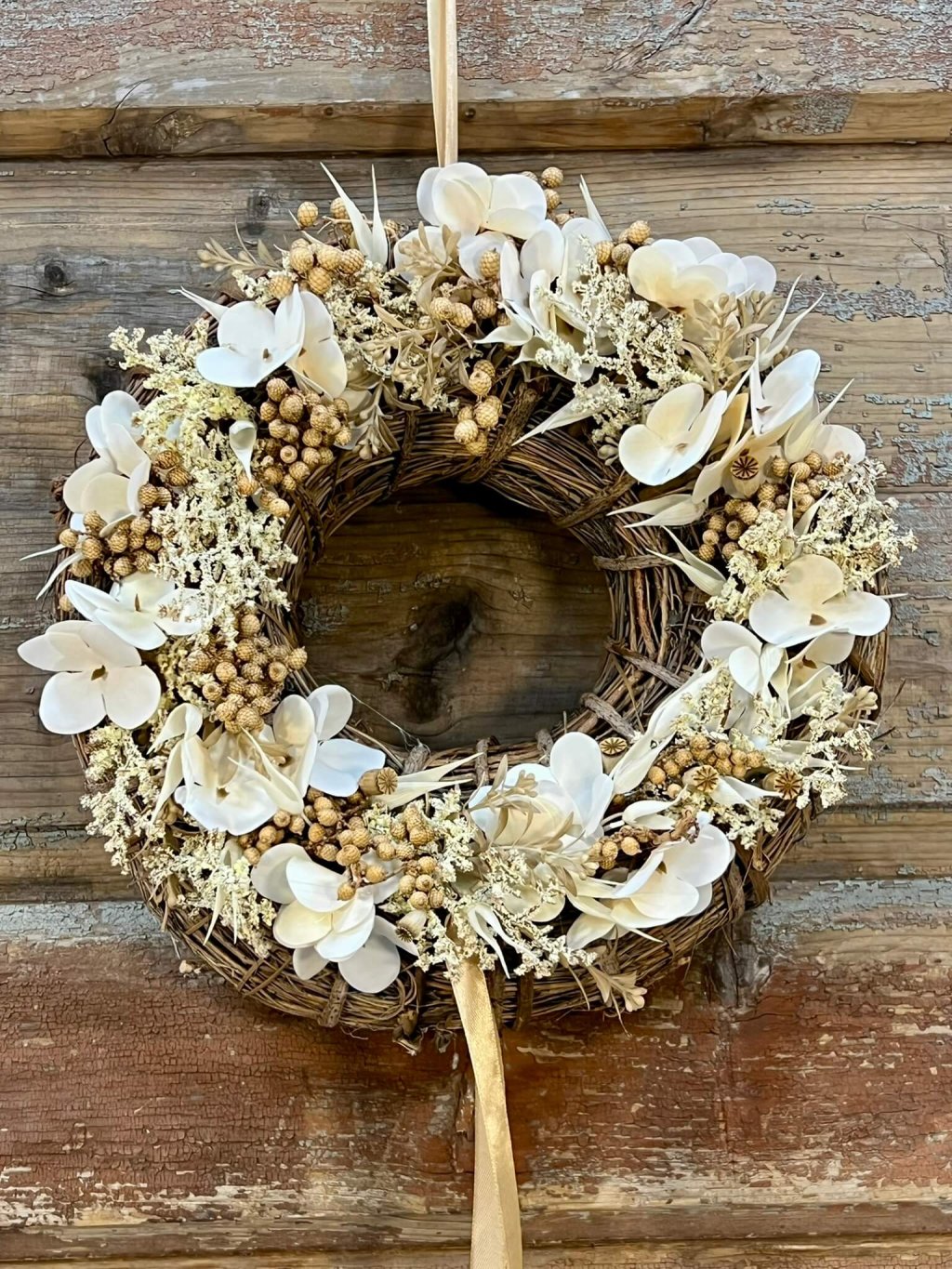 Veniec s priemerom 30 cm je postavený na prírodnom základe z viniča, ktorý mu dodáva rustikálny charakter. Zdobený je bielou umelou hortenziou, doplnenou o krémové bobuľky a drobné sušené makovice, ktoré mu dodávajú jemnú štruktúru a eleganciu. Celok dopĺňa krémová saténová stuha, ktorá veniec krásne zjemňuje. Tento prírodne ladený veniec je univerzálnou dekoráciou – vhodný na dvere, stenu či ako stredový aranžmán na stôl.