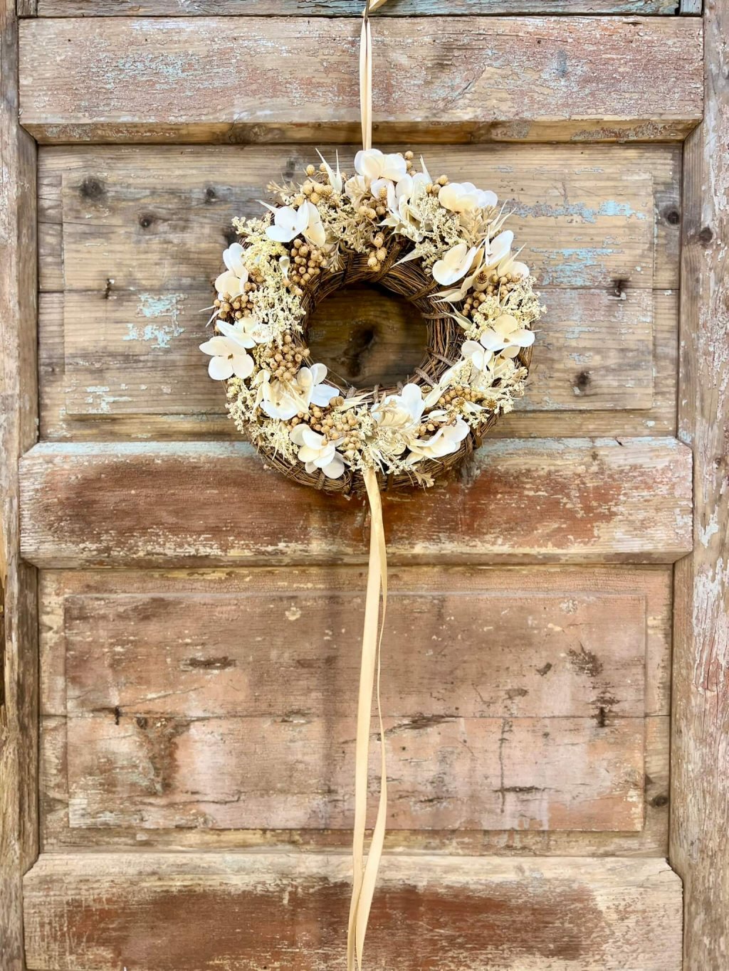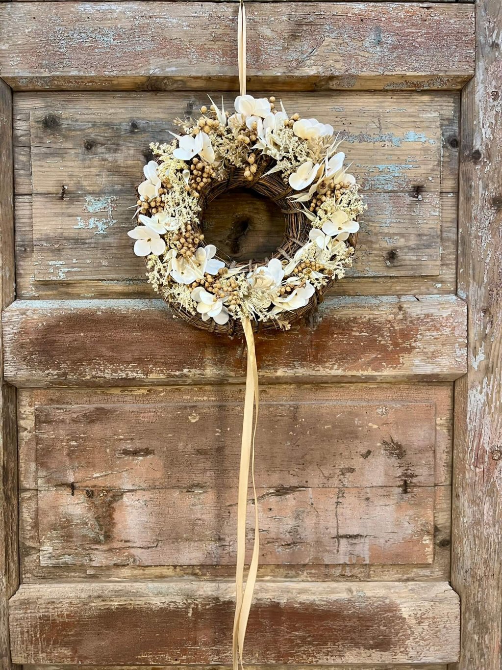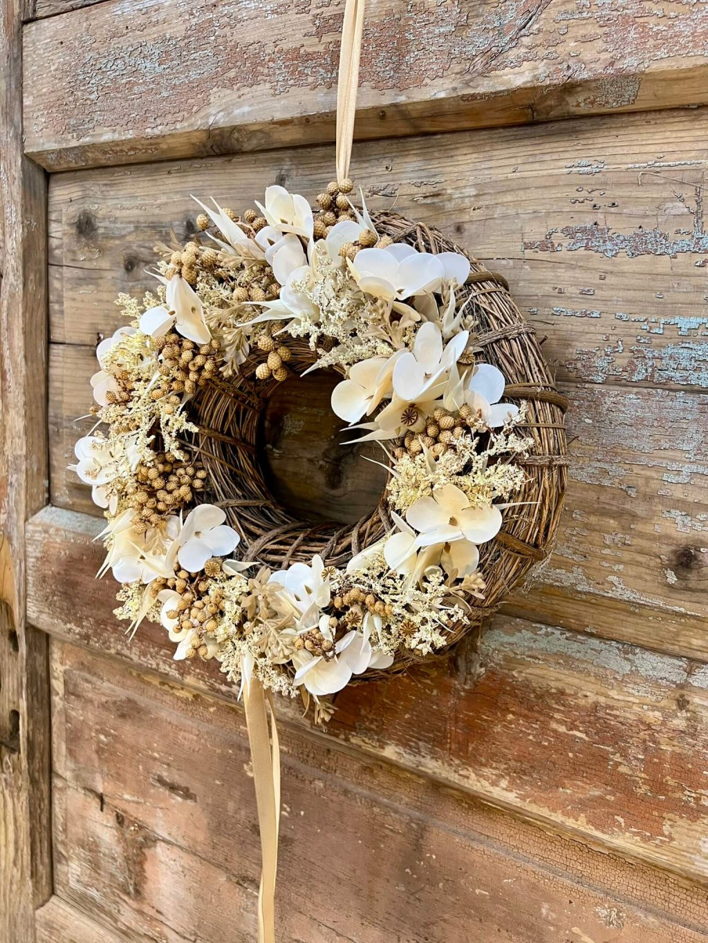 Veniec s priemerom 30 cm je postavený na prírodnom základe z viniča, ktorý mu dodáva rustikálny charakter. Zdobený je bielou umelou hortenziou, doplnenou o krémové bobuľky a drobné sušené makovice, ktoré mu dodávajú jemnú štruktúru a eleganciu. Celok dopĺňa krémová saténová stuha, ktorá veniec krásne zjemňuje. Tento prírodne ladený veniec je univerzálnou dekoráciou – vhodný na dvere, stenu či ako stredový aranžmán na stôl.