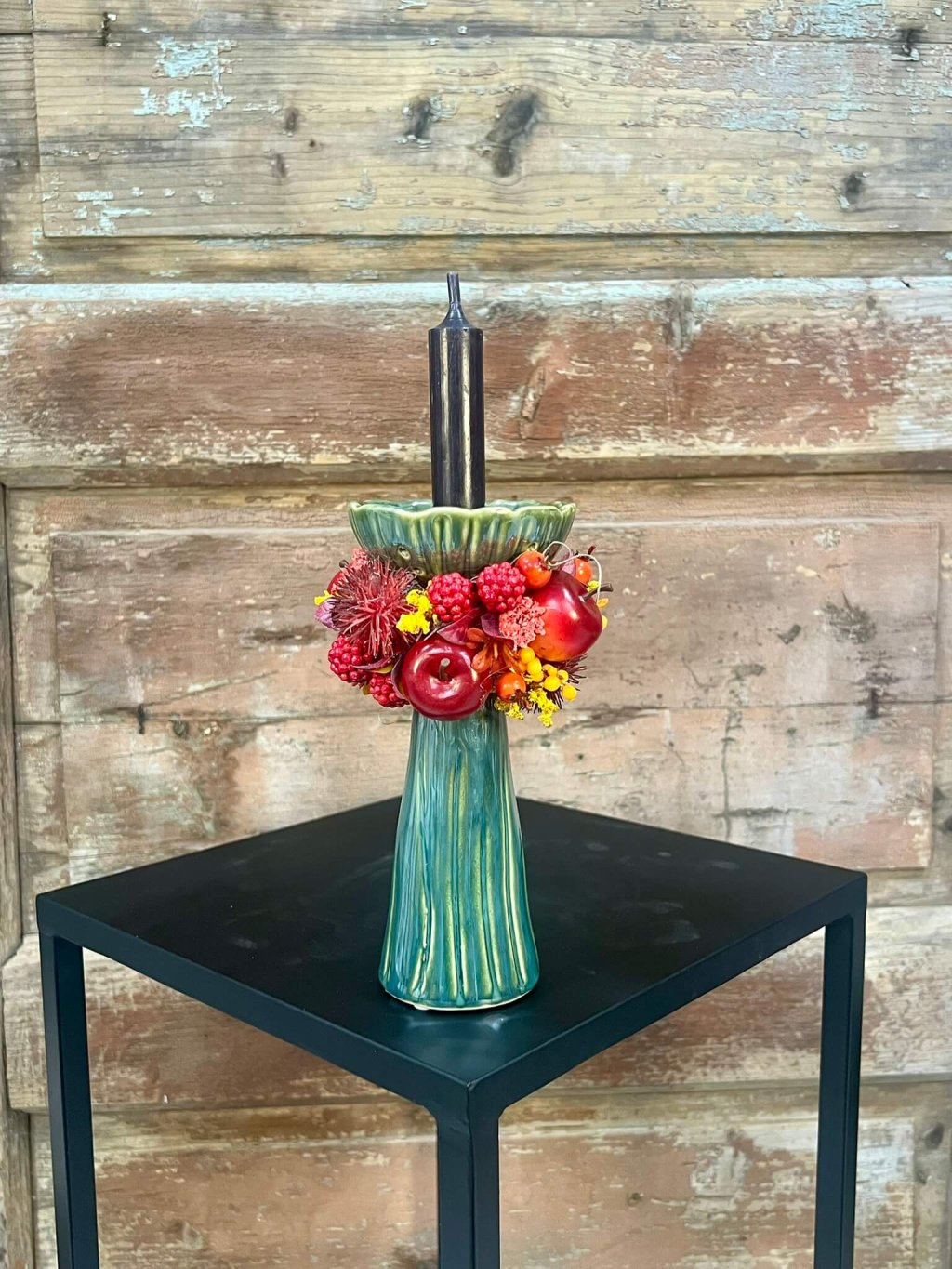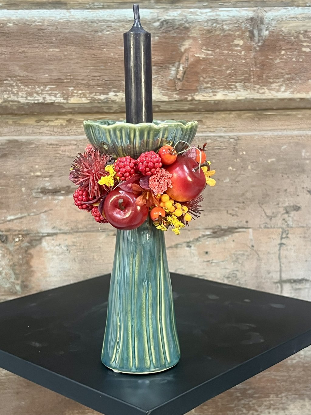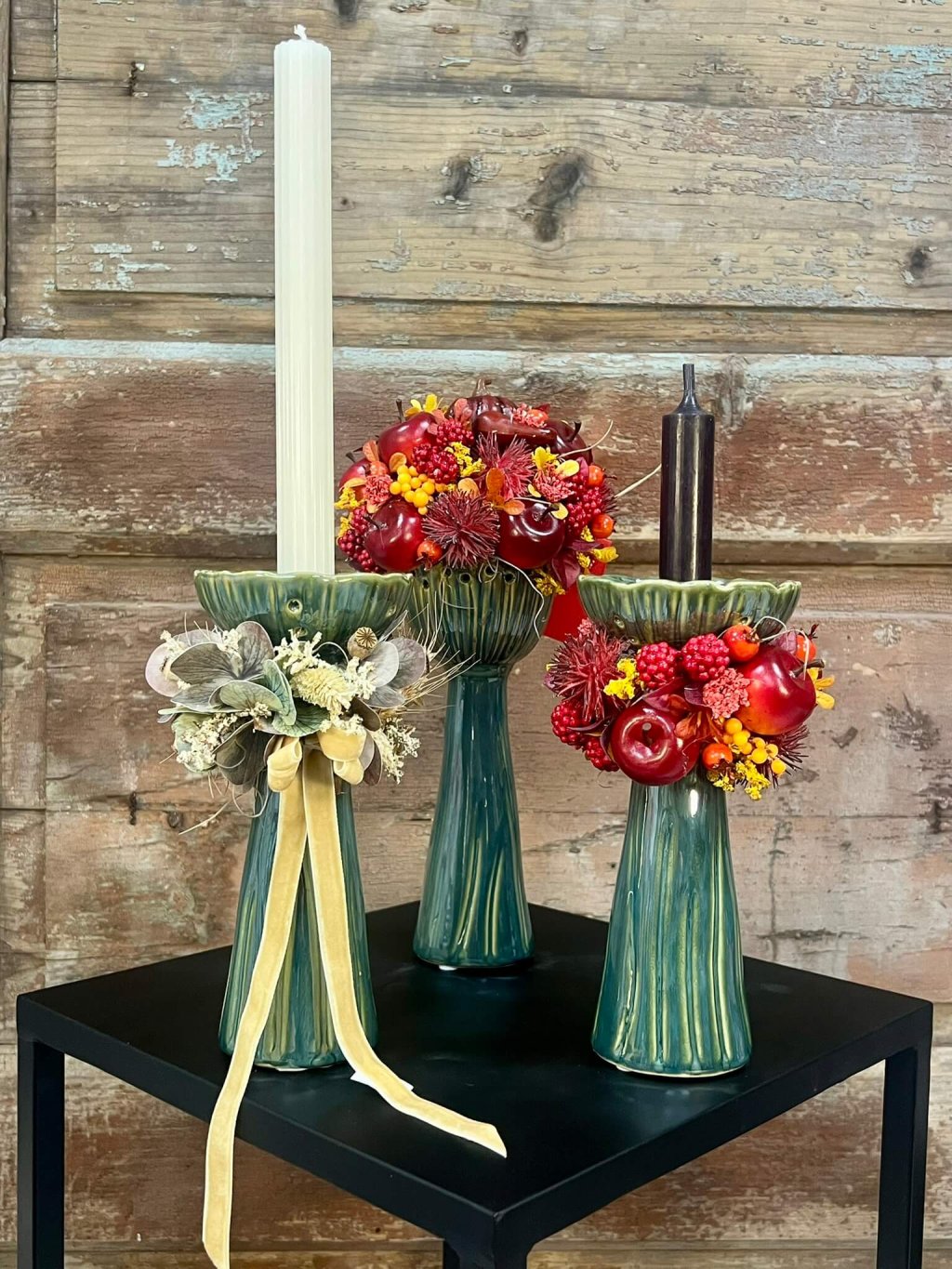 🍂 Kreatívne svietniky sú ukážkou, že dekorácia môže mať viacero podôb. Každý kúsok je originálne ozdobený – niektoré aranžmány dopĺňajú plody jesene, bobule, jablká a kvety v teplých tónoch, iný je ladený jemnejšie so sušenými listami a mašľou, ktorá dodáva romantický charakter. Základom sú keramické svietniky v zeleno-modrej glazúre, ktoré pôsobia elegantne a moderným dojmom.