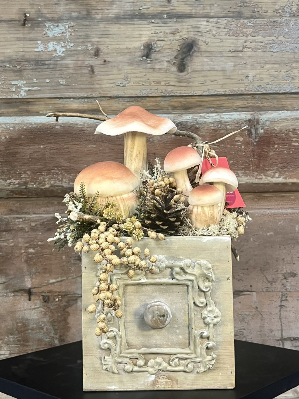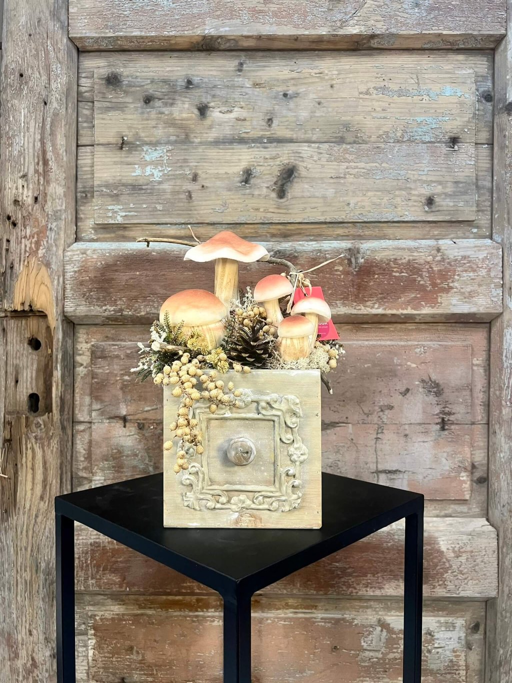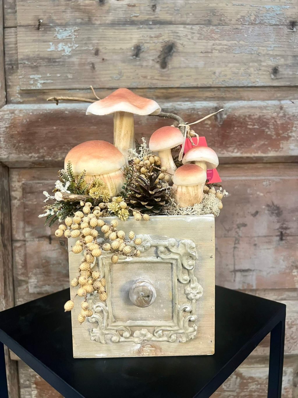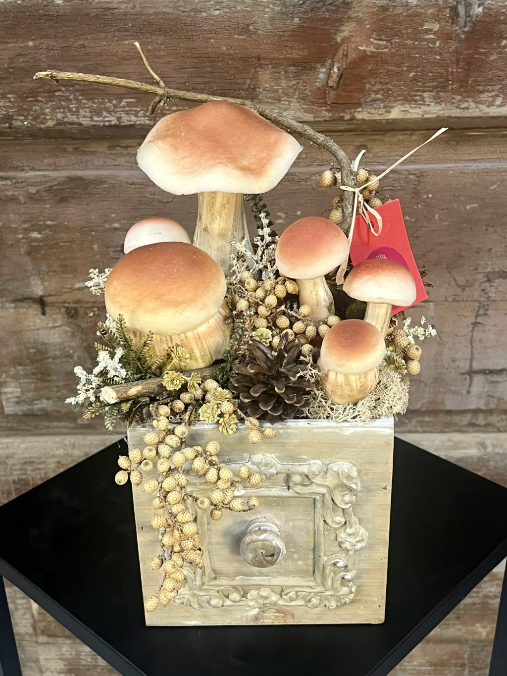 🍂 Aranžmán Lesný šuflík s hríbikmi je netradičný jesenný doplnok, ktorý kombinuje realistické penové hríby, šišku, drobné plody a sušené konáriky. Všetko je naaranžované v drevenom šuflíku so zdobeným čelom a drevenou úchytkou, ktorá pôsobí vintage a dodáva aranžmánu osobitý šarm.