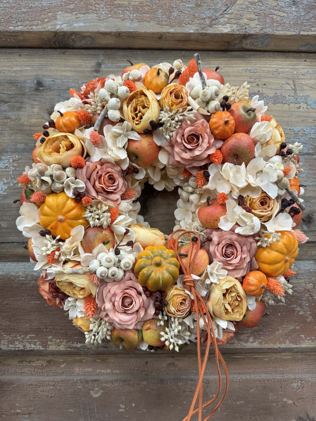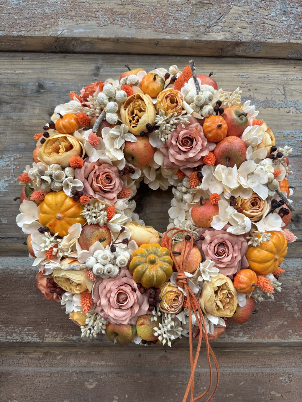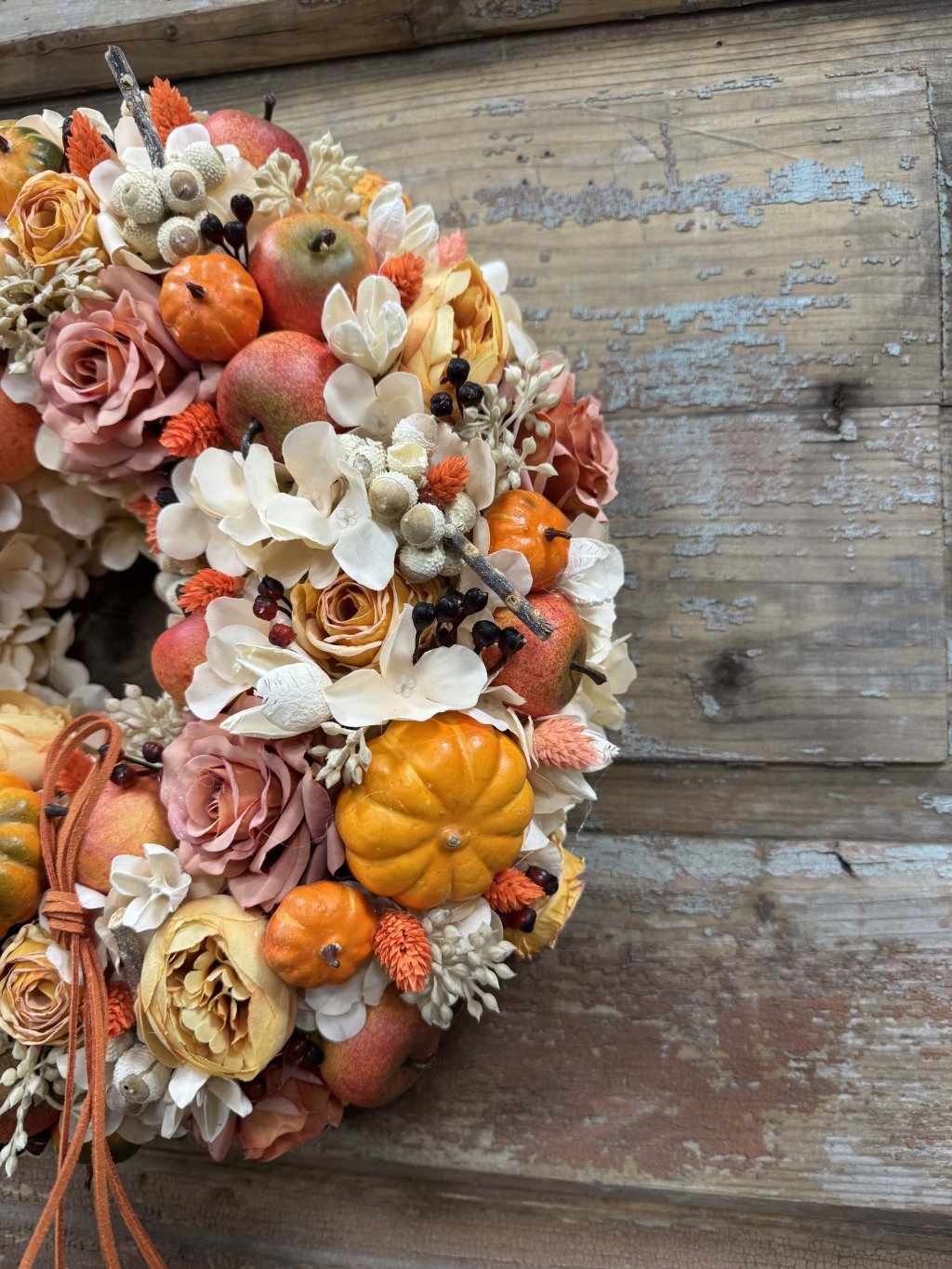 Veniec je bohato aranžovaný z umelých tekvičiek, jabĺk, ruží, hortenzií a drobných sušených doplnkov v teplých odtieňoch oranžovej, marhuľovej, krémovej a jemne ružovej. Spolu vytvárajú harmonickú paletu, ktorá pôsobí prirodzene a energicky zároveň.