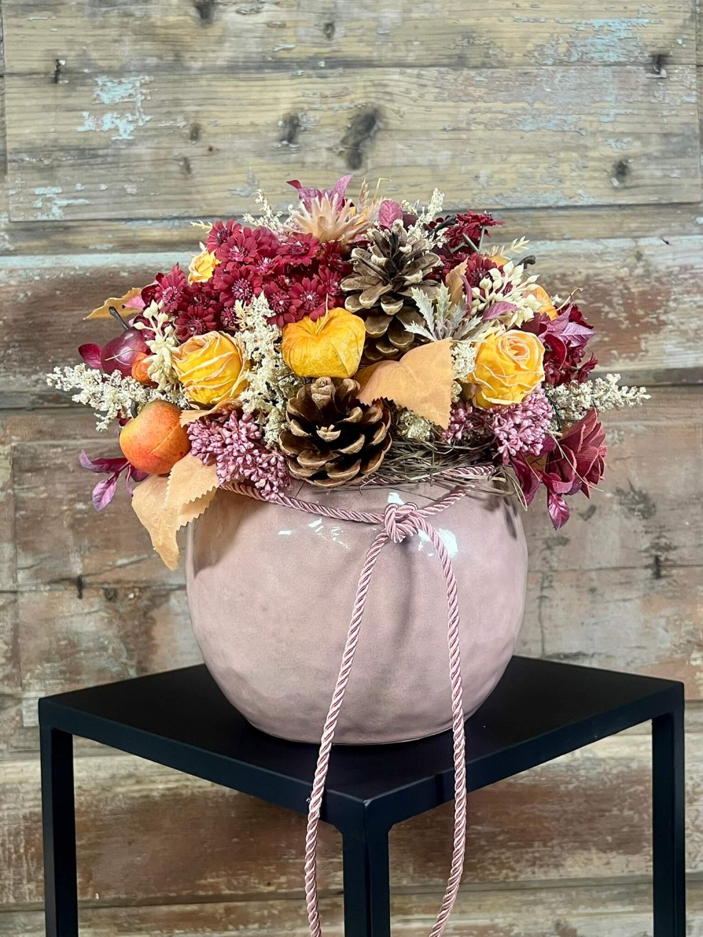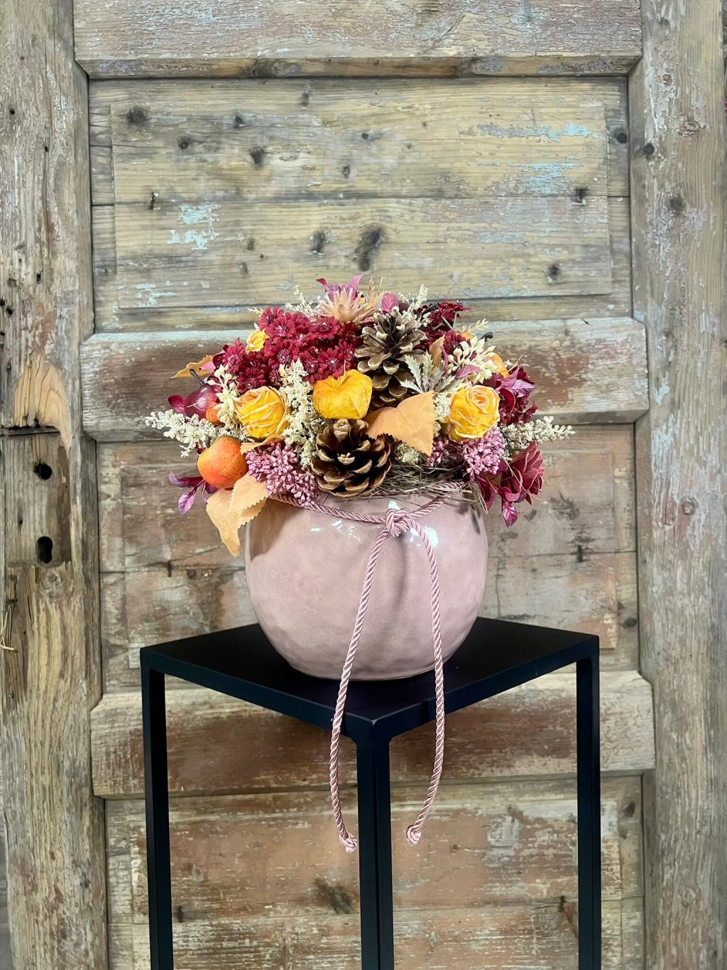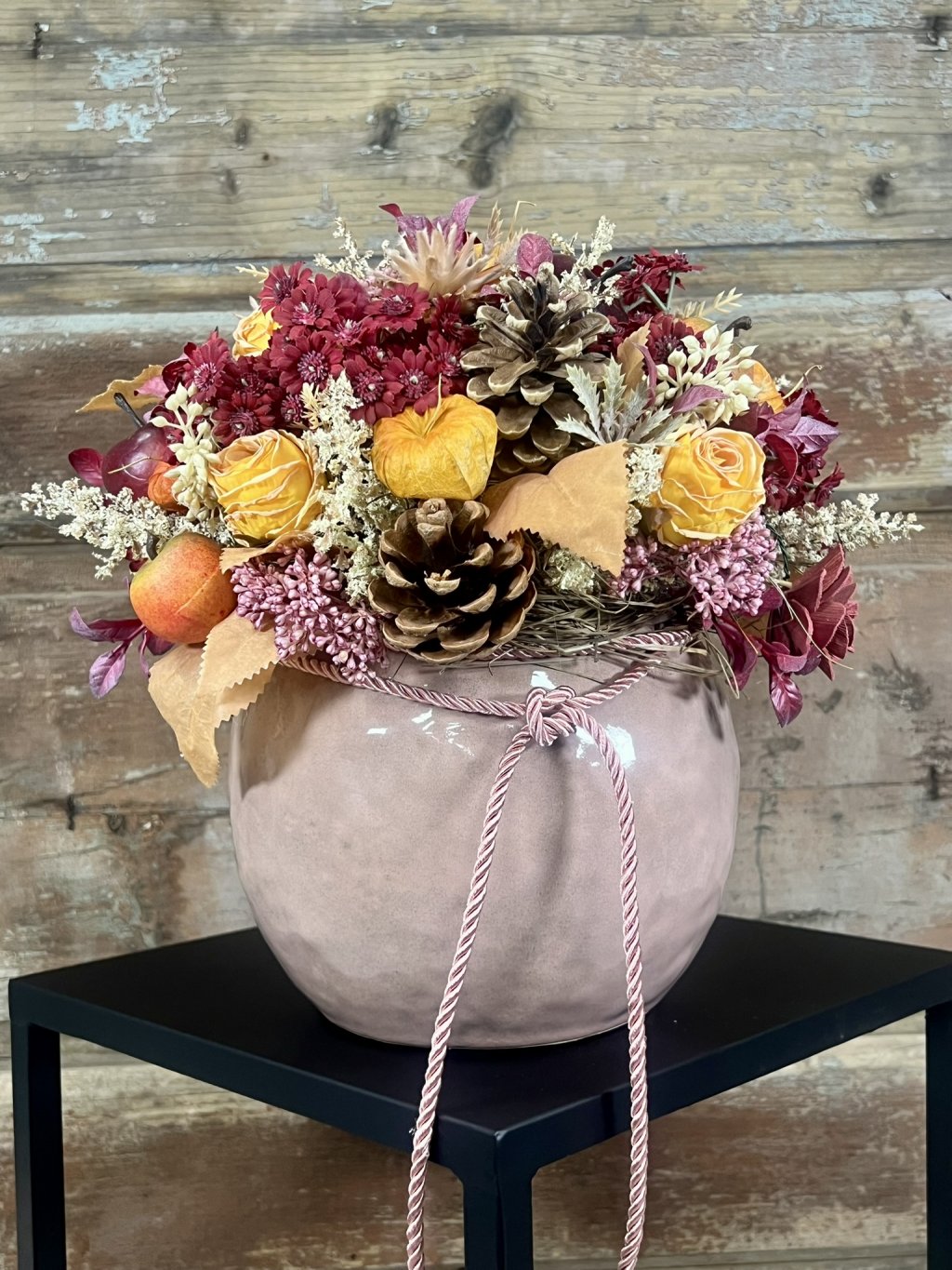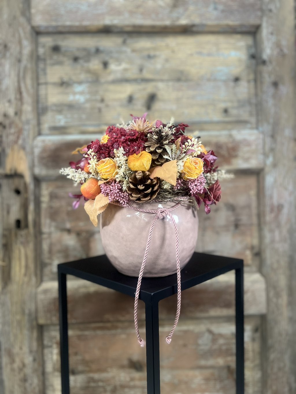 Jemná elegancia jesene ukrytá v keramickej mise. Tento aranžmán spája hrejivé farby a prírodné prvky do harmonického celku, ktorý premení váš stôl či poličku na malý jesenný kútik.