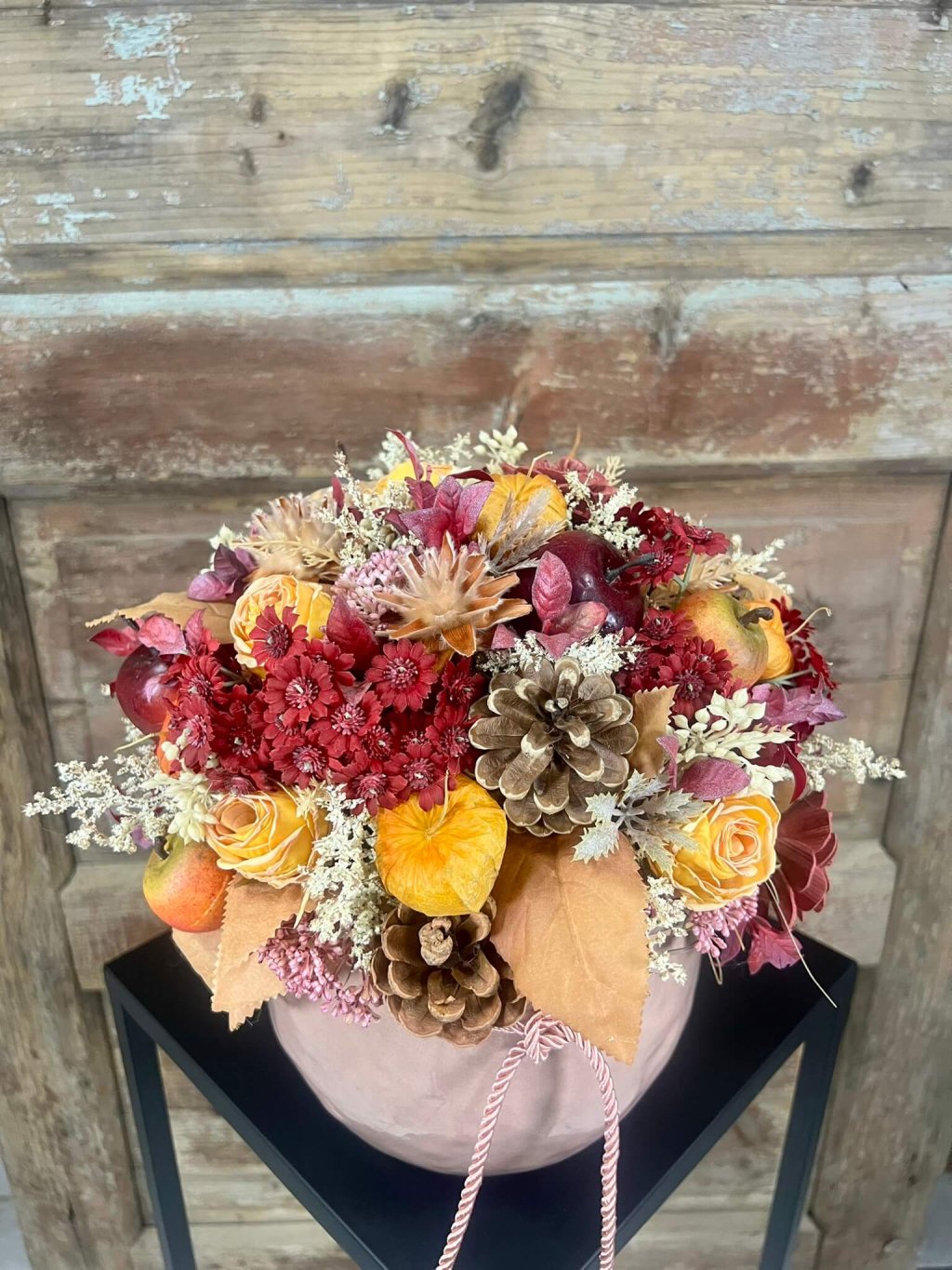 Aranžmán Romantika v ružovej mise je ručne vytvorený z bohatej kombinácie sušených a umelých kvetov v odtieňoch bordovej, žltej a ružovej, ktoré dopĺňajú borovicové šišky, drobné jablká a dekoratívna machovka. Základom je ružová keramická misa so šnúrkovou ozdobou, ktorá dodáva celku romantický a jemne vintage charakter. Rozmery 30 cm na výšku a 25 cm na priemer z neho robia ideálnu dekoráciu na jedálenský stôl, komodu či konferenčný stolík. Vďaka použitiu kvalitných materiálov vydrží aranžmán krásny počas celej jesennej sezóny.