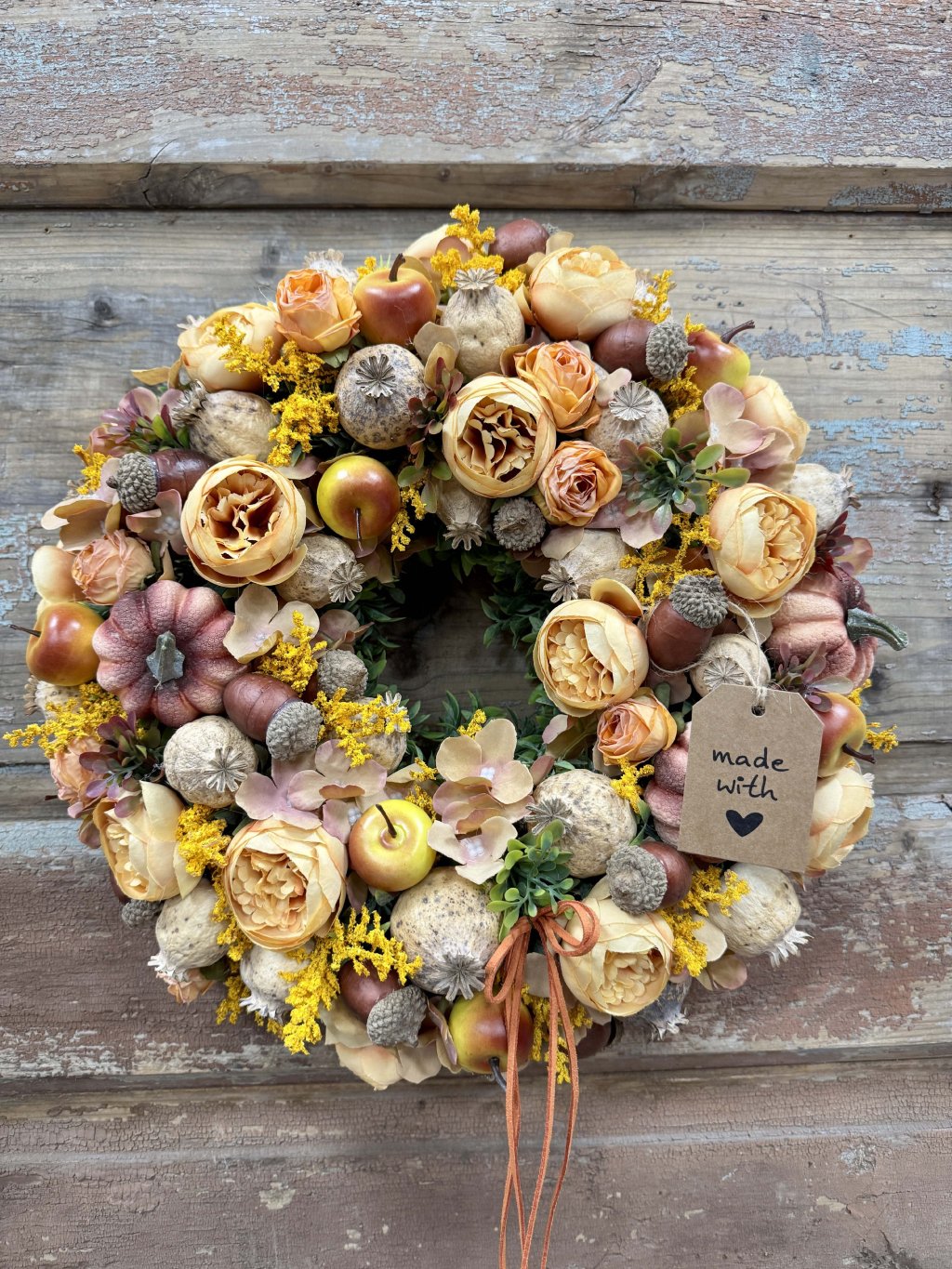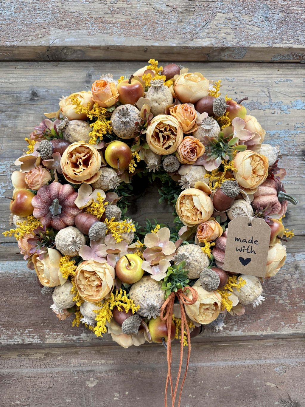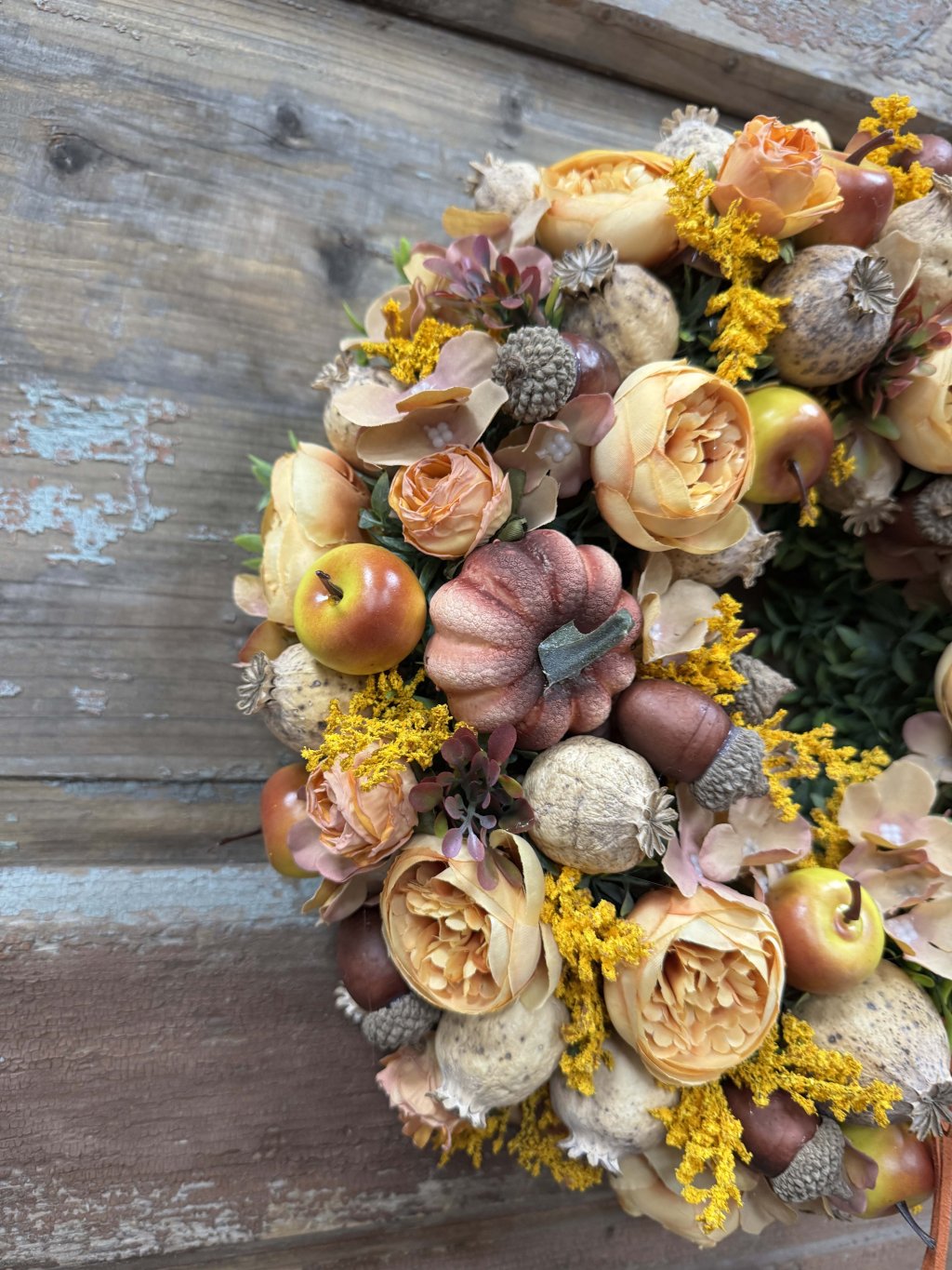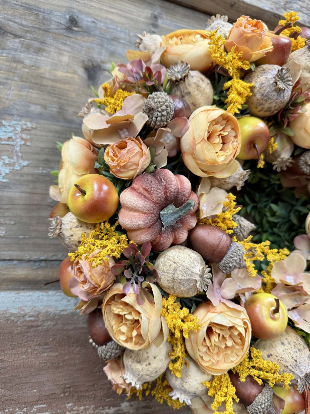 V tejto kompozícii sa prelínajú ruže v odtieňoch púdrovej, broskyňovej a krémovej, doplnené o sušené makovice, žltkasté kvety, malé jabĺčka, žaluďe a umelé tekvičky. Každý detail bol vybraný s citom pre rovnováhu farieb a tvarov, aby veniec pôsobil harmonicky a jemne rustikálne.