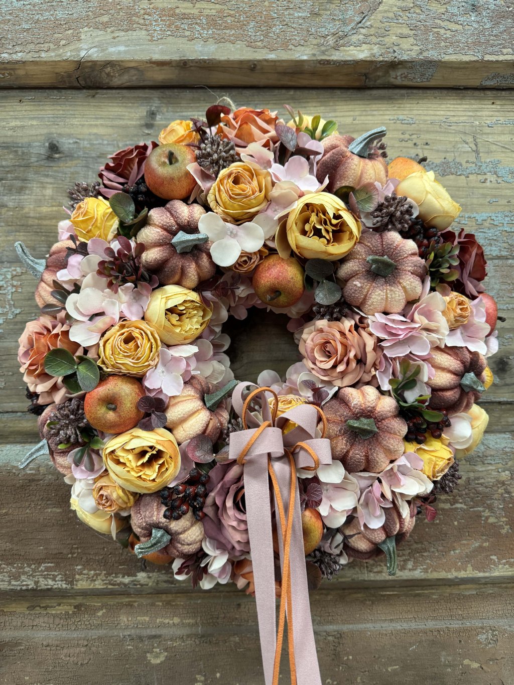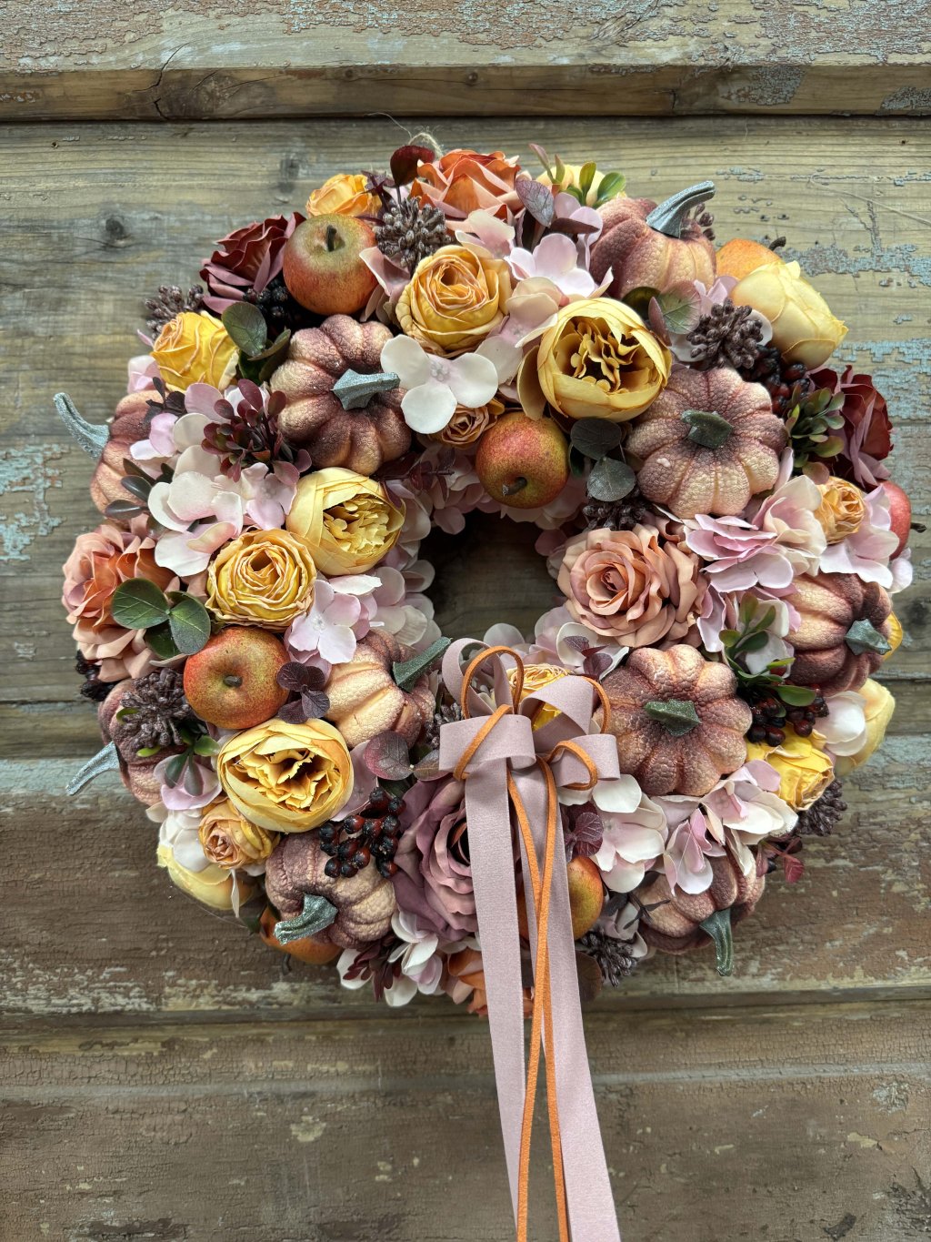 Ručne vytvorený veniec v sebe kombinuje umelé tekvičky, jablká, žlté a púdrové ruže, hortenzie a drobné bobuľky. Každý prvok je starostlivo umiestnený tak, aby vytvoril harmonickú kompozíciu v tónoch broskyne, karamelu, ružového prachu a medu. Saténová mašľa v odtieni staroružovej s jemným leskom pridáva romantický dotyk.
