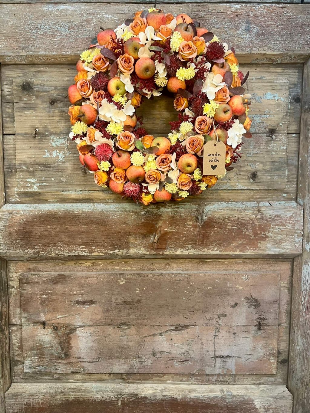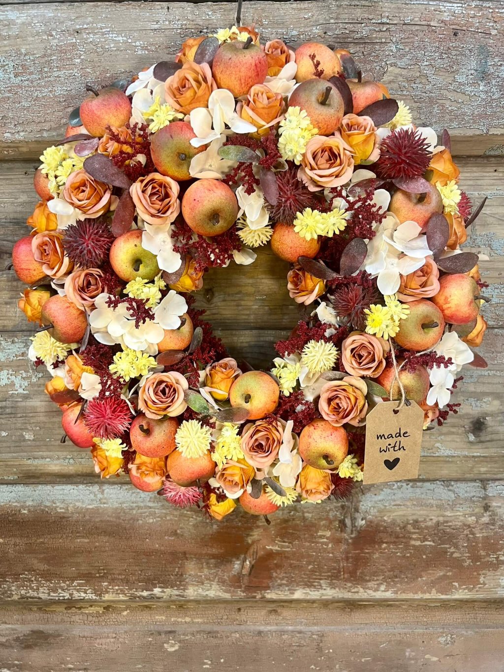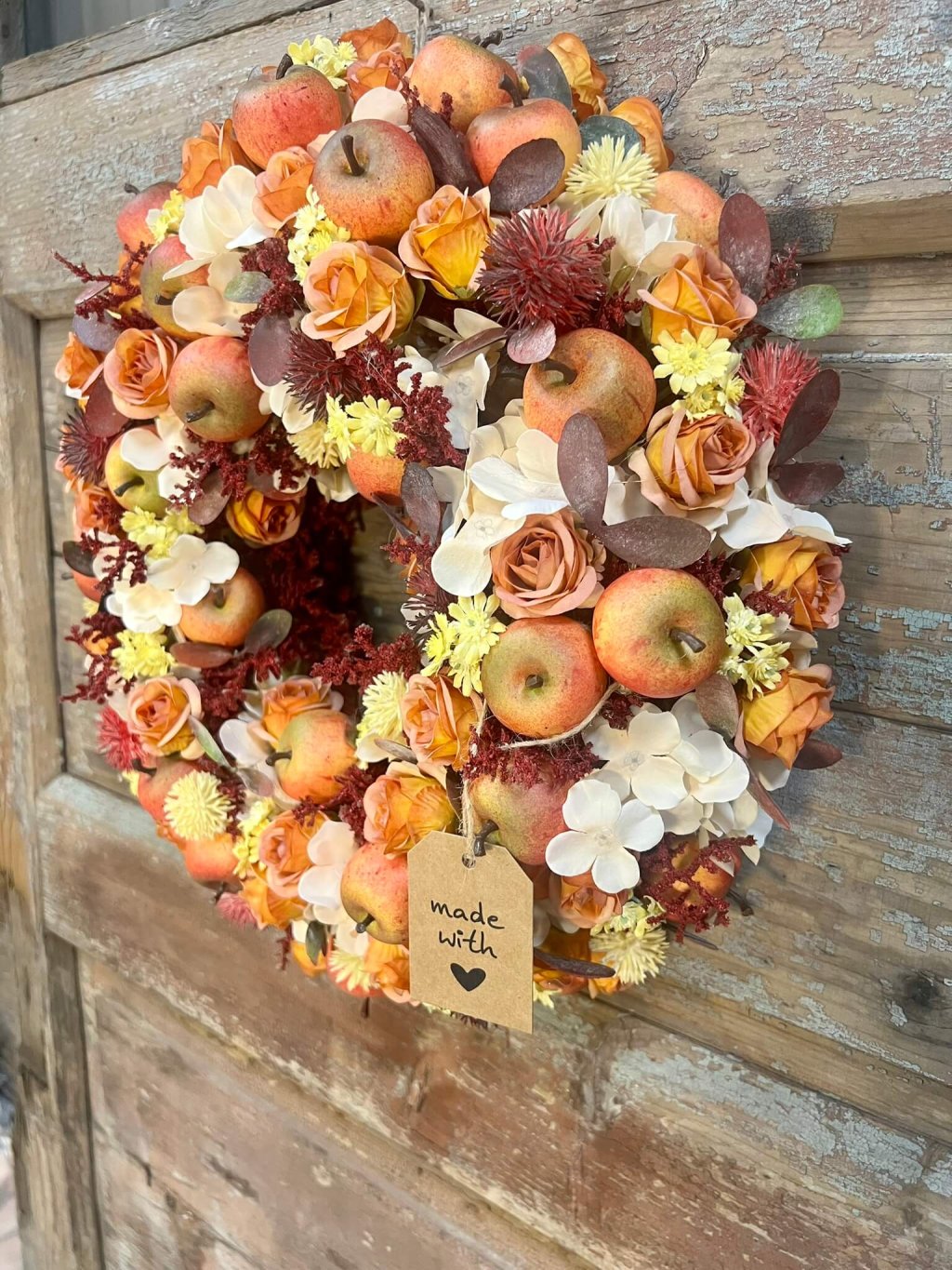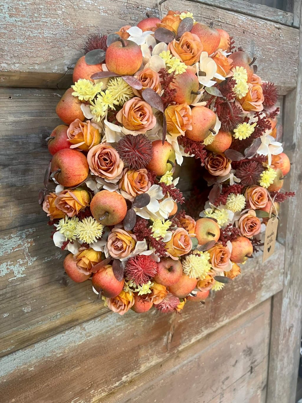 Jesenný veniec, ktorý pôsobí ako záhrada plná dozretých jabĺk a rozkvitnutých ružičiek. Spojenie teplých farieb a štedrých plodov navodzuje pocit hojnosti a domova, kde sa jeseň oslavuje všetkými zmyslami.