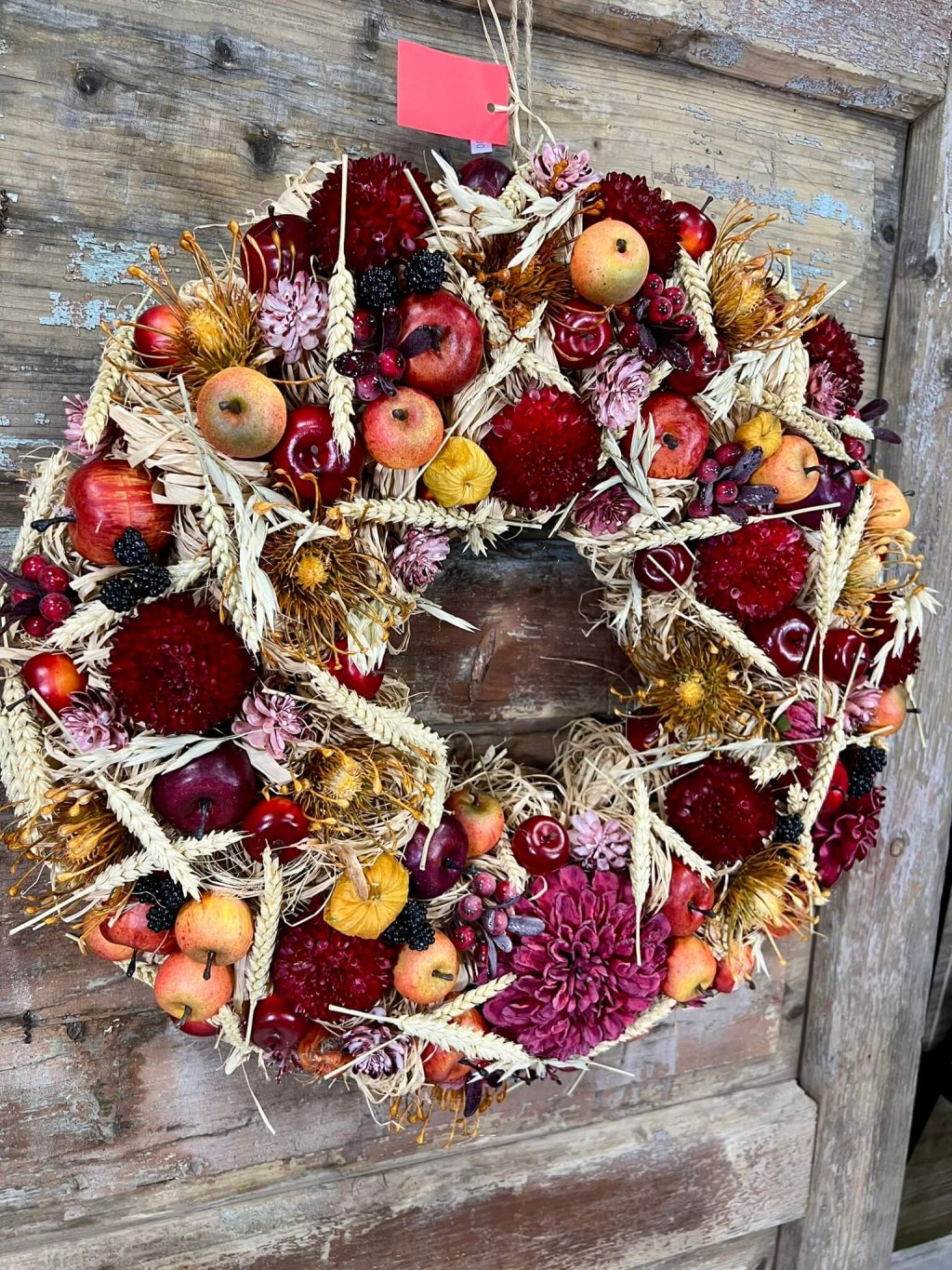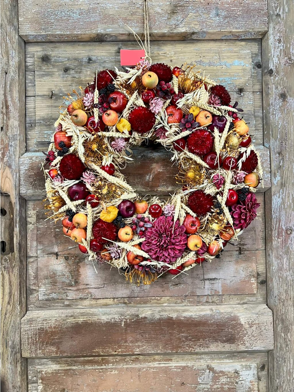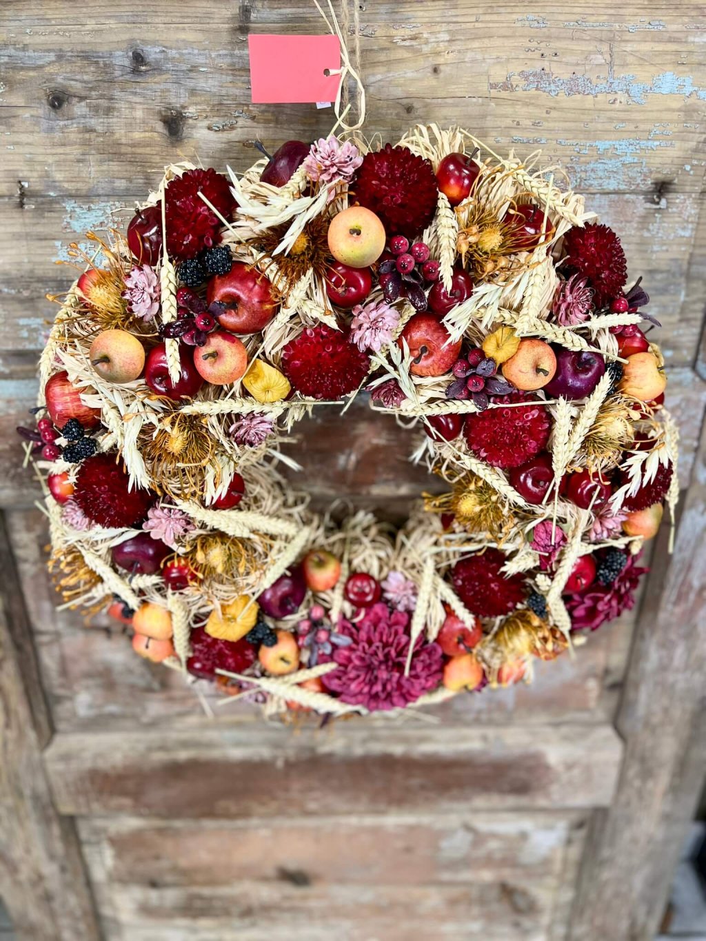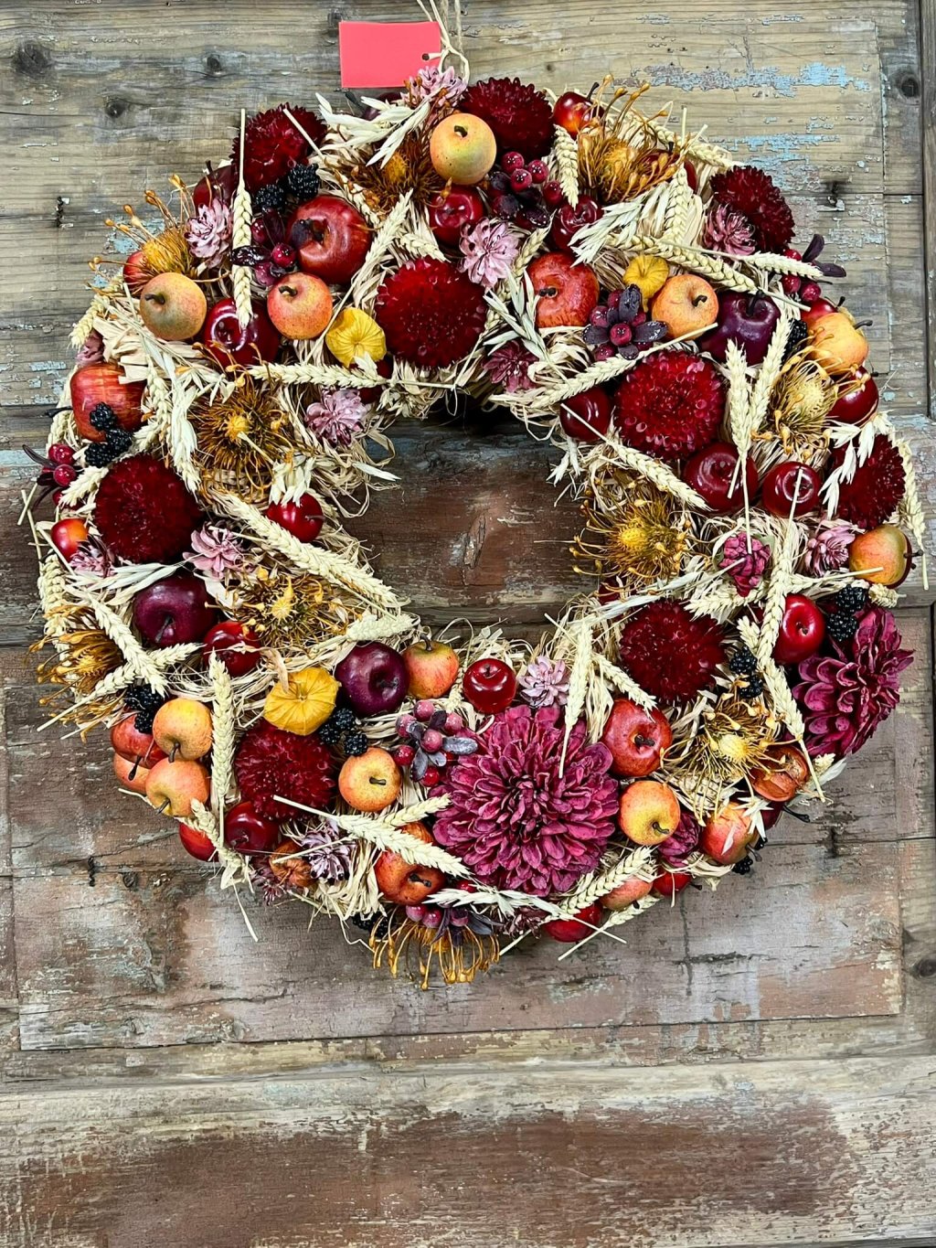 Ručne vyrobený veniec s priemerom 50 cm je postavený na prírodnom slamenom základe obalenom rafiou, ktorá mu dodáva autentický rustikálny charakter. Na jeho povrchu sa prelínajú farebné umelé cínie a eryngiá, ktoré dopĺňajú drobné jabĺčka v rôznych odtieňoch červenej a bordovej. Bohaté zdobenie završuje sušené obilie, ktoré prináša ľahkosť a prirodzenú textúru. Výsledkom je veniec, ktorý vyžaruje optimizmus a hrejivosť a stane sa neprehliadnuteľnou dominantou na dverách, stene či ako originálny stred stola.