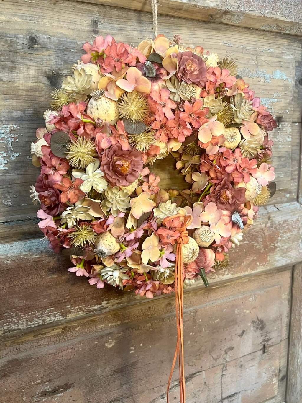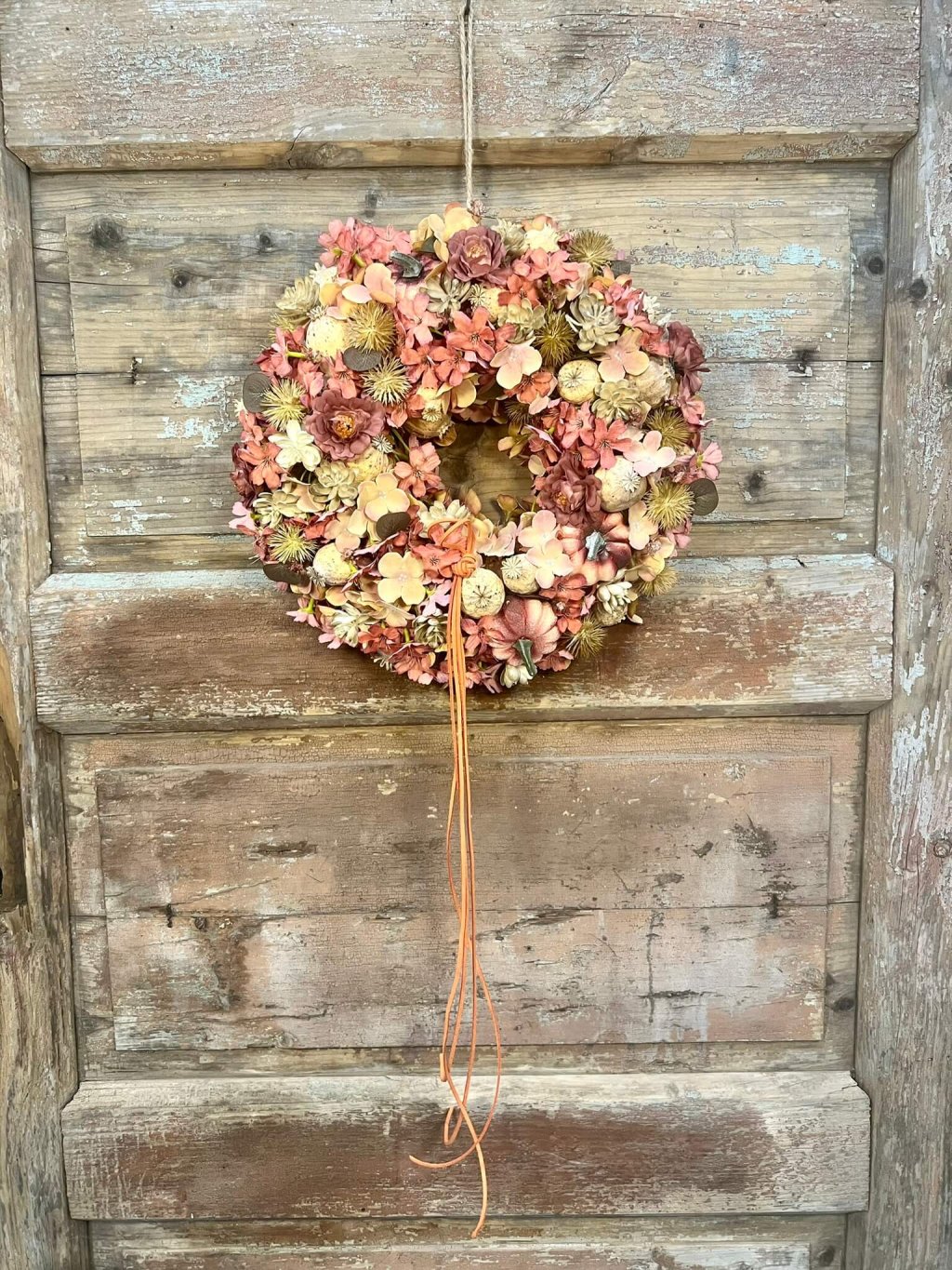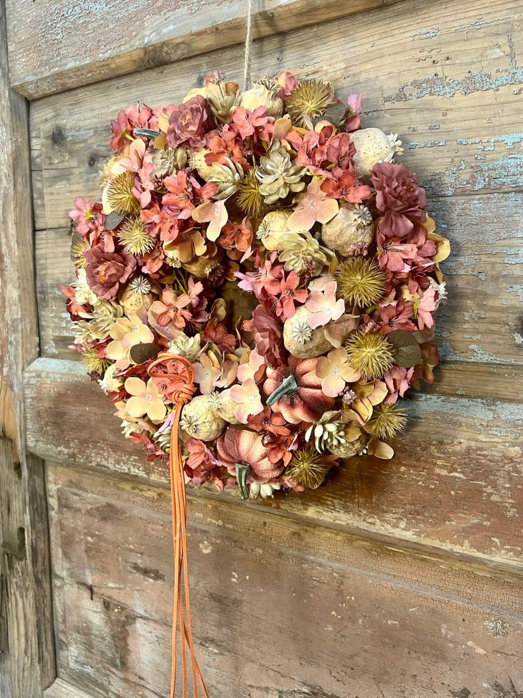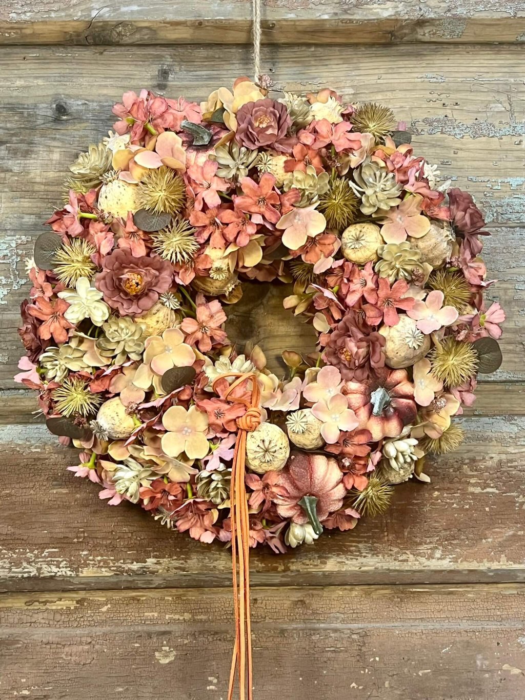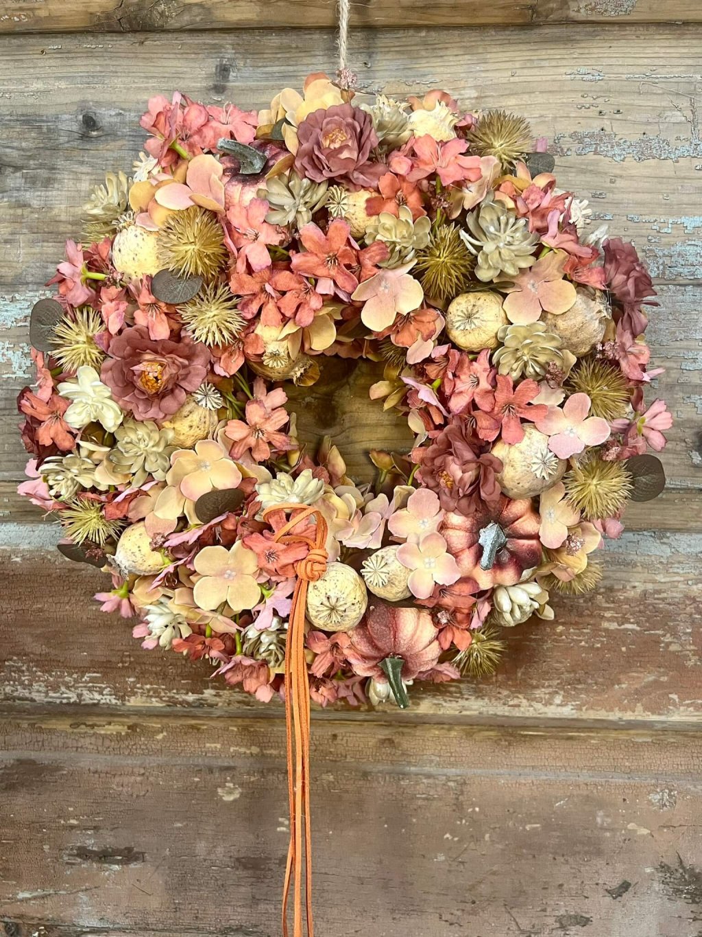 Veniec Tekvičkové čaro je bohato zdobený umelými kvetmi v odtieňoch ružovej, béžovej a púdrovej, ktoré sa prelínajú s drobnými tekvičkami, sušenými makovicami a dekoratívnymi bodliakmi. Spolu vytvárajú harmonickú kompozíciu pripomínajúcu babie leto.