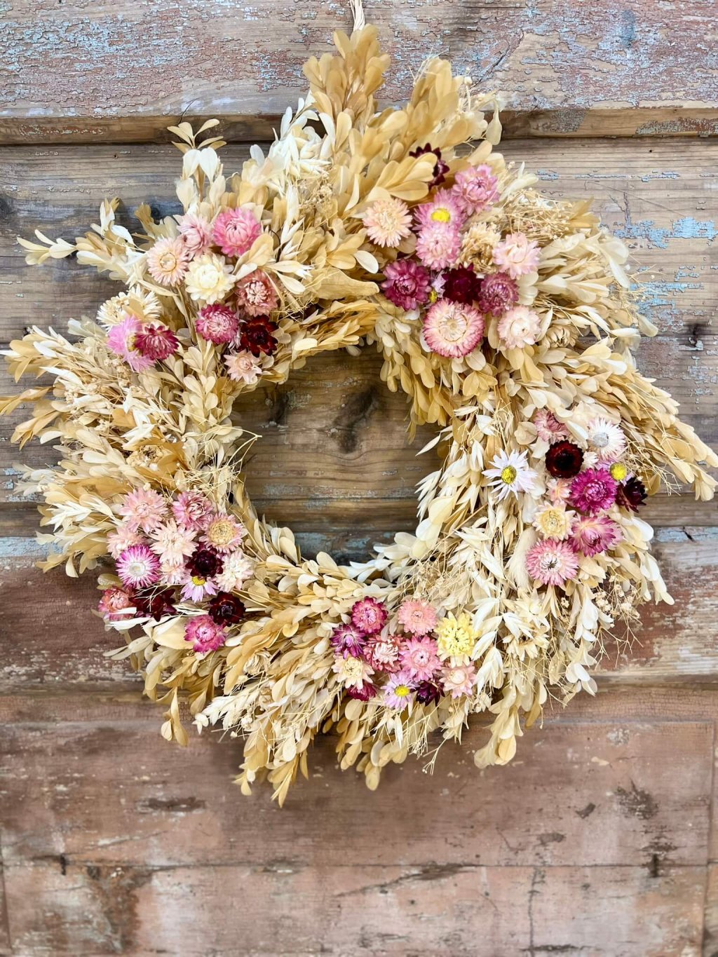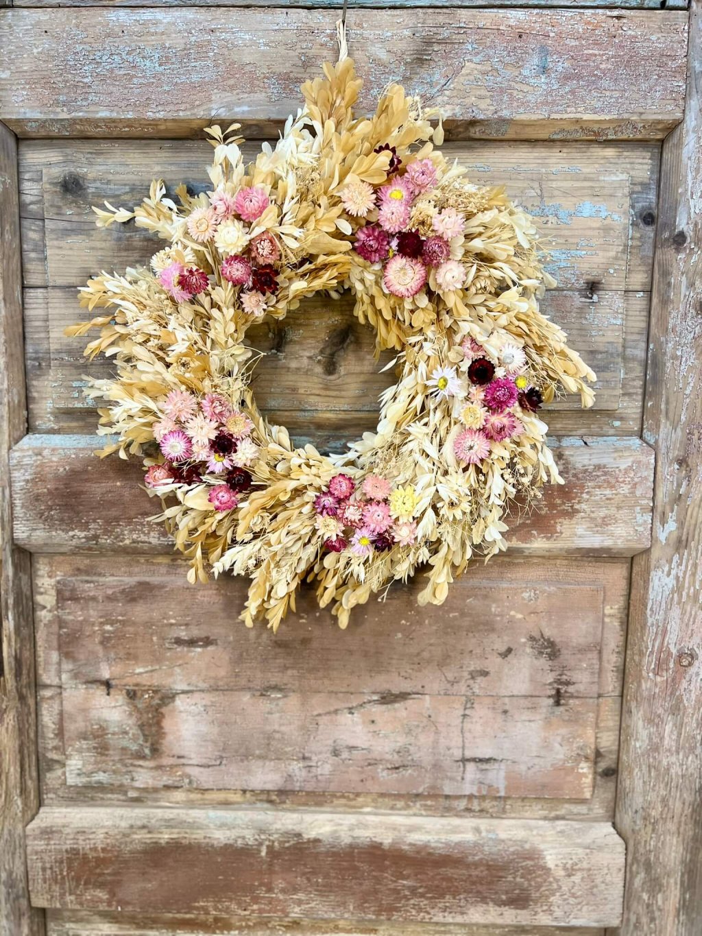 Tento veniec zo sušených kvietkov a stabilizovaných buxusových vetvičiek má v sebe pokoj vidieckeho dvora aj jemnú nežnosť lúčnych kvetov. Je to dekorácia, ktorá nepôsobí stroho – práve naopak, rozžiari dvere či stenu prirodzenou krásou bez pátosu.