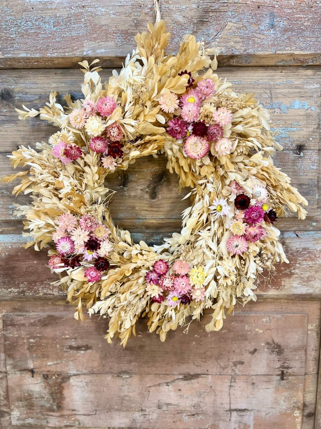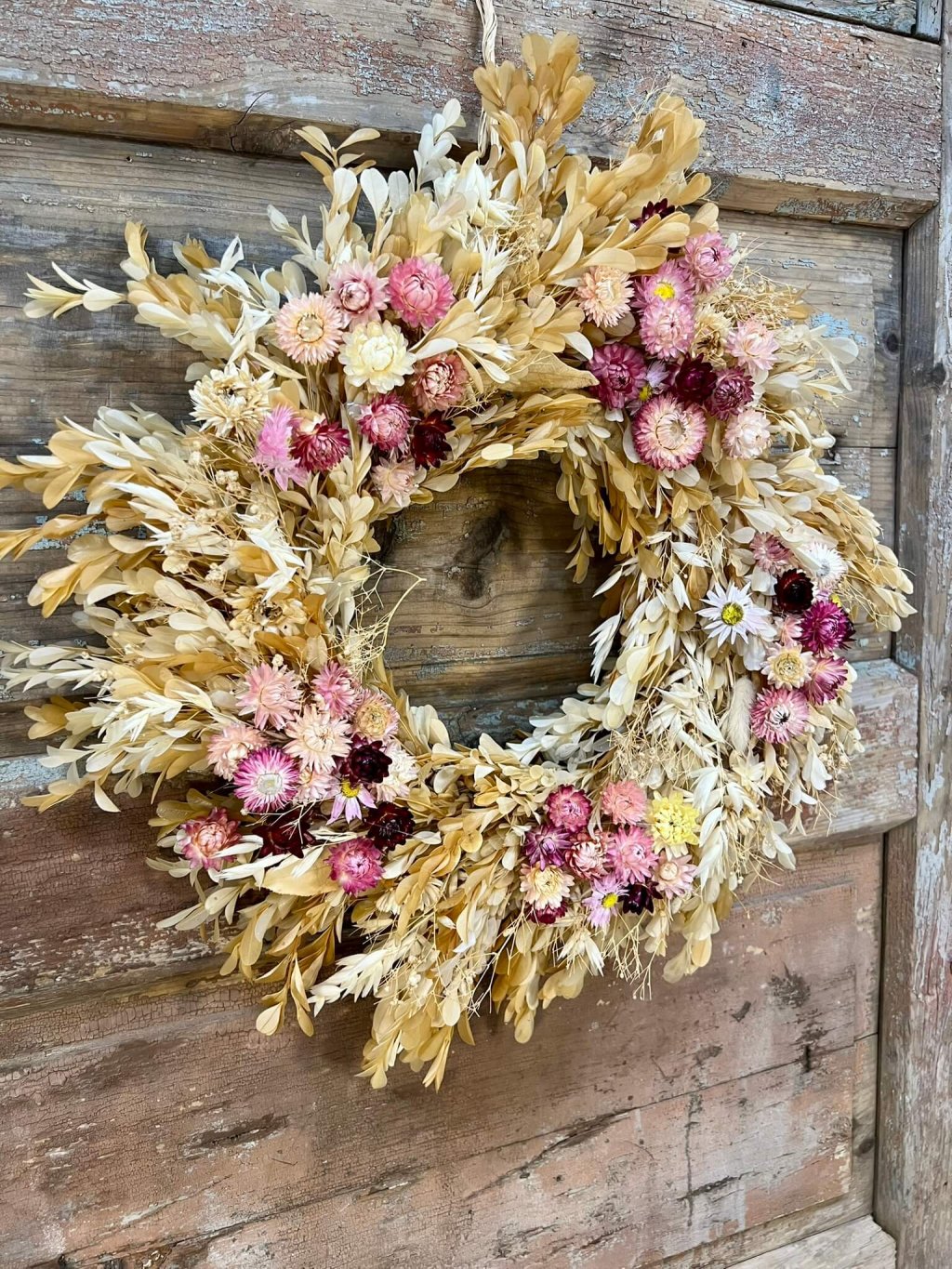 Priemer venca je 40 cm, čo z neho robí ideálnu veľkosť na vchodové dvere aj interiér. Základ tvoria odfarbené buxusové vetvičky, ktoré pôsobia jemne a neutrálne. Do nich sú vsadené slamienky v odtieňoch ružovej, krémovej a vínovej, ktoré dekorácii dodávajú romantický, no stále veľmi prirodzený vzhľad. Vďaka sušeným materiálom si zachová svoju krásu dlhý čas bez potreby starostlivosti.