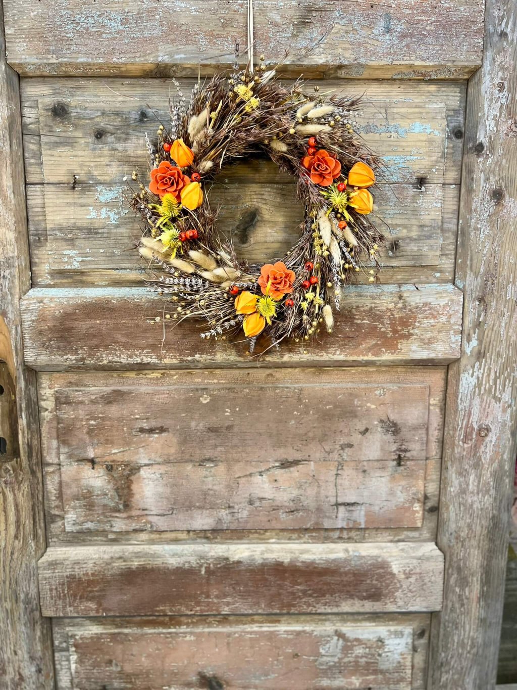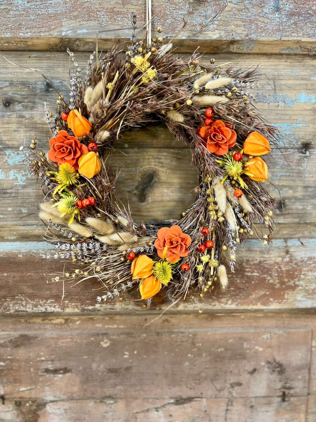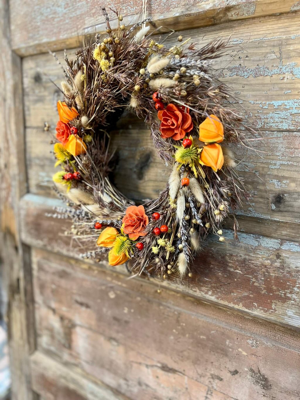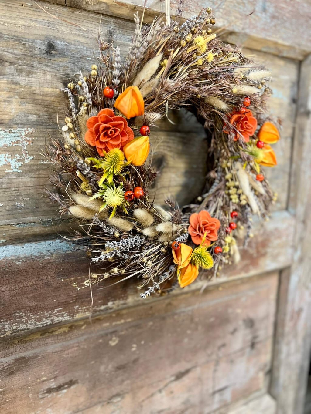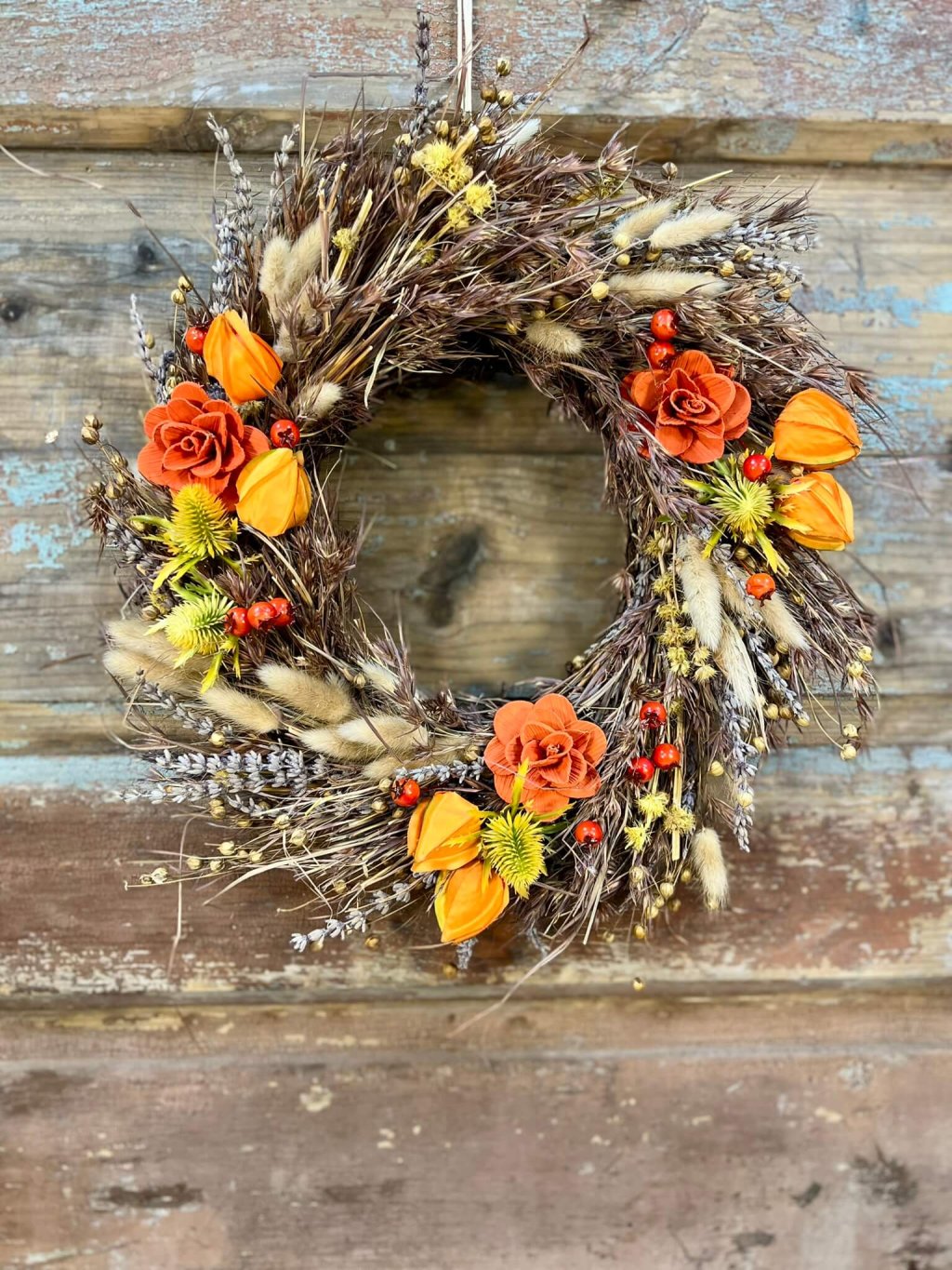 Jednoduchý, no plný života – tento veniec spája oranžové tóny drevených kvetov a physalisu s kontrastom levandule, bodliakov a lúčnych tráv. Výsledkom je dekorácia, ktorá pôsobí ako malý ohník jesene, čo rozžiari každý priestor.