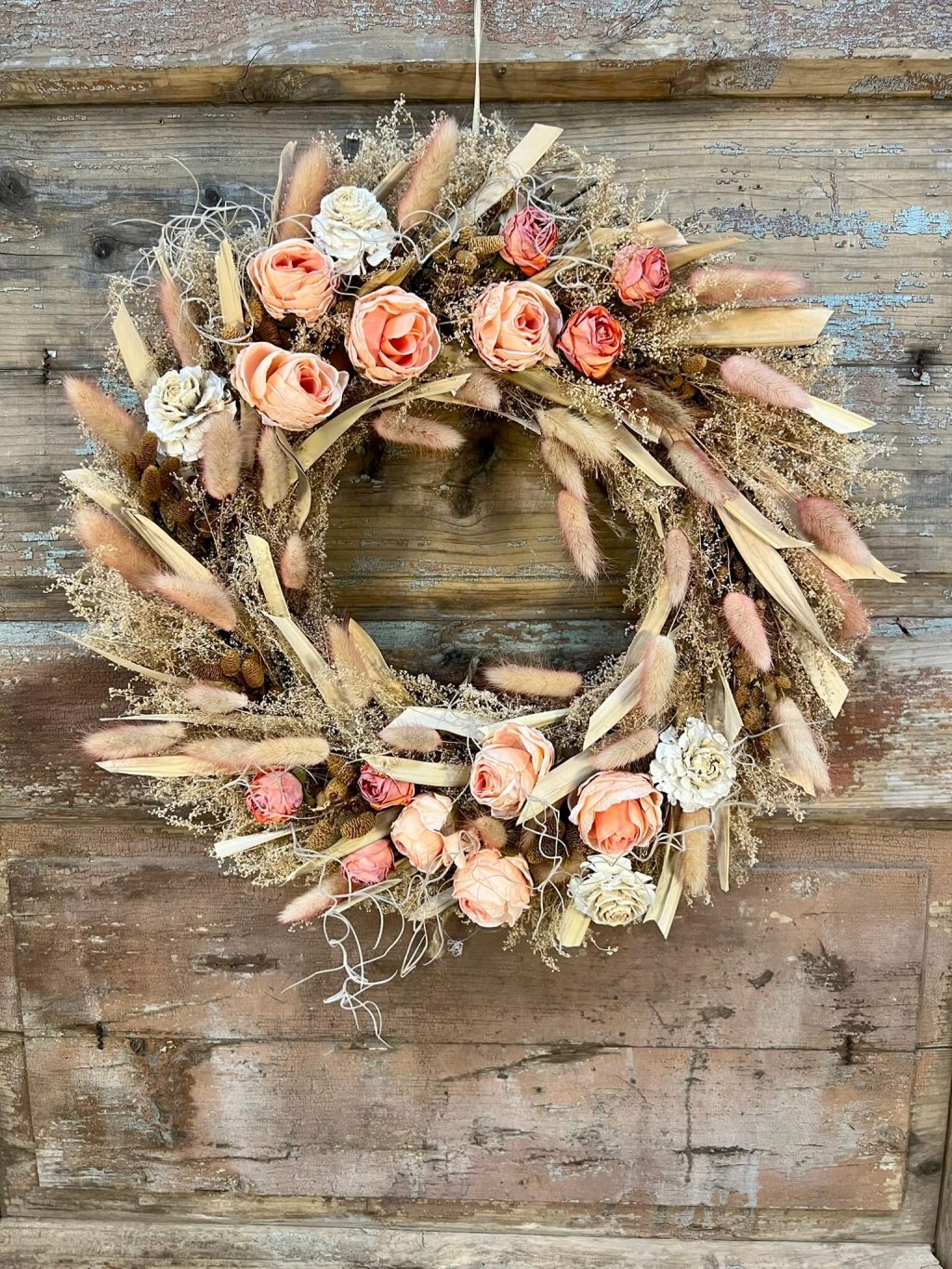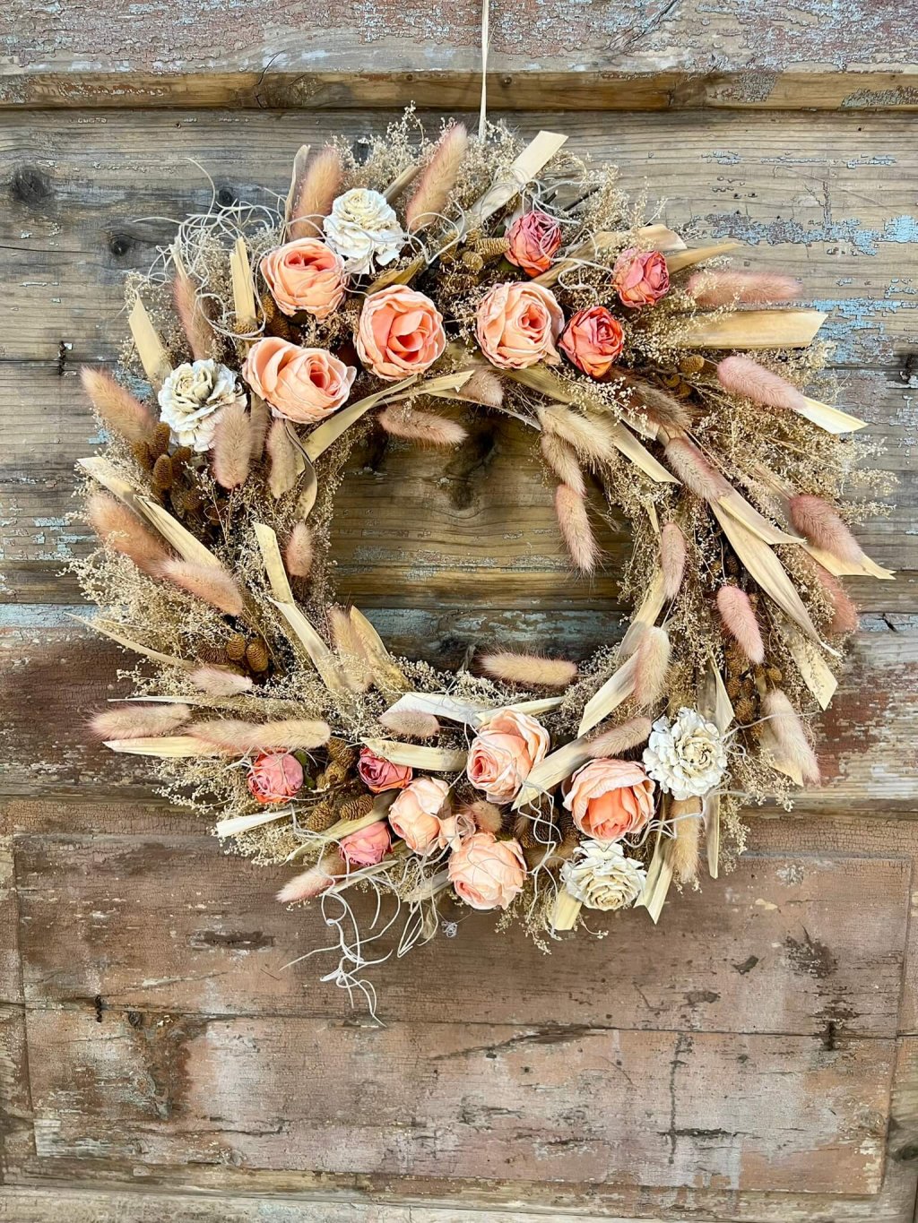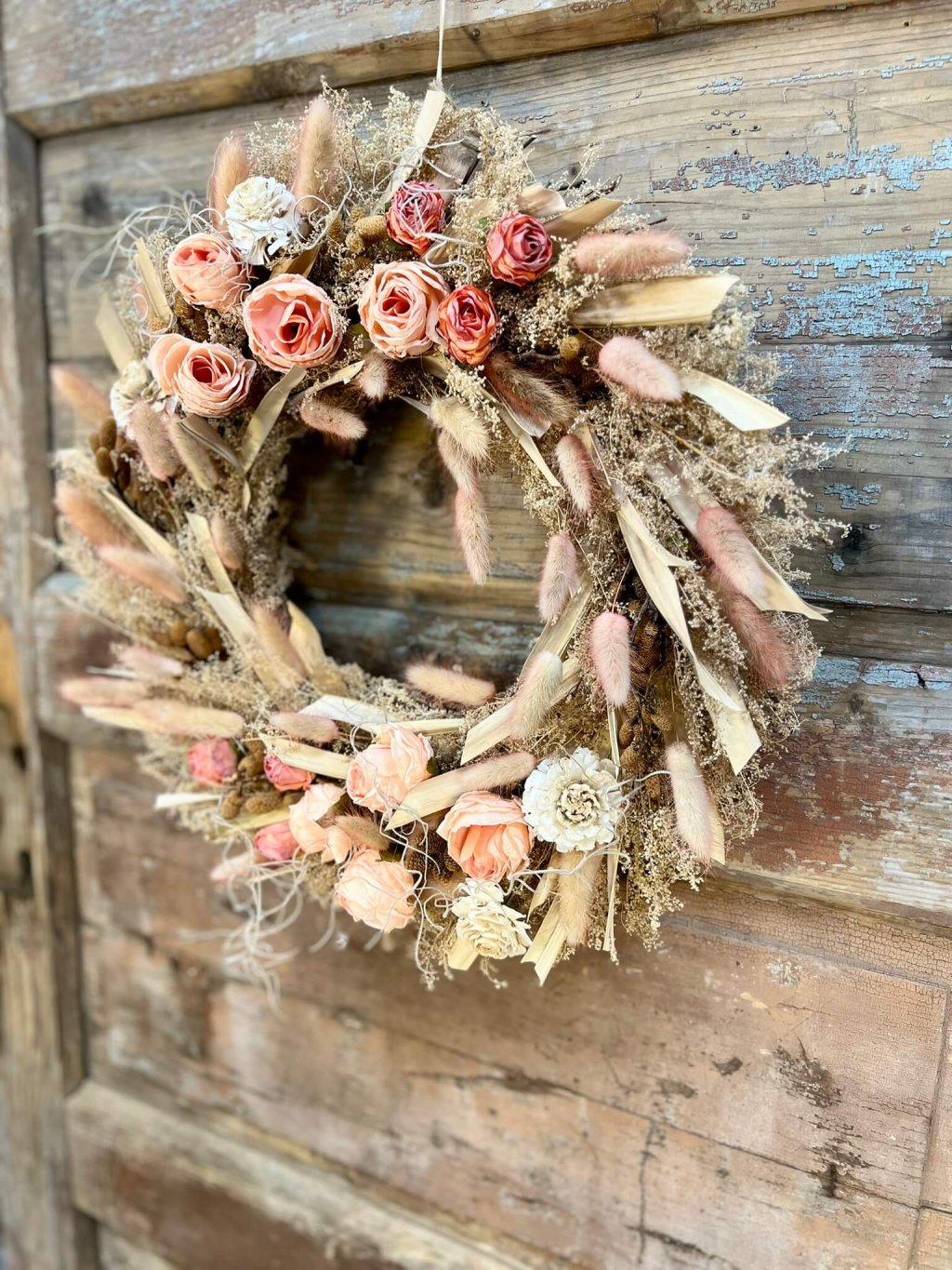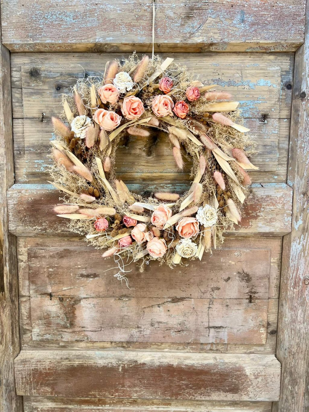 Kombinácia lososových, krémových a jemne malinových ruží vytvára romantickú časť kompozície, zatiaľ čo suché klasy a trávy dodávajú dekorácii pohyb a prirodzenú štruktúru. Výsledok je harmonický, teplý a univerzálny – vhodný nielen na dvere, ale aj ako dekorácia steny či stola.