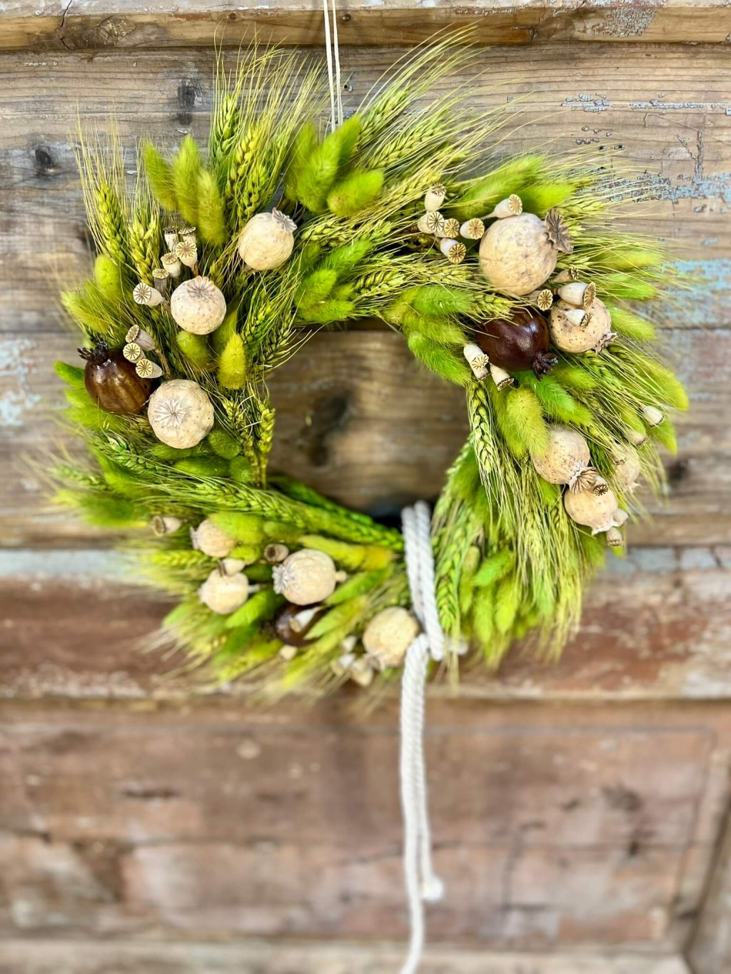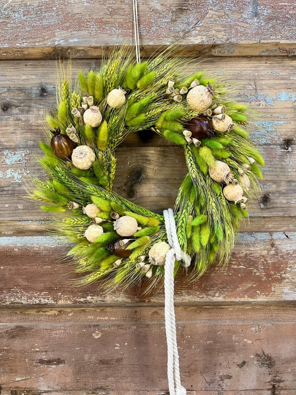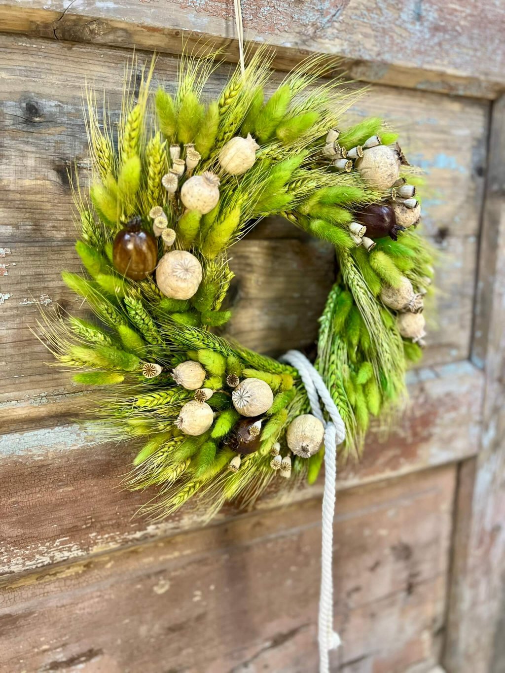 Ak hľadáte veniec, ktorý pôsobí sviežo a netradične, práve ste ho našli. Zelené klasy obilnín spolu so sušenými makovicami vytvárajú dekoráciu, ktorá v sebe spája energiu leta a pokoj vidieckych polí.