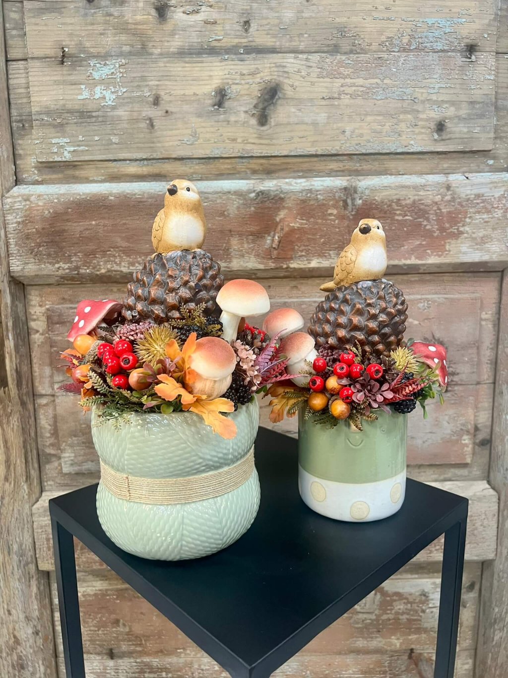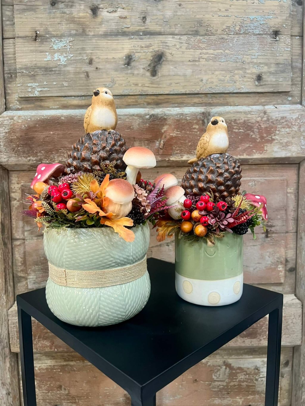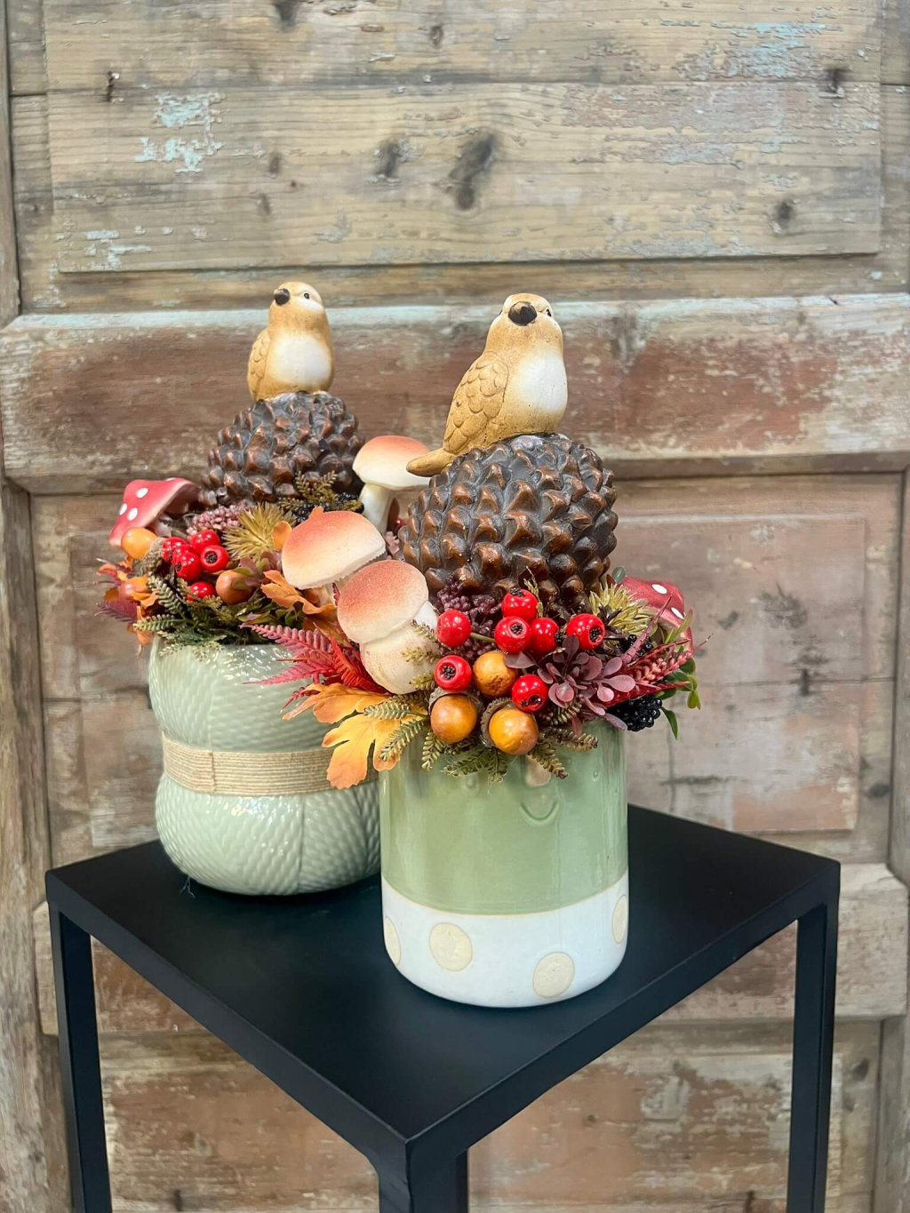 Obidva aranžmány sú zdobené šiškami, realistickými penovými hríbikmi, červenými bobuľami a jesennými lístkami. Vrcholom je milý vtáčik sediaci na šiške, ktorý dodáva dekorácii hravosť a jemný úsmev.