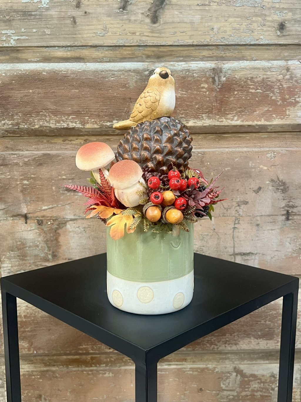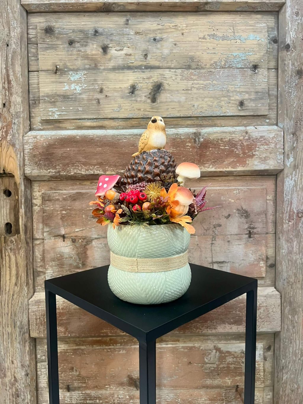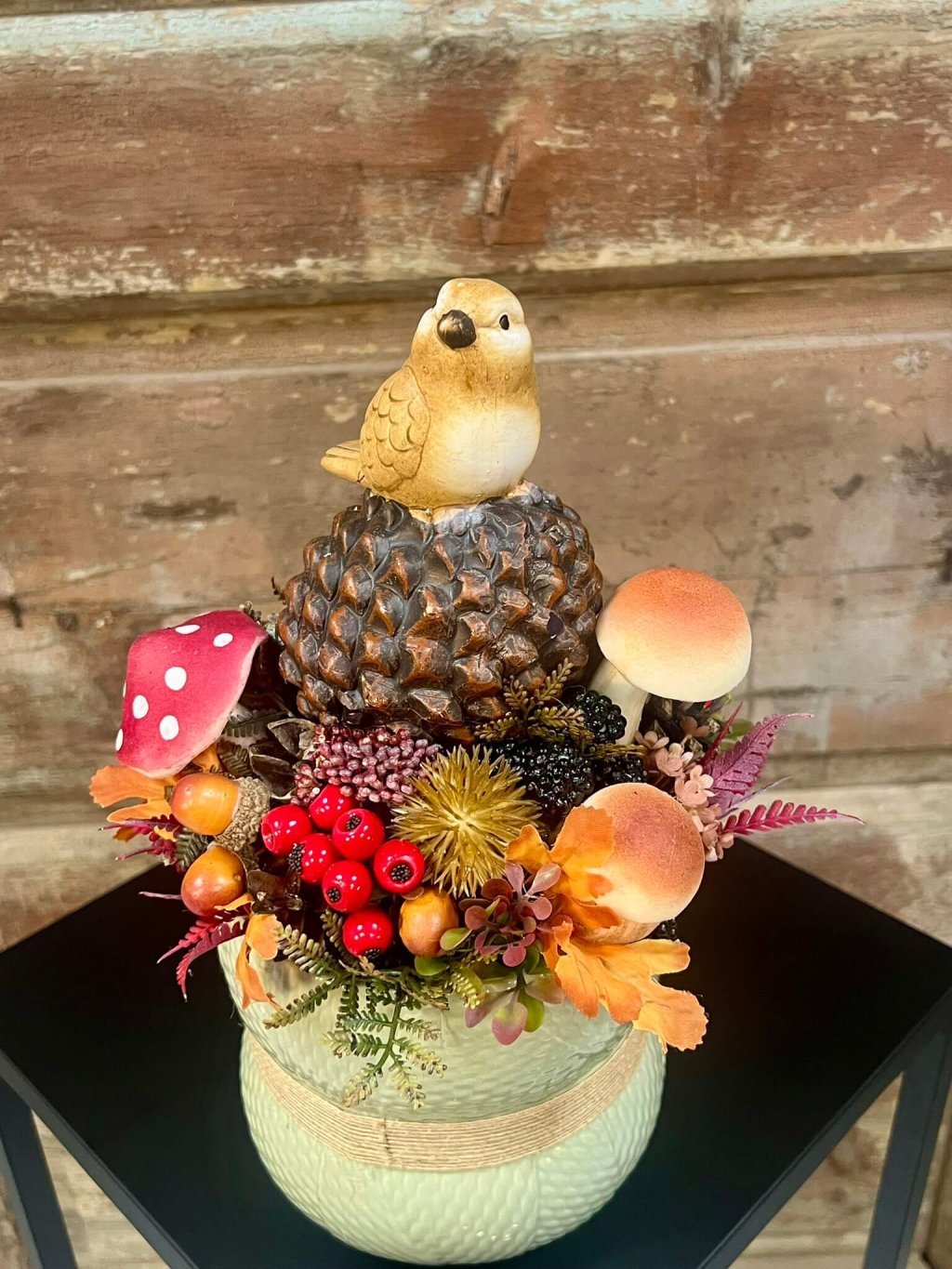 Obidva aranžmány sú zdobené šiškami, realistickými penovými hríbikmi, červenými bobuľami a jesennými lístkami. Vrcholom je milý vtáčik sediaci na šiške, ktorý dodáva dekorácii hravosť a jemný úsmev.