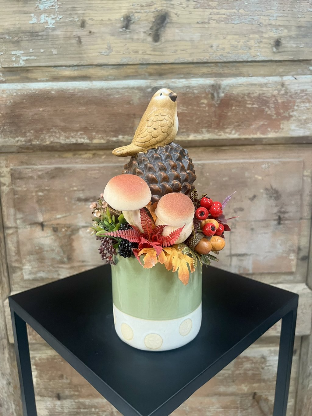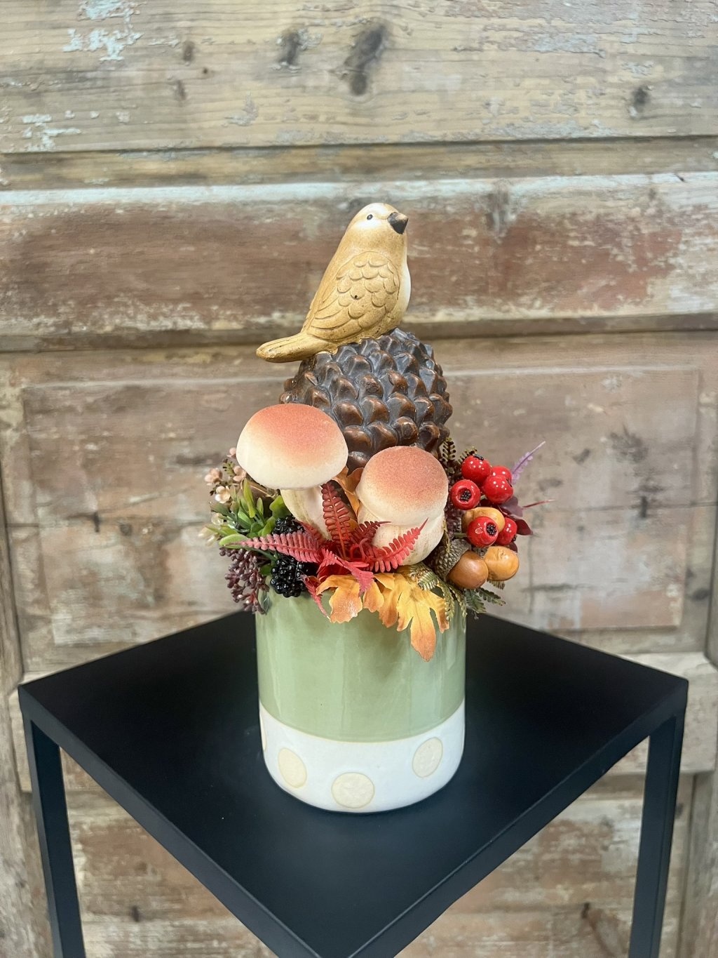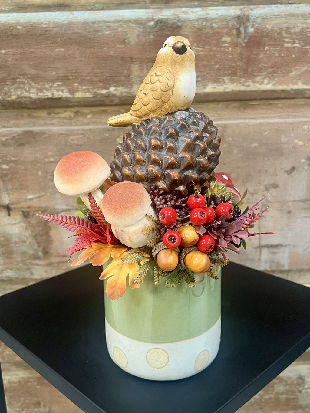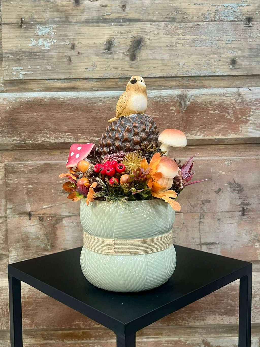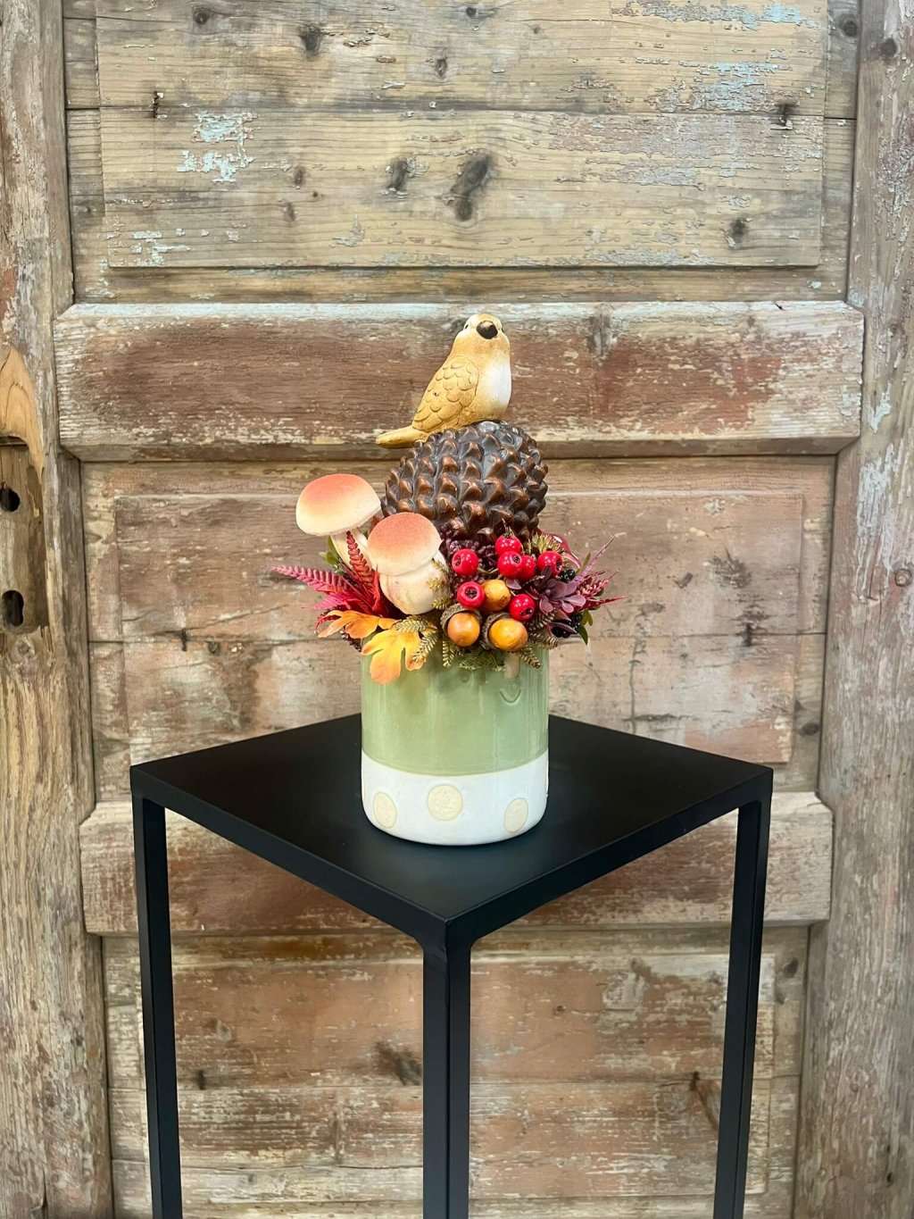 Rozkošná jesenná dekorácia, ktorá pôsobí, akoby ste si priniesli kúsok lesa priamo domov. Figúrka vtáčika sediaceho na šiške, obklopeného hríbikmi a bobuľami, vytvára veselú a útulnú atmosféru – ideálnu na oživenie poličky, stola či parapetu.
