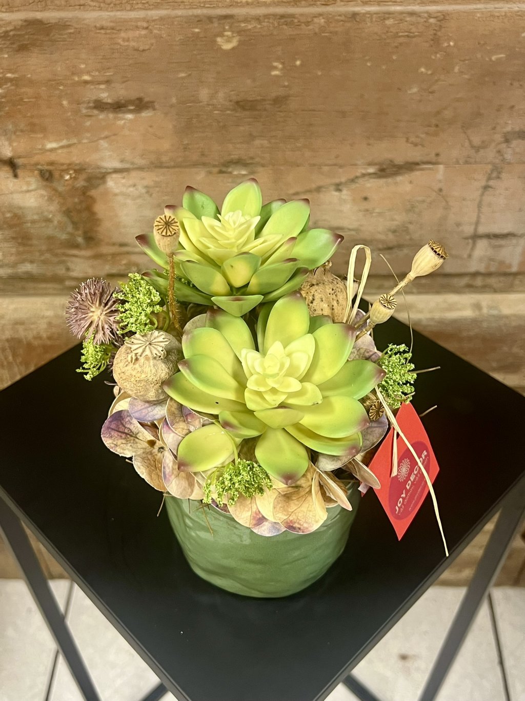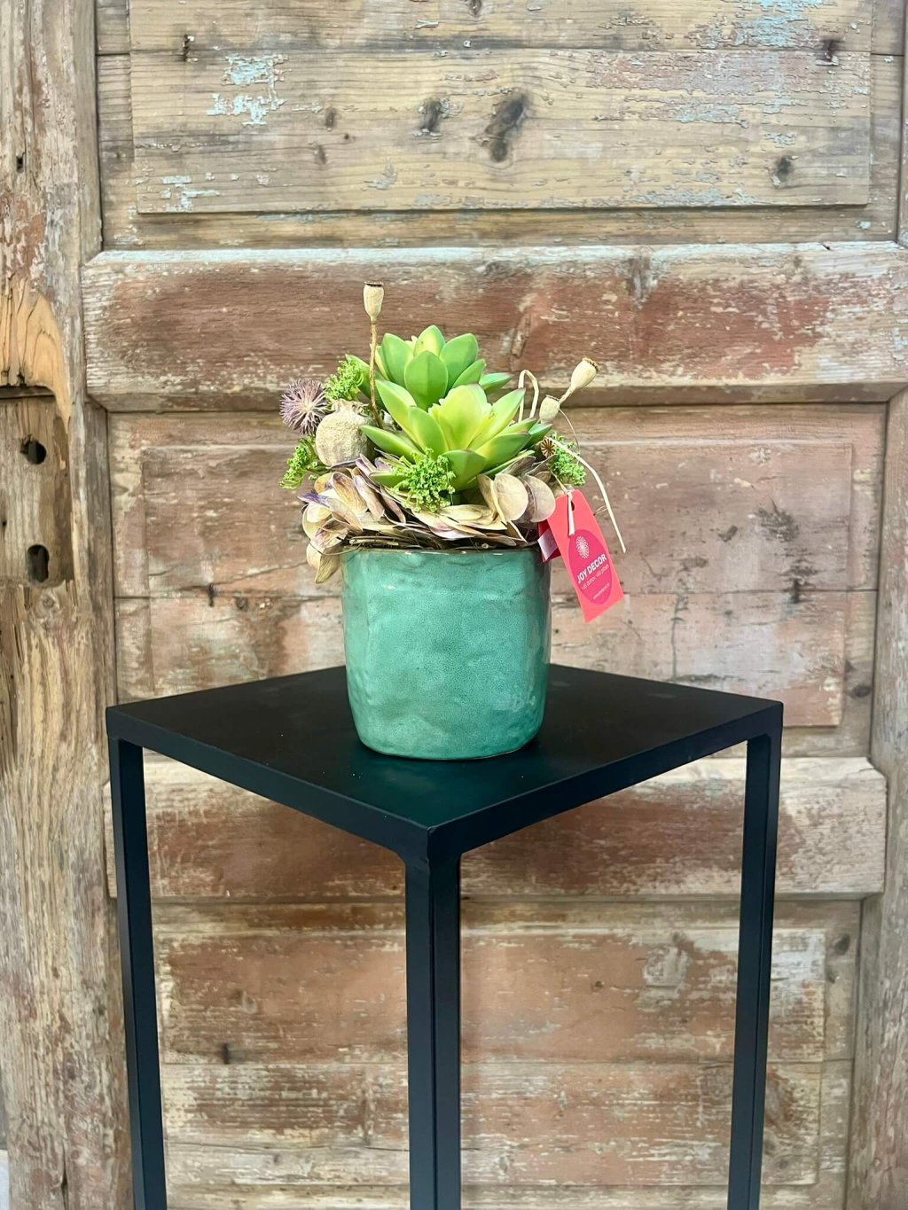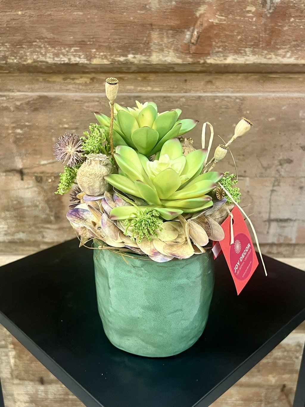 Aranžmán Zelený sukulent v keramike je tvorený dominantným umelým sukulentom doplneným o makovice, bodliaky a jemné sušené detaily. Je zasadený do keramického kvetináča v zelenom odtieni, ktorý ladí s prírodnou farebnosťou celku.