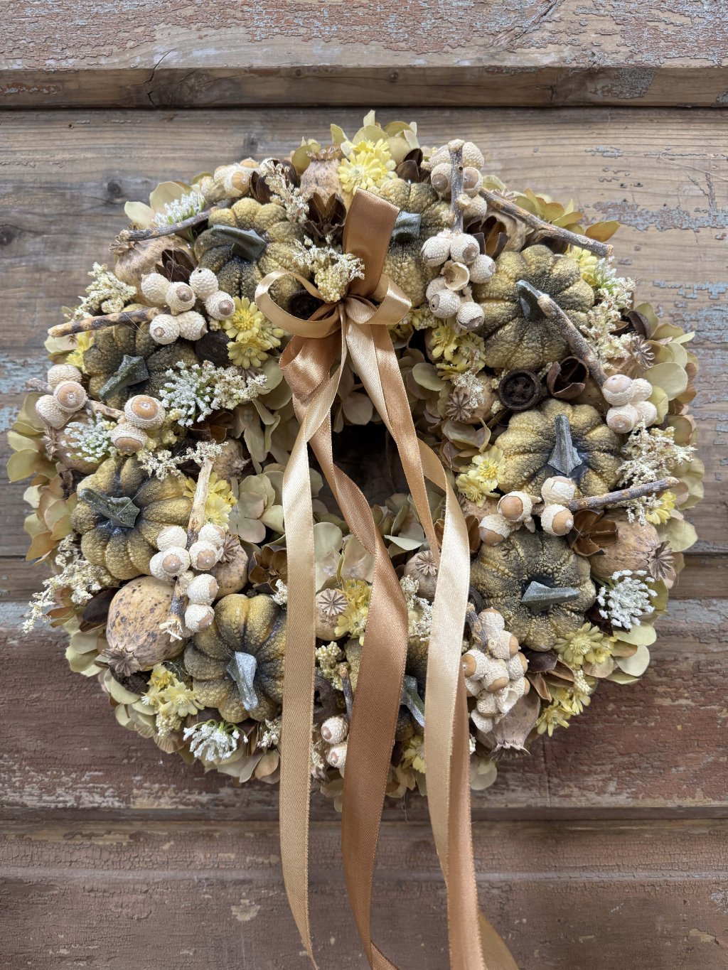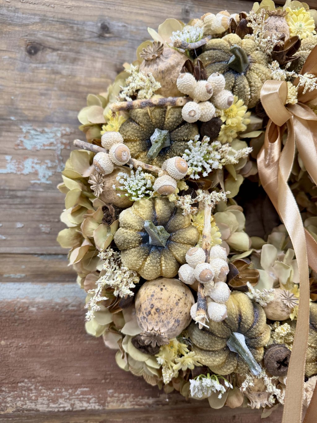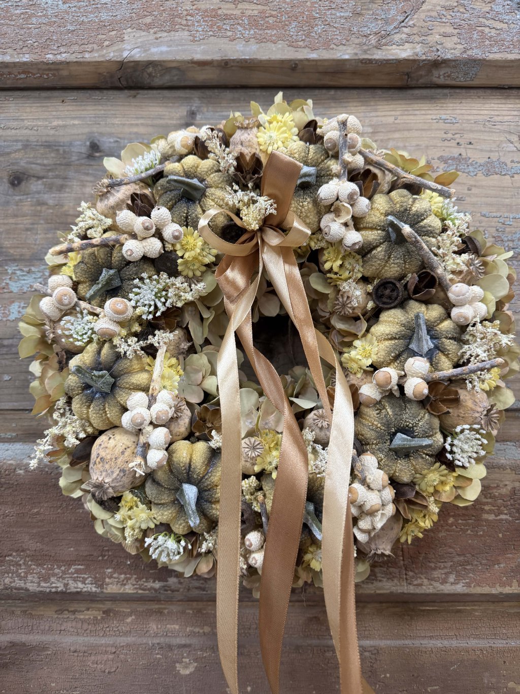Tento ručne aranžovaný veniec s priemerom 35cm spája umele tekvičky, drobné makovice, mini žaluďe a hlavičky sušených hortenzií, ktoré spolu vytvárajú bohatú, no vyváženú kompozíciu. Saténová mašľa v teplom zlatohnedom tóne dodáva jemný lesk a eleganciu. Veniec je ľahký, trvácny a bezúdržbový, ideálny pre tých, ktorí chcú mať krásnu jesennú výzdobu bez starostí.