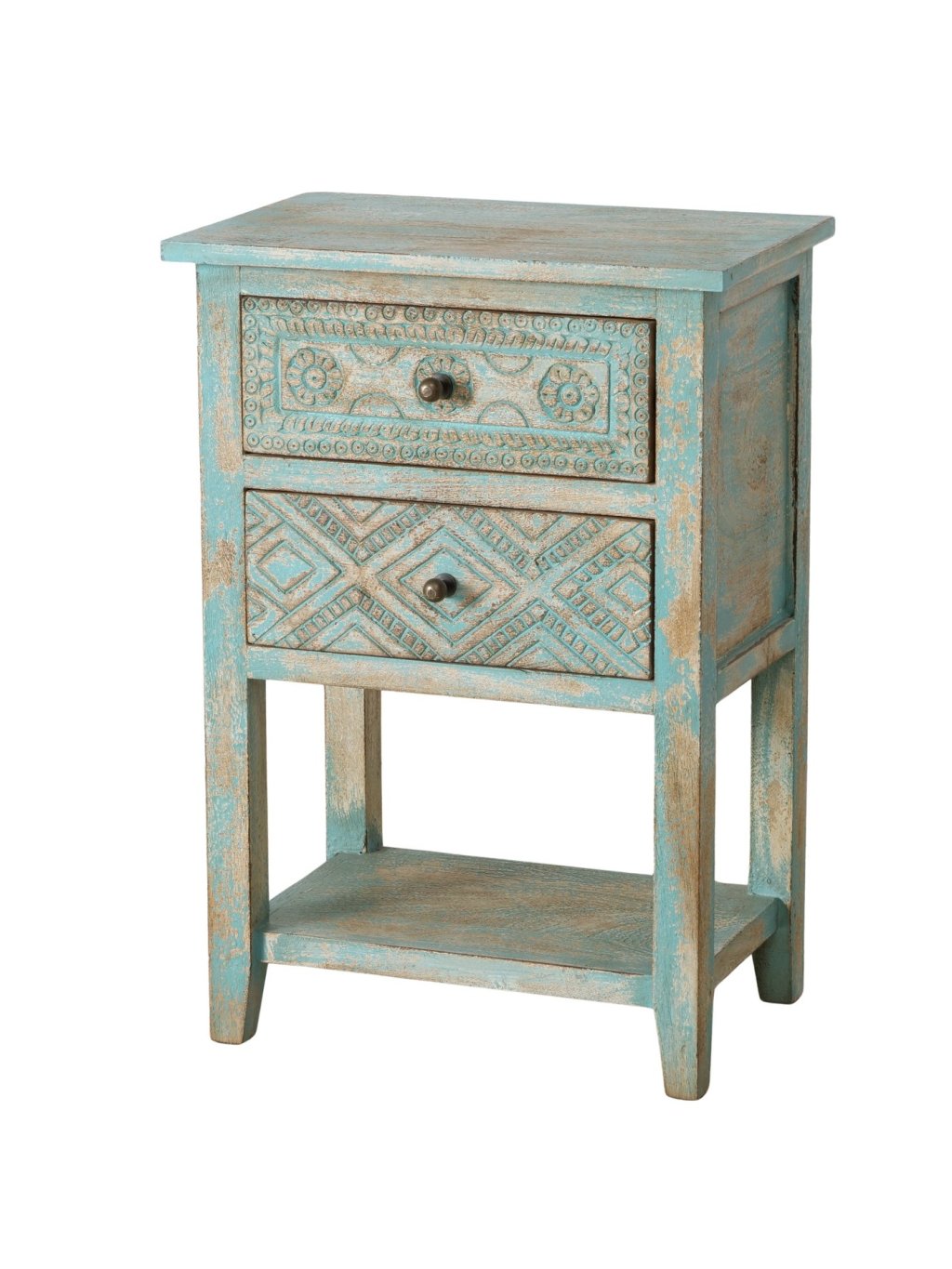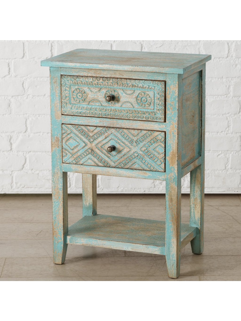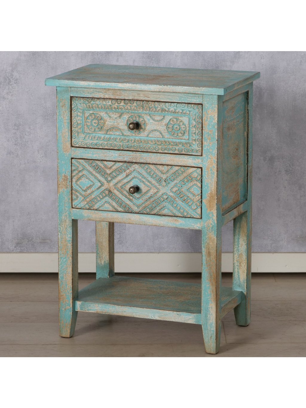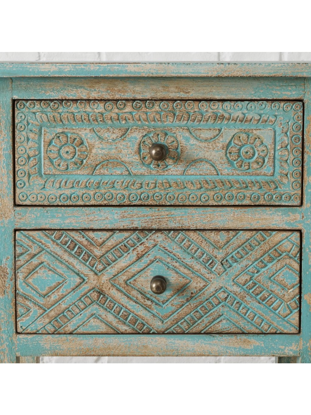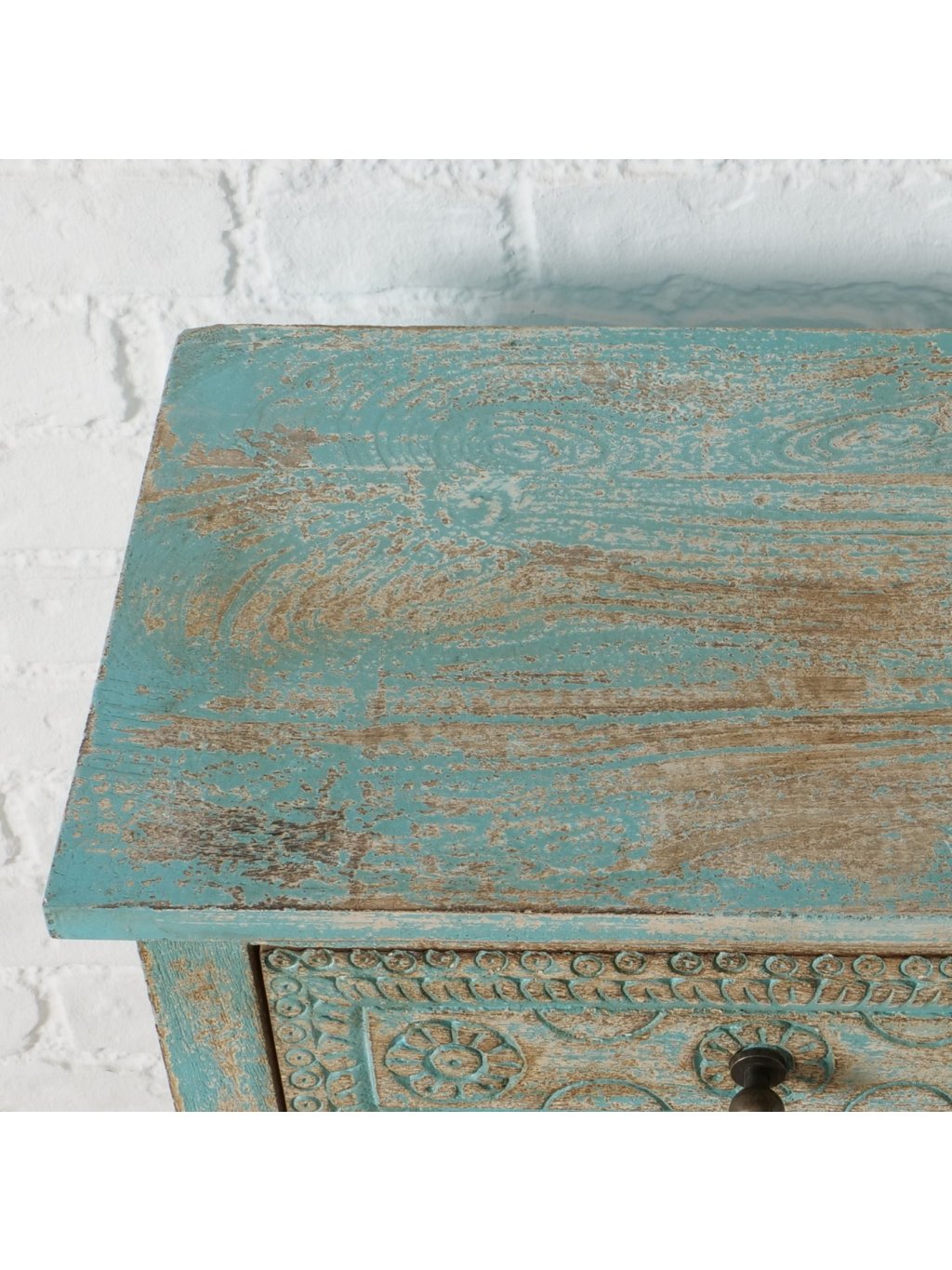 Ručne vyrezávané detaily, autentická patina a tyrkysovo-prírodný farebný mix z nej robia výrazný dizajnový prvok, ktorý okamžite zútulní interiér a dodá mu osobitosť.