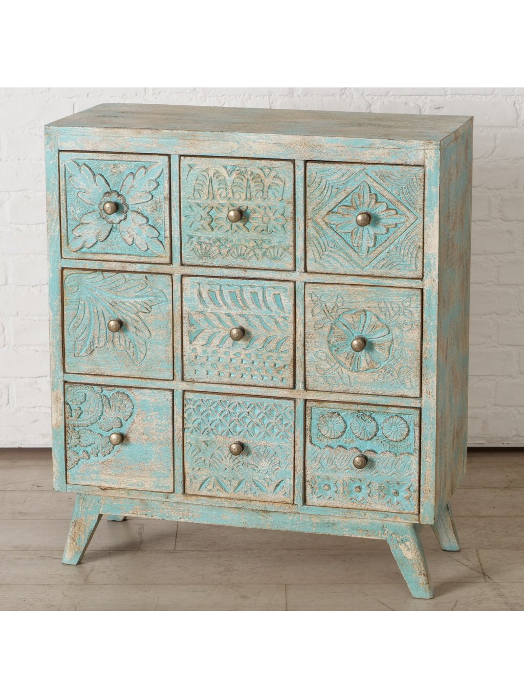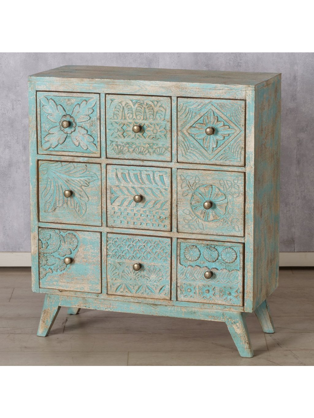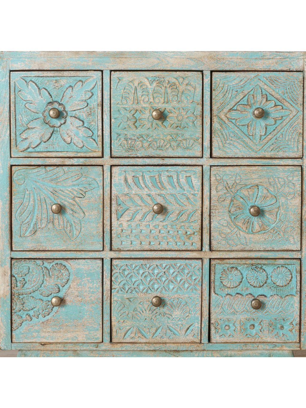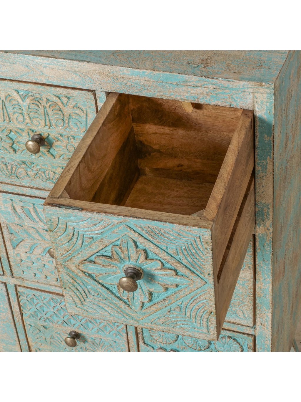 Každá zo zásuviek má odlišný ručne vyrezávaný vzor, vďaka čomu pôsobí komoda mimoriadne dekoratívne a zároveň harmonicky. Jemná tyrkysovo-prírodná farebnosť s efektom prirodzeného „zostarnutia“ dodáva komode vintage až boho nádych, ktorý krásne zapadne do interiérov v štýle boho, vidiek, etno aj eklektický interiér.