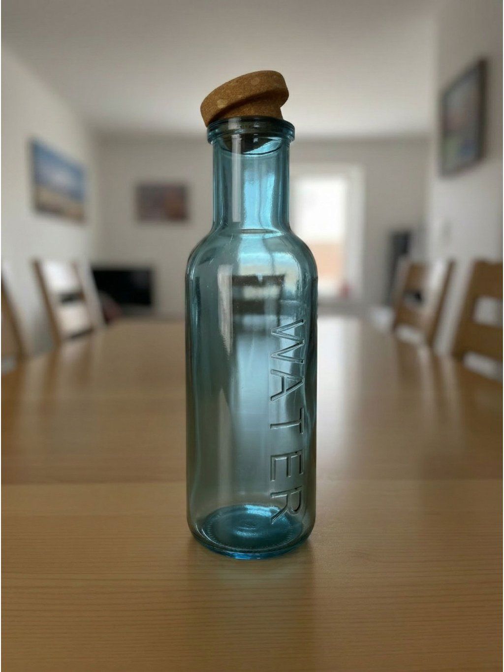 Fľaša je vyrobená z farebného skla v jemnom modrom tóne, ktorý pôsobí ľahko a osviežujúco. Jej hladký tvar je doplnený o reliéfny nápis „WATER“, ktorý podčiarkuje jej praktické využitie. Korkový uzáver nielen dobre tesní, ale zároveň dodáva celku prírodný akcent. S objemom 1 liter je ideálna na podávanie vody, domácich limonád či iných nápojov. Vynikne na jedálenskom stole, v kuchyni aj pri letnom stolovaní na terase.