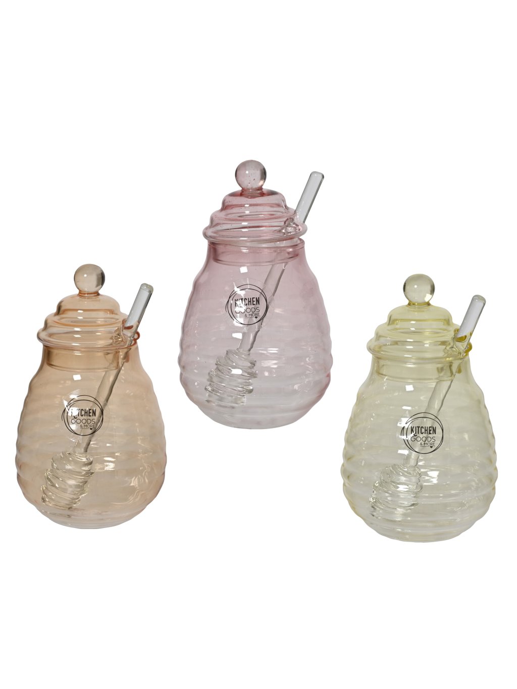Tieto sklenené nádoby na med spájajú funkčnosť s jemnou estetikou. Pastelové tóny pôsobia ľahko, sviežo a prirodzene – presne tak, ako máme radi v kuchyni aj pri stole.