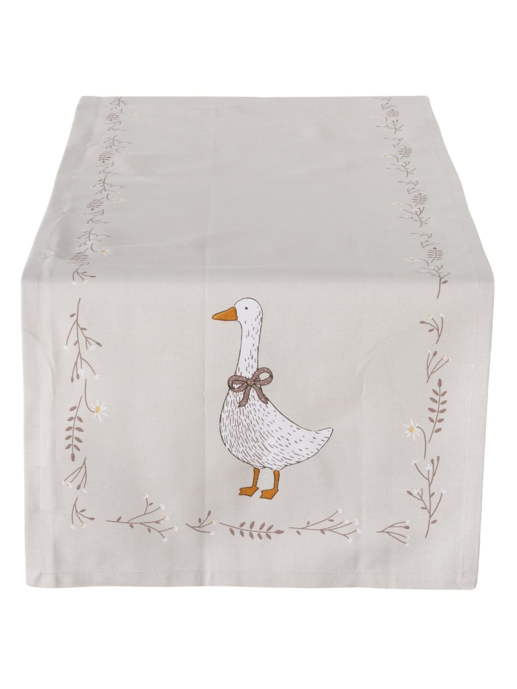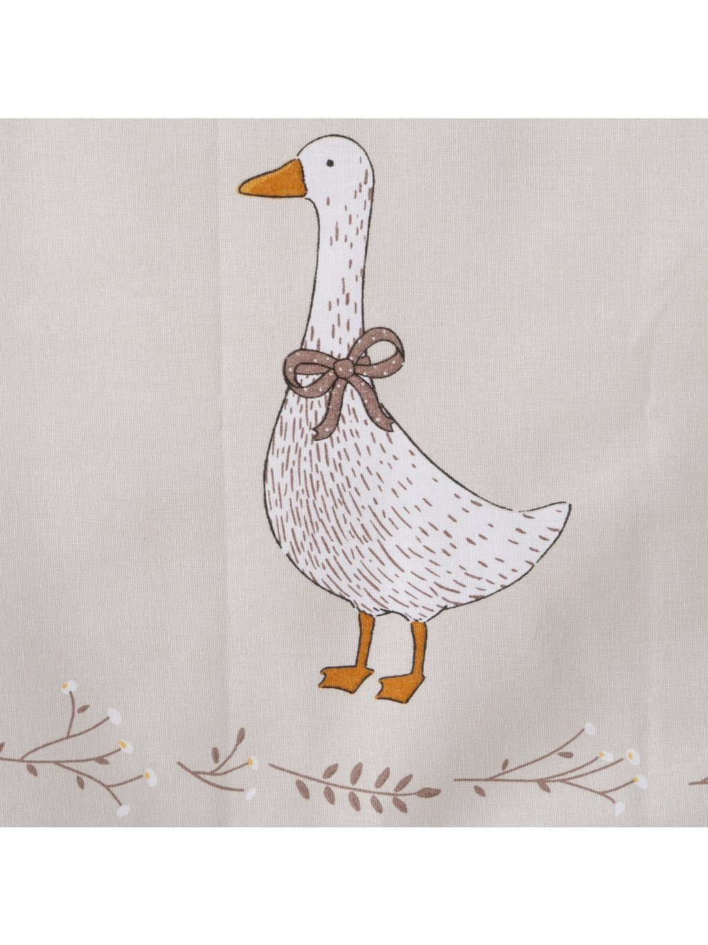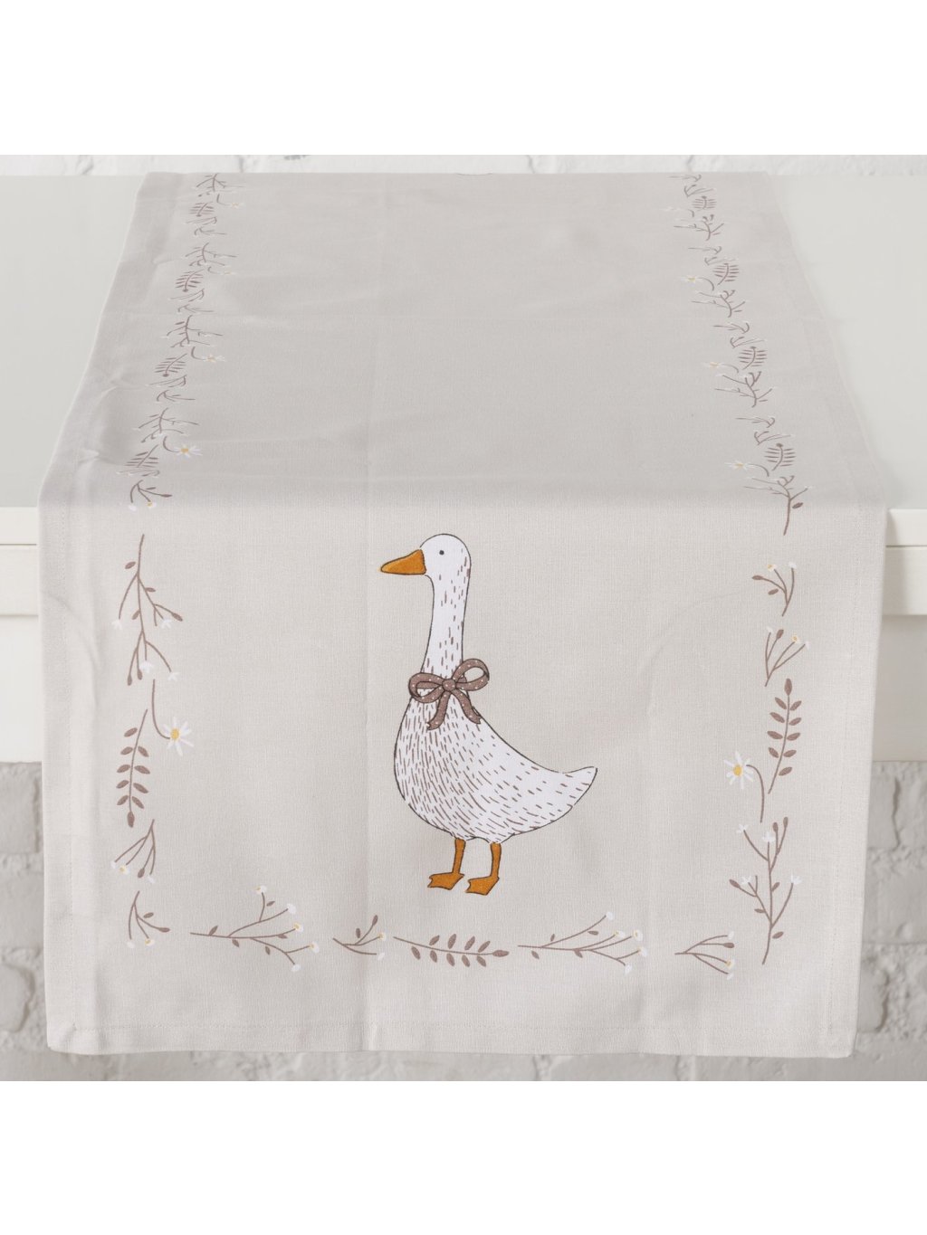 Stredový obrus s rozmerom 40 x 140cm, z 100 % bavlny s milým motívom húsky a drobných kvetov pôsobí prirodzene a čisto.