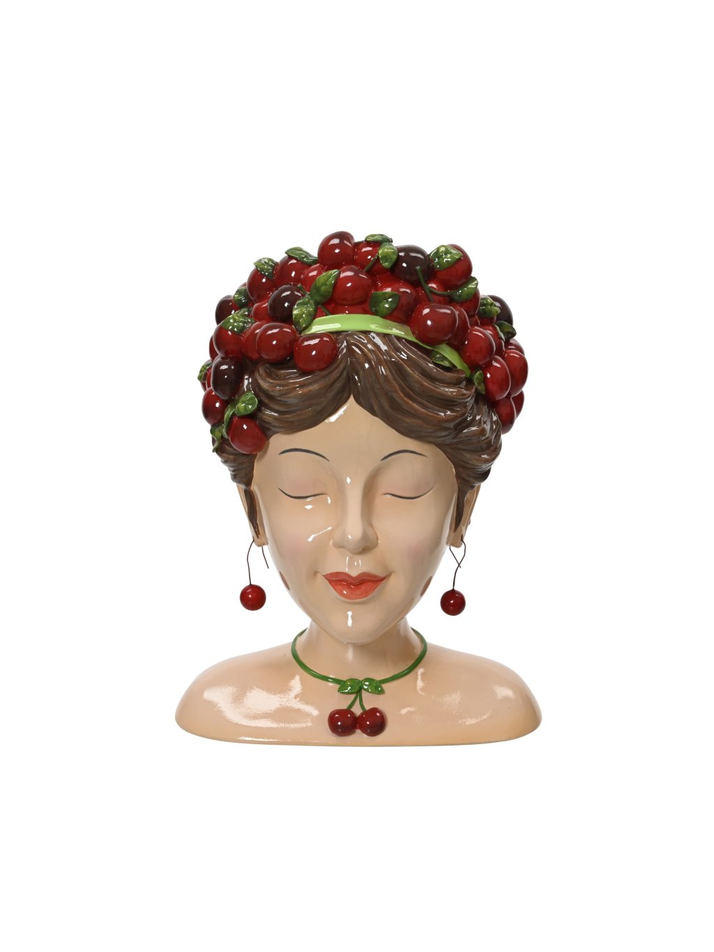 Plastická tvár s jemnými črtami dopĺňa bohatá „účesová“ dekorácia z lesklých čerešní, ktorá pôsobí hravo, no zároveň vkusne. Každý kus je ručne vyrobený, čo mu dodáva osobitosť a mierne odlišnosti – presne tie, ktoré robia dekoráciu živou. Polyresinový materiál je praktický, odolný a má vodoodpudivý povrch, takže sa nemusíte báť ani menších rastlín či byliniek. Tento kvetináč krásne zapadne do moderného interiéru, ale aj do kreatívneho, eklektického domova.