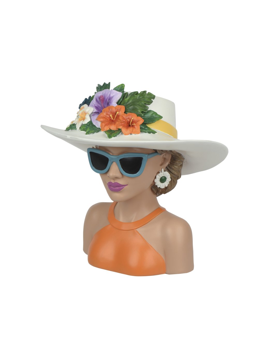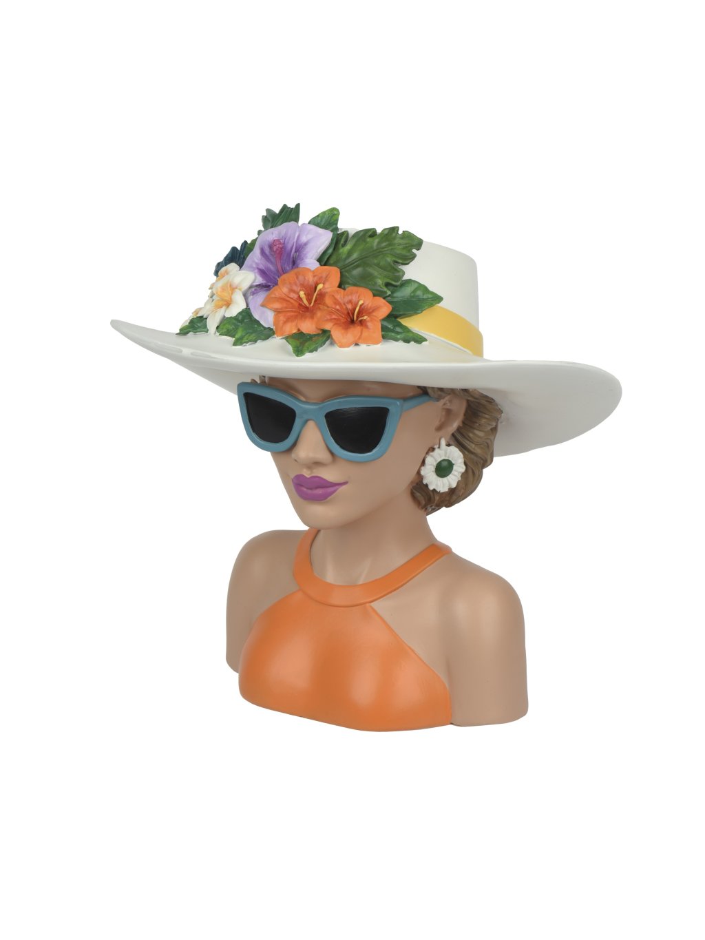 Detailne spracovaná ženská postava so slnečnými okuliarmi a bohato zdobeným klobúkom s kvetmi priťahuje pohľady z každého uhla.