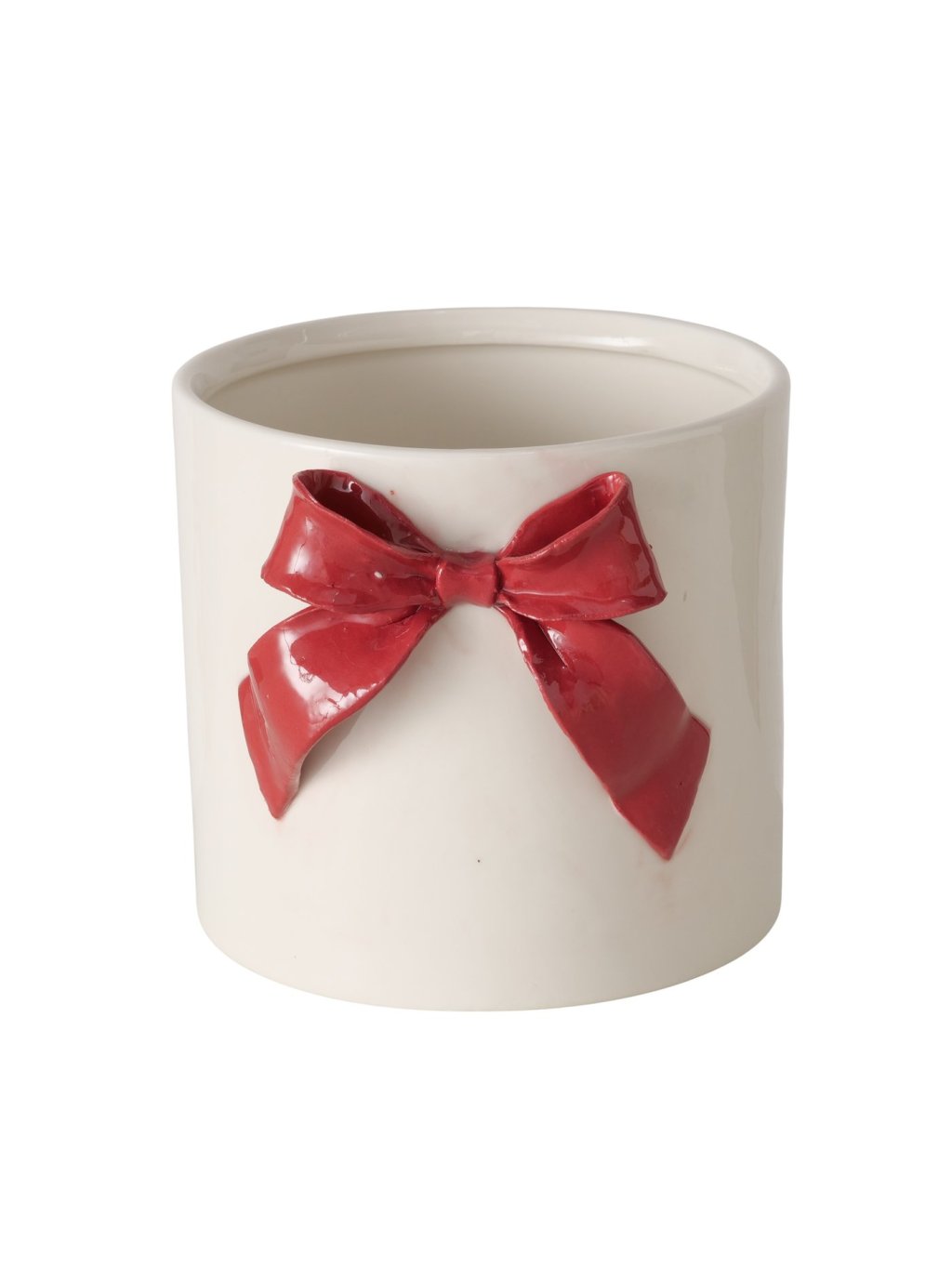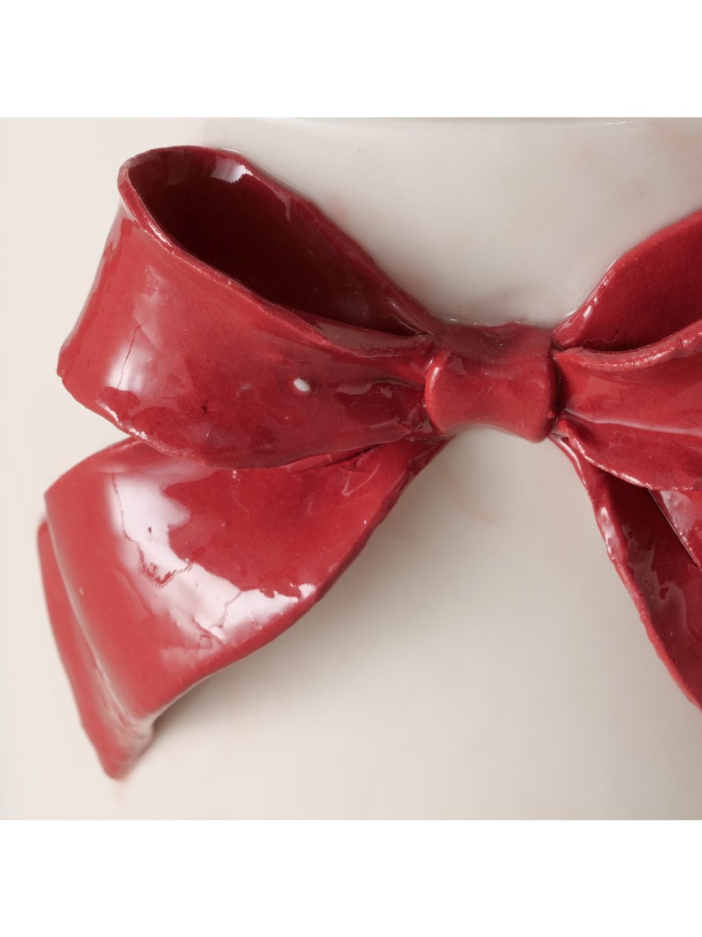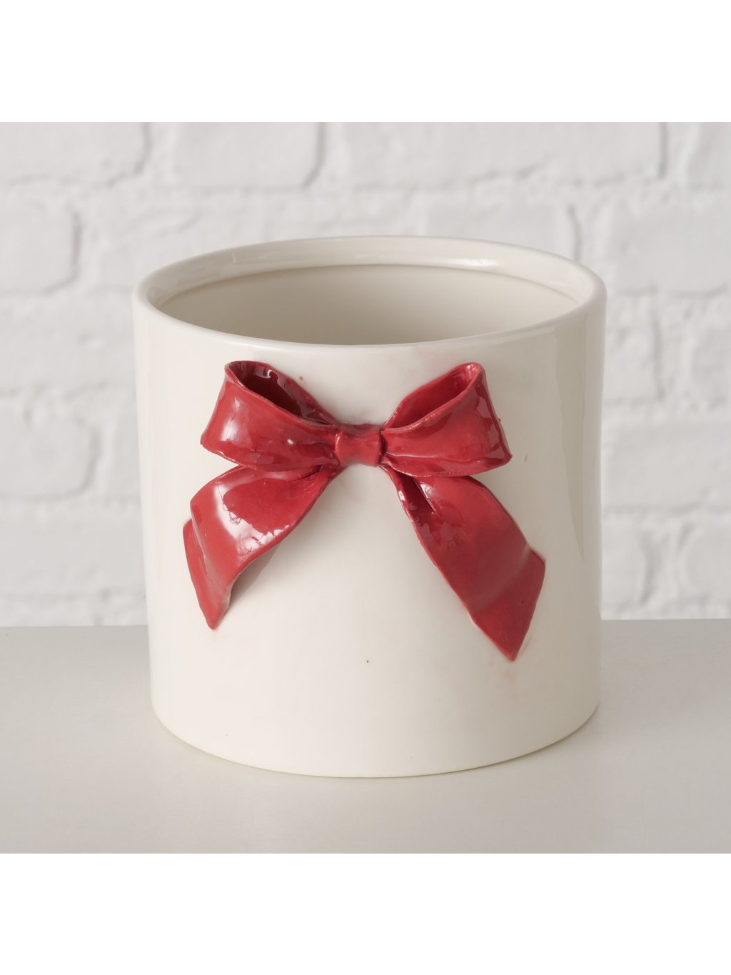 Obal na kvetináč Bow s výškou 12,4cm je stvorený pre všetkých, ktorí si potrpia na malé, no výrazné detaily. Elegantná biela glazúra v kombinácii s plastickým reliéfom a červenou mašľou pôsobí jemne romanticky a okamžite prinesie sviatočný či hravý nádych do interiéru.