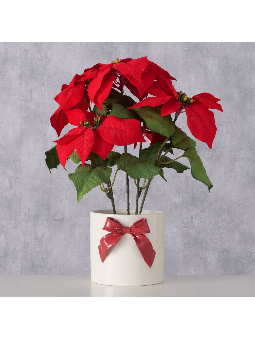 Vyrobený z kvalitného porcelánu s lesklou glazúrou, má rozmery 16 x 13,5 x 12,4cm. Jeho jednoduchý okrúhly tvar necháva vyniknúť rastlinku, zatiaľ čo mašľa pôsobí ako šperk. Vďaka ručnej práci má každý kus originálny charakter. Hodí sa nielen na Vianoce, ale aj po celý rok, keď chcete vytvoriť útulnú a osobnú atmosféru.