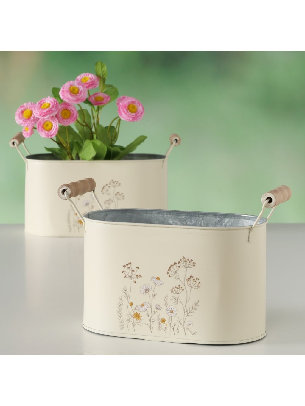 Plechové prevedenie v jemnom béžovom odtieni dopĺňa potlač kvetov a praktické uško s dreveným detailom 🤍 Krásny na jarné kvety, bylinky aj drobné rastlinky – samostatne aj v kombinácii oboch veľkostí.