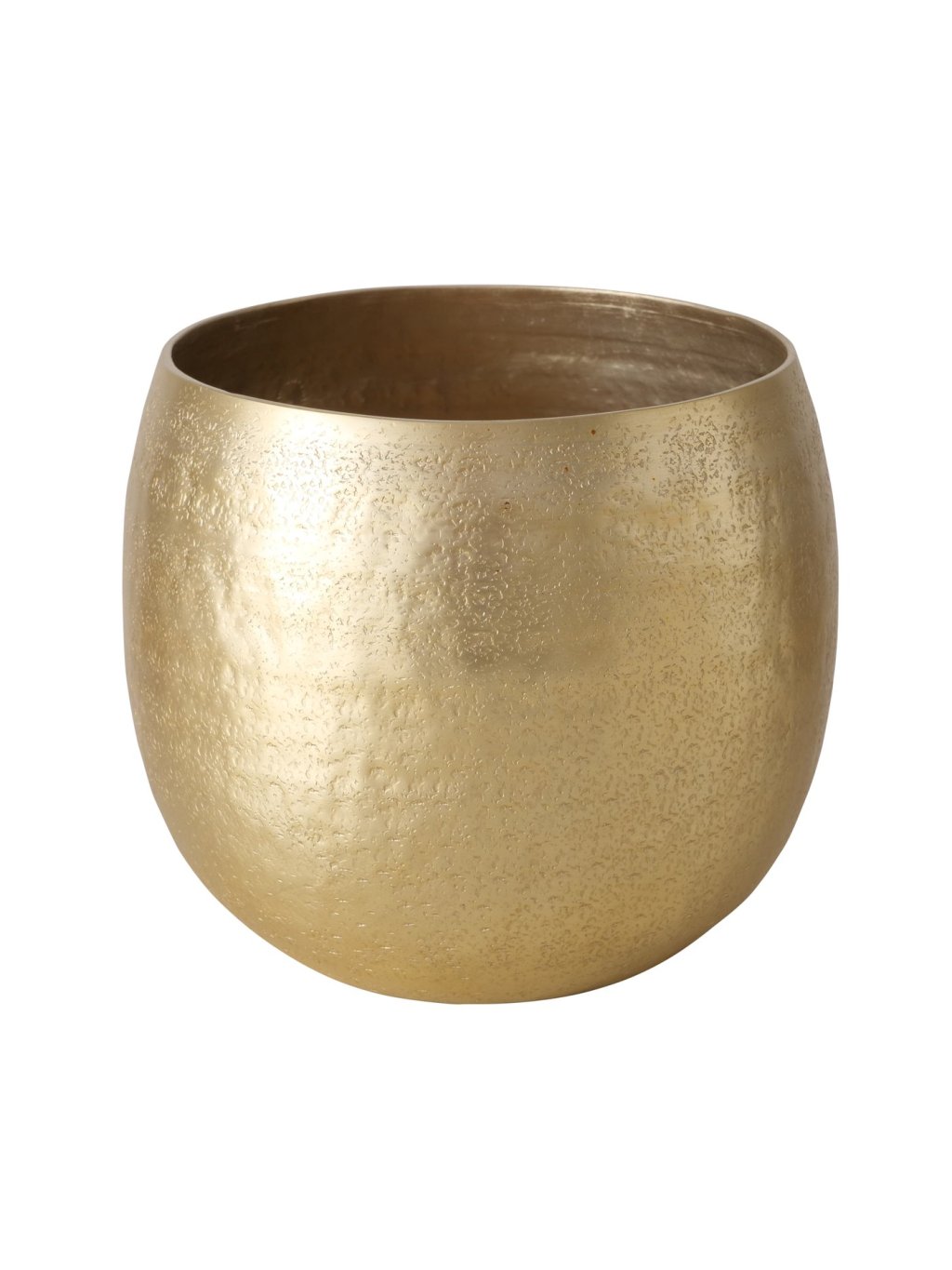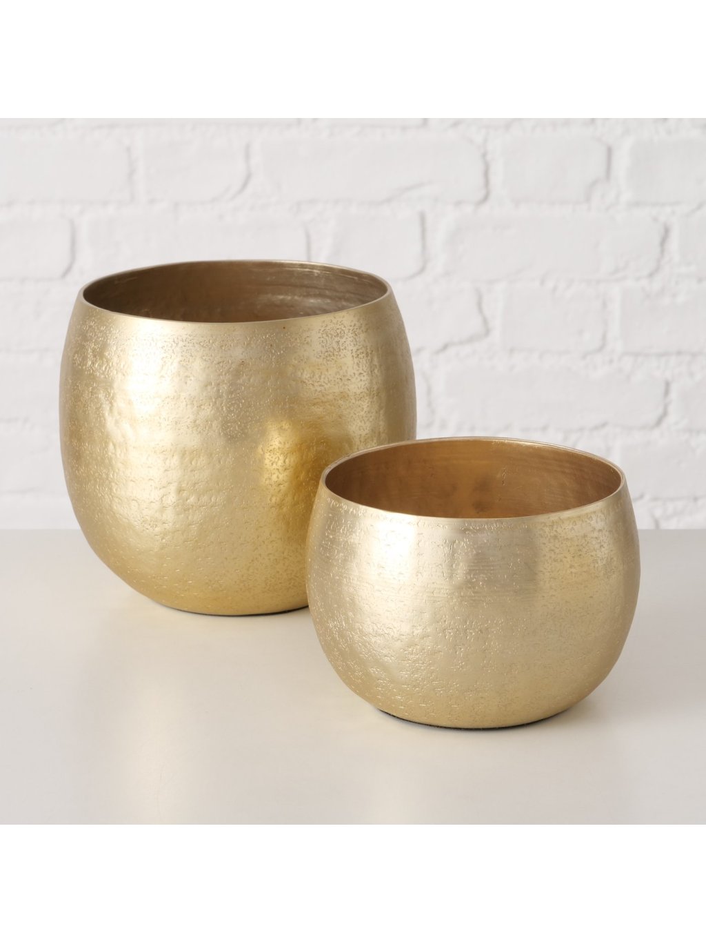 Každý z obalov je vyrobený z hliníka v zlatej farbe so štruktúrovaným povrchom, ktorý krásne odráža svetlo. Menší kvetináč sa hodí na drobné bylinky či sukulenty, väčší zas skvele doplní vyššiu rastlinu s jemnými listami. Ich okrúhly, čistý tvar sa ľahko kombinuje so všetkými štýlmi – od moderného až po boho alebo glamour interiér. Hoci nie sú určené do exteriéru, vo vašom dome vytvoria harmonické a štýlové zákutia, ktoré budú priťahovať pohľady.