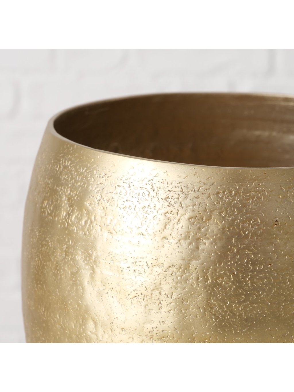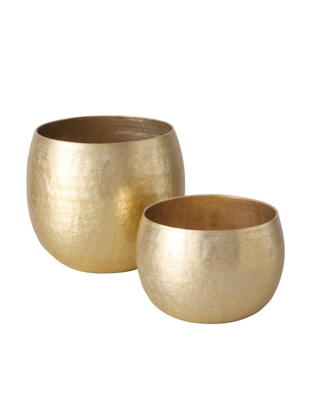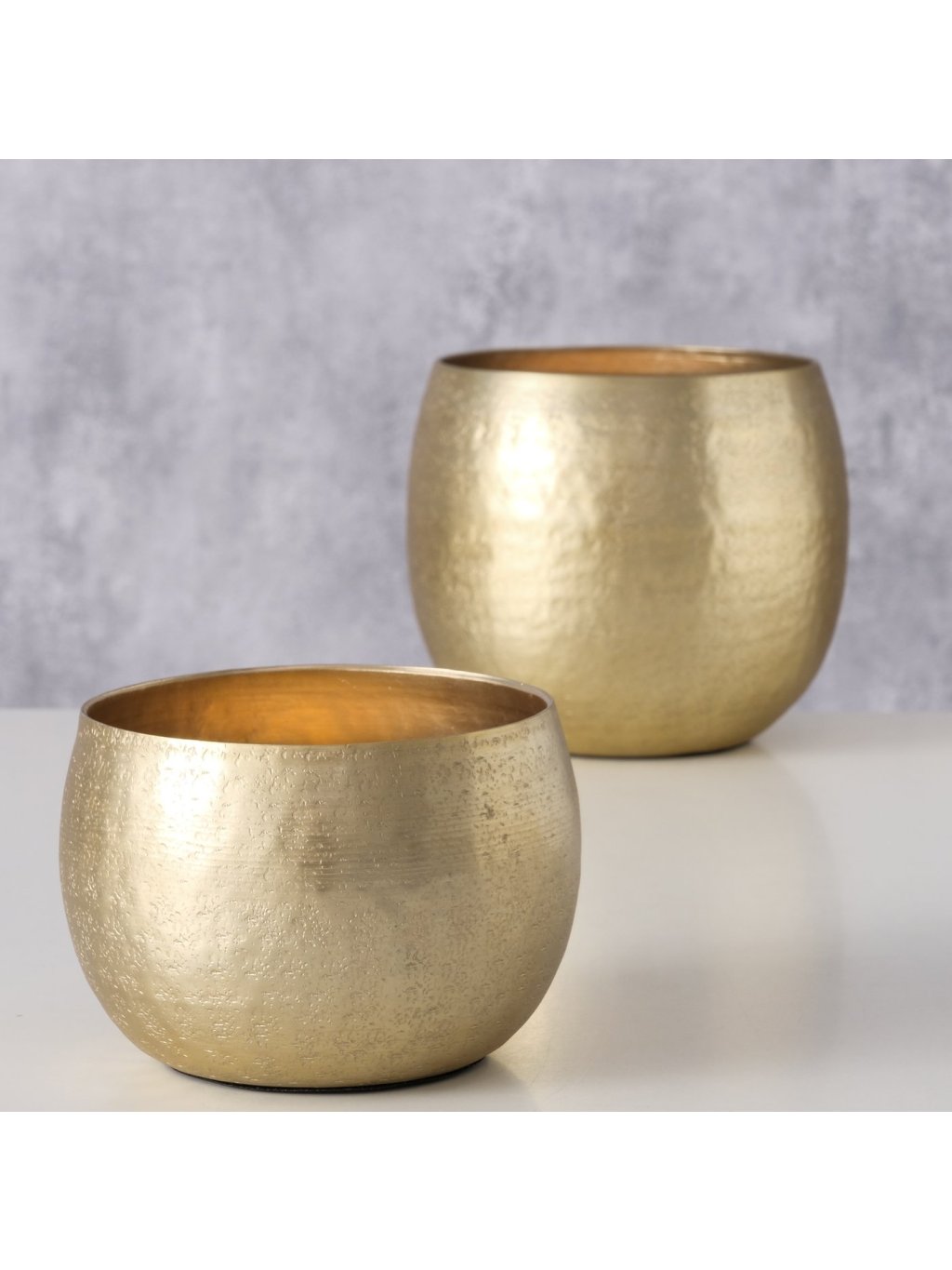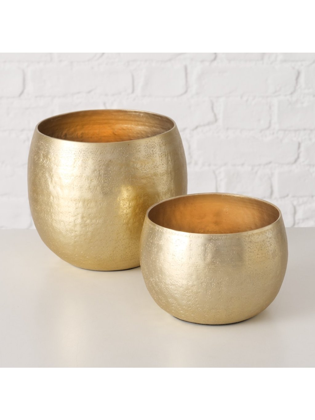 Každý z obalov je vyrobený z hliníka v zlatej farbe so štruktúrovaným povrchom, ktorý krásne odráža svetlo. Menší kvetináč sa hodí na drobné bylinky či sukulenty, väčší zas skvele doplní vyššiu rastlinu s jemnými listami. Ich okrúhly, čistý tvar sa ľahko kombinuje so všetkými štýlmi – od moderného až po boho alebo glamour interiér. Hoci nie sú určené do exteriéru, vo vašom dome vytvoria harmonické a štýlové zákutia, ktoré budú priťahovať pohľady.