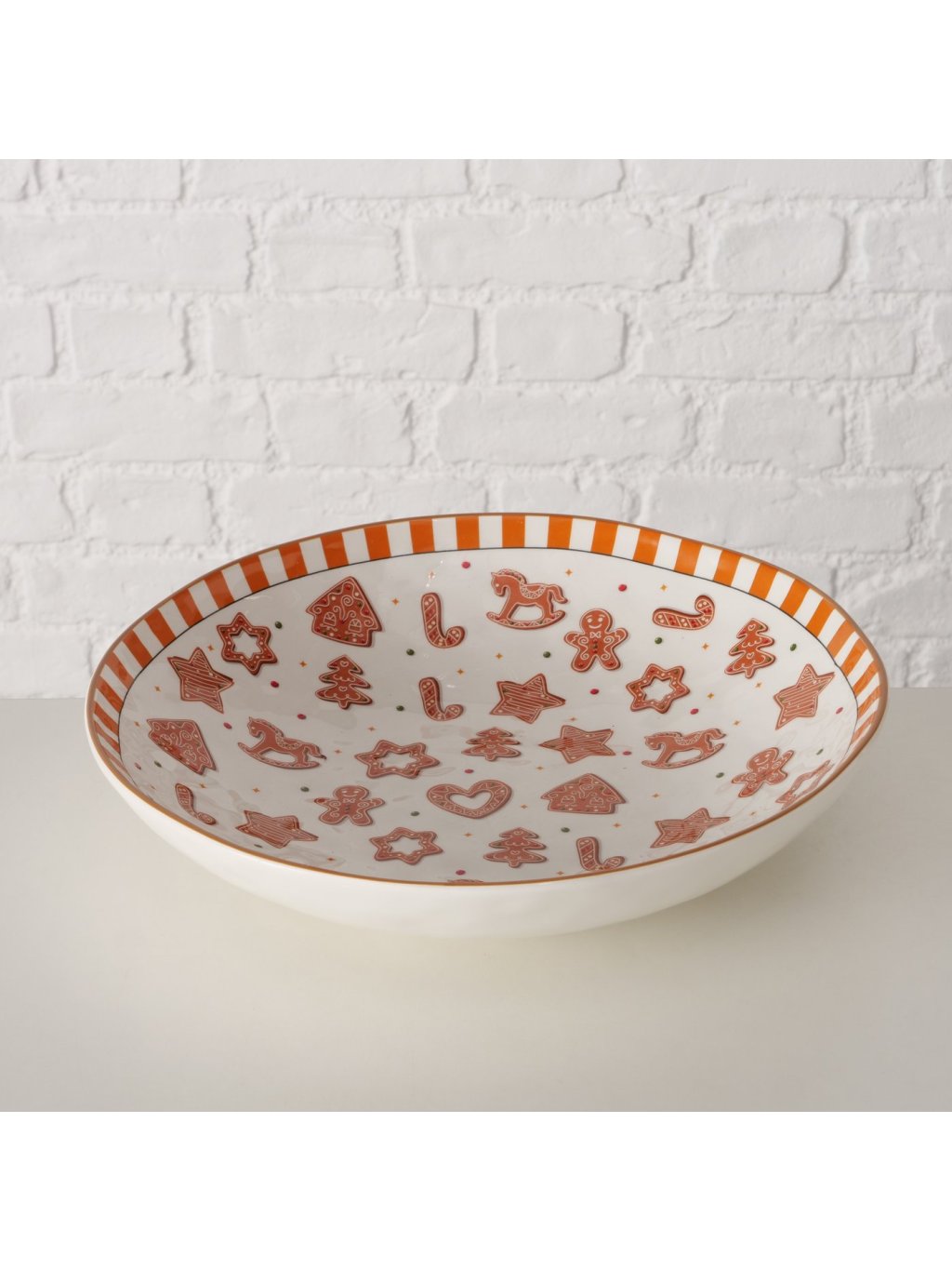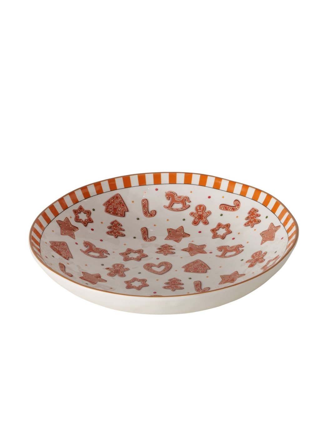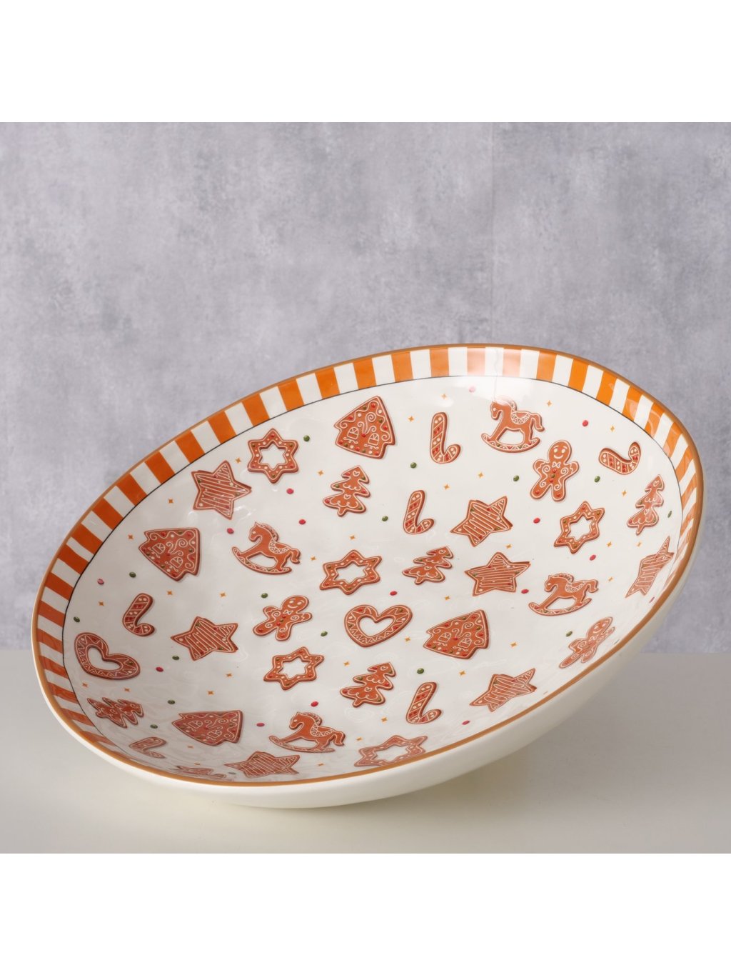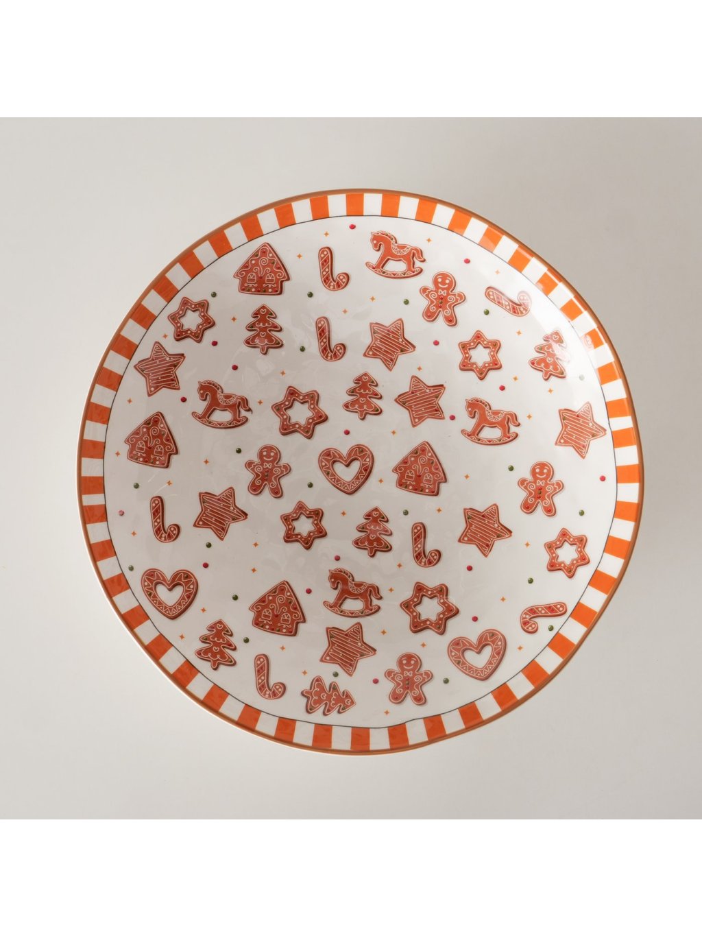 Veľká misa zo série Ginger prináša na váš stôl hravosť a útulnú vôňu Vianoc. Jej biely glazovaný povrch zdobia veselé perníkové motívy – hviezdičky, koníky, stromčeky či panáčik – doplnené o oranžovo-biele prúžky na okraji, ktoré pripomínajú cukrovú polevu.