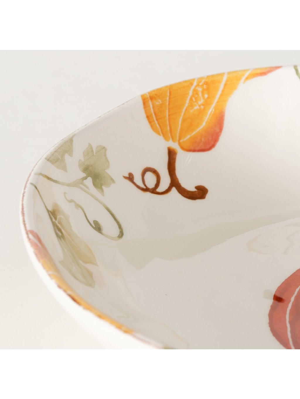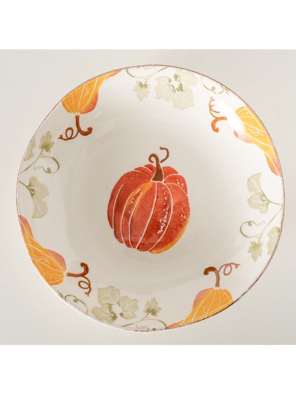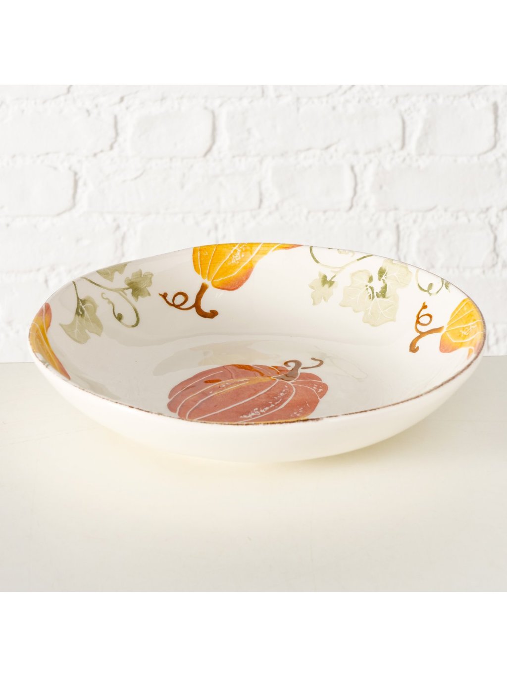 ✨ Táto misa je vyrobená z kvalitnej glazovanej keramiky (earthenware) a jej povrch zdobí ručne maľovaná farebná potlač s jesennými motívmi tekvíc a listov. Priemer 29,7cm a výška 6cm z nej robia ideálnu misu na servírovanie šalátov, ovocia či sviatočných dobrôt. Je vhodná na potraviny, môžete ju pohodlne umývať v umývačke riadu a jej lesklý povrch krásne zvýrazňuje farby, ktoré pôsobia živo a veselo.