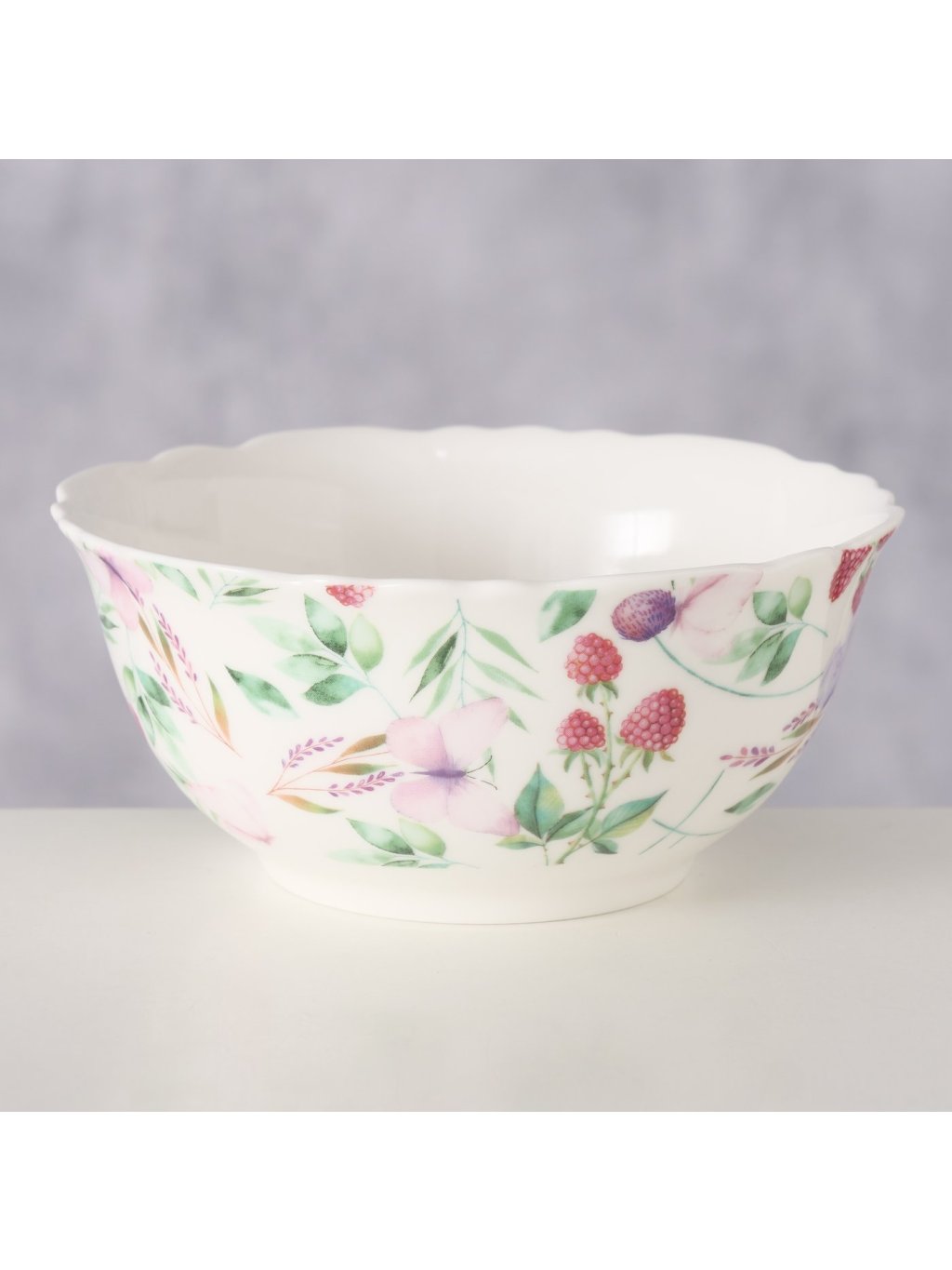 Je vyrobená z kvalitného New Bone porcelánu, ktorý je ľahký, no zároveň pevný a príjemný na každodenné používanie. Celoplošná botanická potlač v zelených a ružových tónoch dodáva miske jemný, romantický charakter. Vďaka objemu 450 ml je ideálna na müsli, jogurt s ovocím, kašu či menší šalát. Praktickým bonusom je, že je vhodná do umývačky riadu a samozrejme bezpečná na kontakt s potravinami.