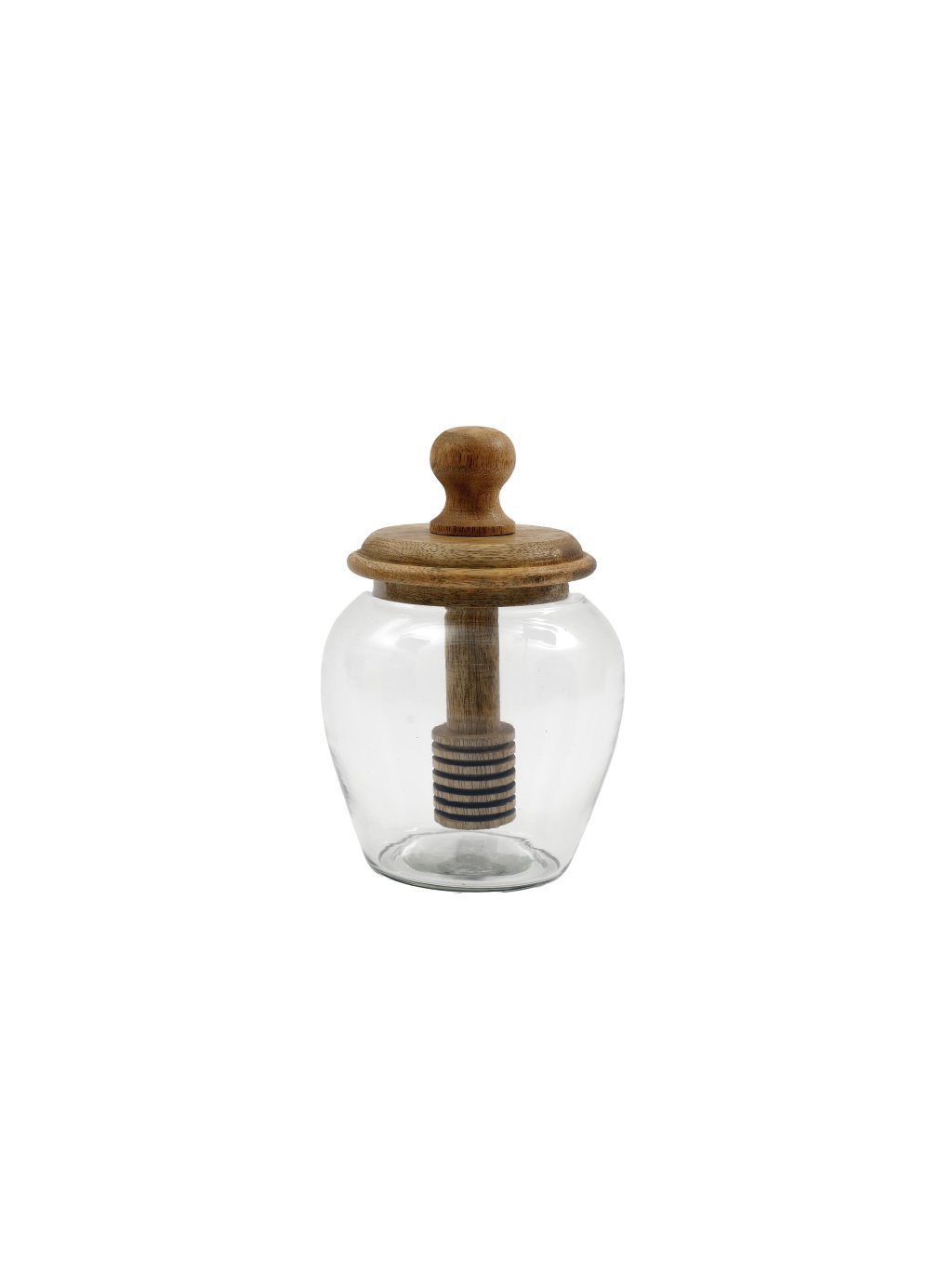 Elegantná dóza na med z číreho skla s vekom a naberačkou z mangového dreva je dokonalým spojením prírodného dizajnu a funkčnosti. Praktická drevená naberačka umožňuje jednoduché dávkovanie medu bez kvapkania, zatiaľ čo sklenené telo nádoby krásne zvýrazní jeho zlatistý odtieň.